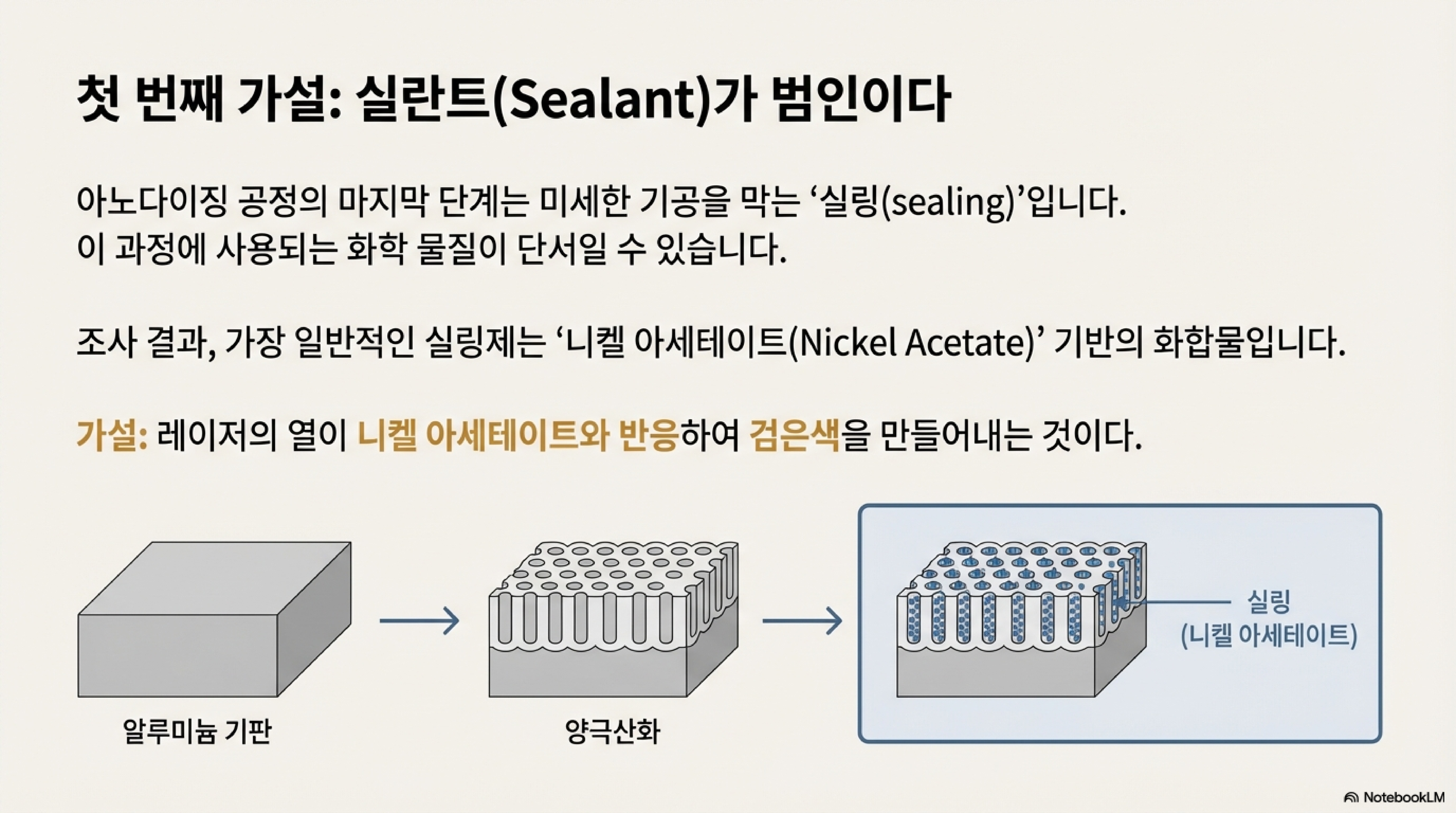 모든 조사는 하나의 그럴듯한 가설에서 시작되었습니다. 투명 아노다이징 알루미늄은 표면의 미세한 구멍을 막기 위해 실링(sealing) 처리를 거치는데, 이때 업계에서 널리 사용되는 화학물질이 바로 '니켈 아세테이트(nickel acetate)'입니다. 저의 초기 가설은 명쾌했습니다. 레이저의 강렬한 열이 이 니켈 아세테이트를 화학적으로 분해시켜 검은색의 산화니켈(nickel oxide)을 생성할 것이라는 논리적인 추론이었죠. 이 가설은 문제의 핵심을 꿰뚫는 듯 보였고, 저는 올바른 길을 가고 있다고 확신했습니다.
