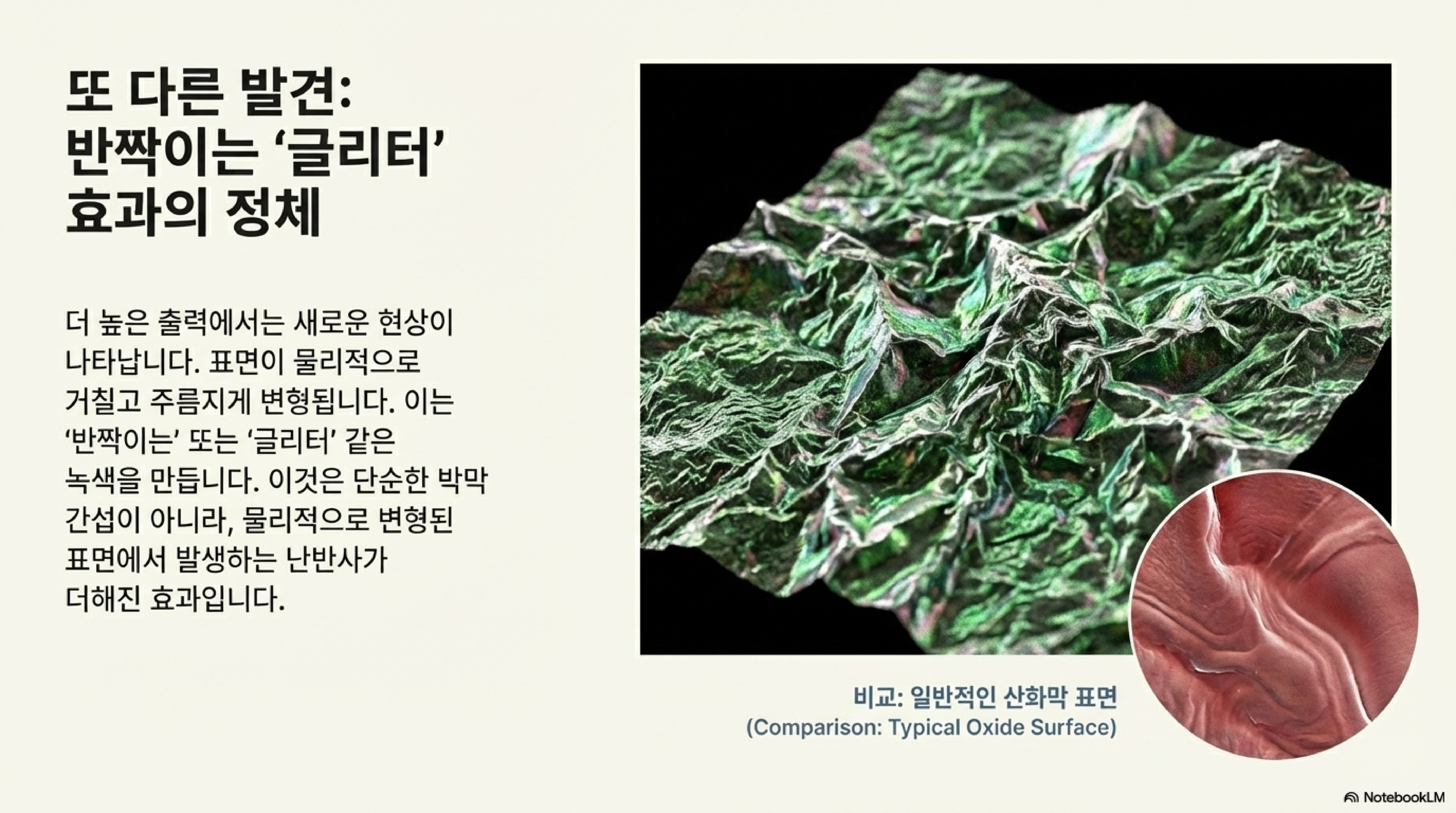 이 미세한 표면 구조는 비눗방울이나 물 위에 뜬 기름 막이 무지갯빛을 내는 것과 동일한 '얇은 막 간섭(thin-film interference)' 현상을 일으킵니다. 즉, 색은 물감처럼 칠해지는 것이 아니라, 표면의 미세한 구조에 의해 빛이 반사되고 간섭하며 '만들어지는' 것이었습니다.