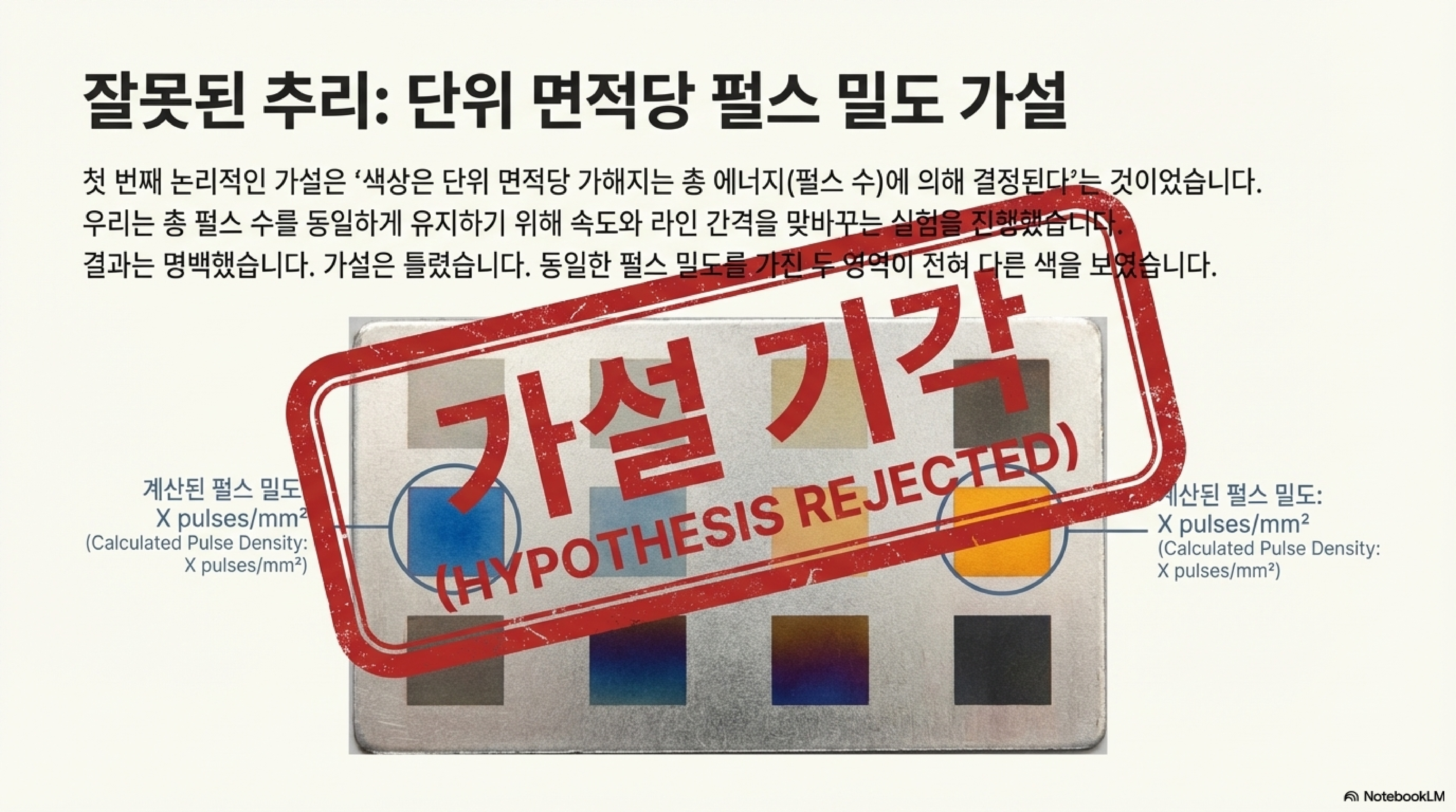 이 가설을 증명하기 위해 저희는 치밀한 실험을 설계했습니다. 레이저 속도를 2배로 높이는 대신 선 간격을 2배로 좁혀 단위 면적당 닿는 펄스 수를 정확히 동일하게 유지했습니다. 논리적으로는 같은 색이 나와야 했지만, 결과는 녹색, 파란색, 적갈색, 노란색 등 완전히 다른 색의 향연이었습니다. 저희의 가설은 눈앞에서 산산조각 났습니다.