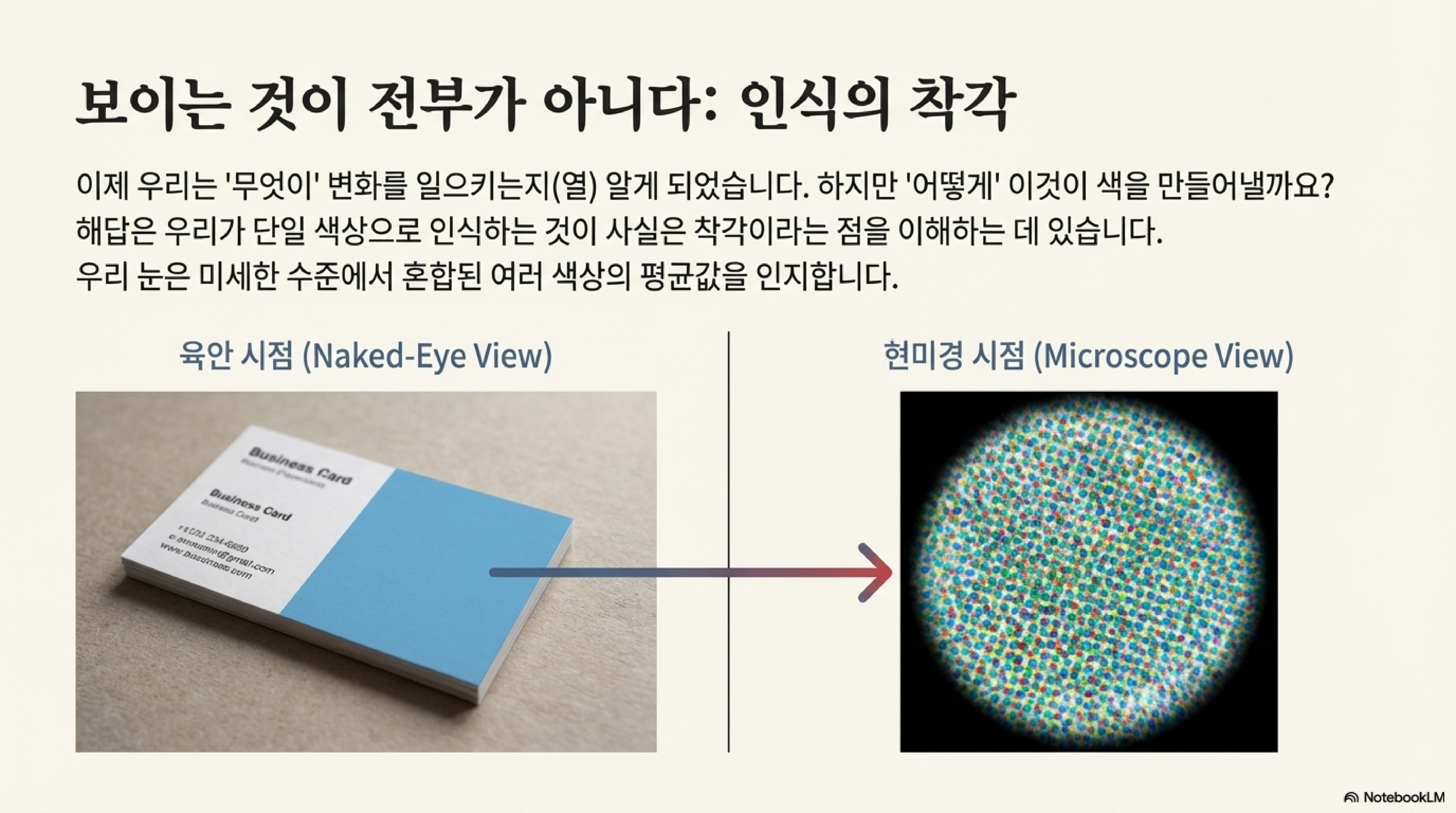 이는 파란색 명함을 확대했을 때 실제로는 빨강, 초록, 노랑 점들의 조합으로 이루어져 있는 것과 같은 원리입니다. 우리가 보는 단일한 색은 사실 '착시'에 가깝습니다. 우리의 눈과 뇌가 이 모든 미세한 시각 정보를 수집하여 평균을 낸 뒤, 하나의 일관된 색상으로 인식하는 것입니다. 우리가 최종적으로 보는 색은, 말하자면 **"우리 눈이 모든 빛의 뒤섞임을 하나로 뭉뚱그려 내놓은 최종 결론"**인 셈입니다. 우리가 보는 색은 물리적 실체라기보다는, 우리의 뇌가 재구성한 결과물이었던 것입니다.