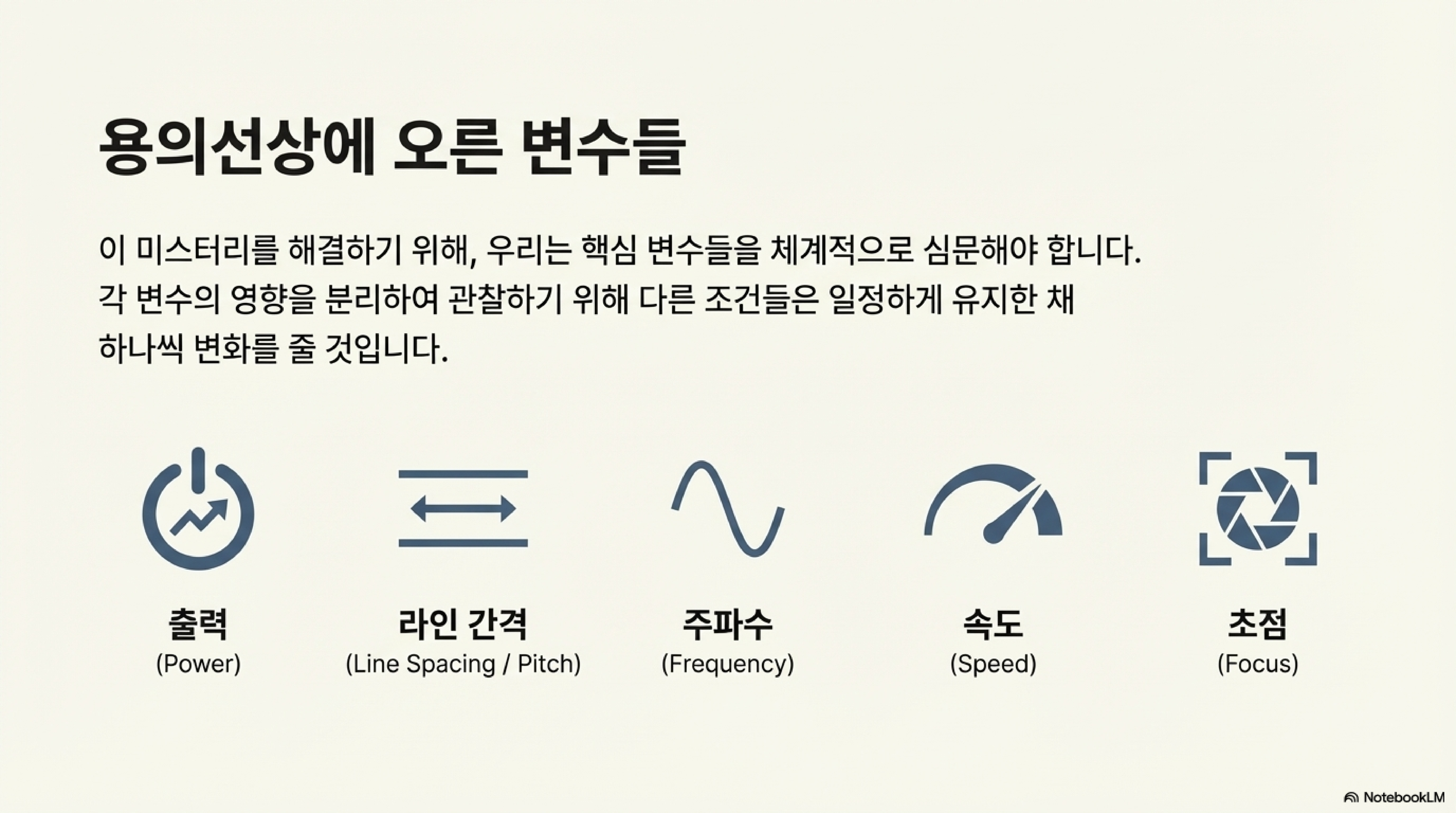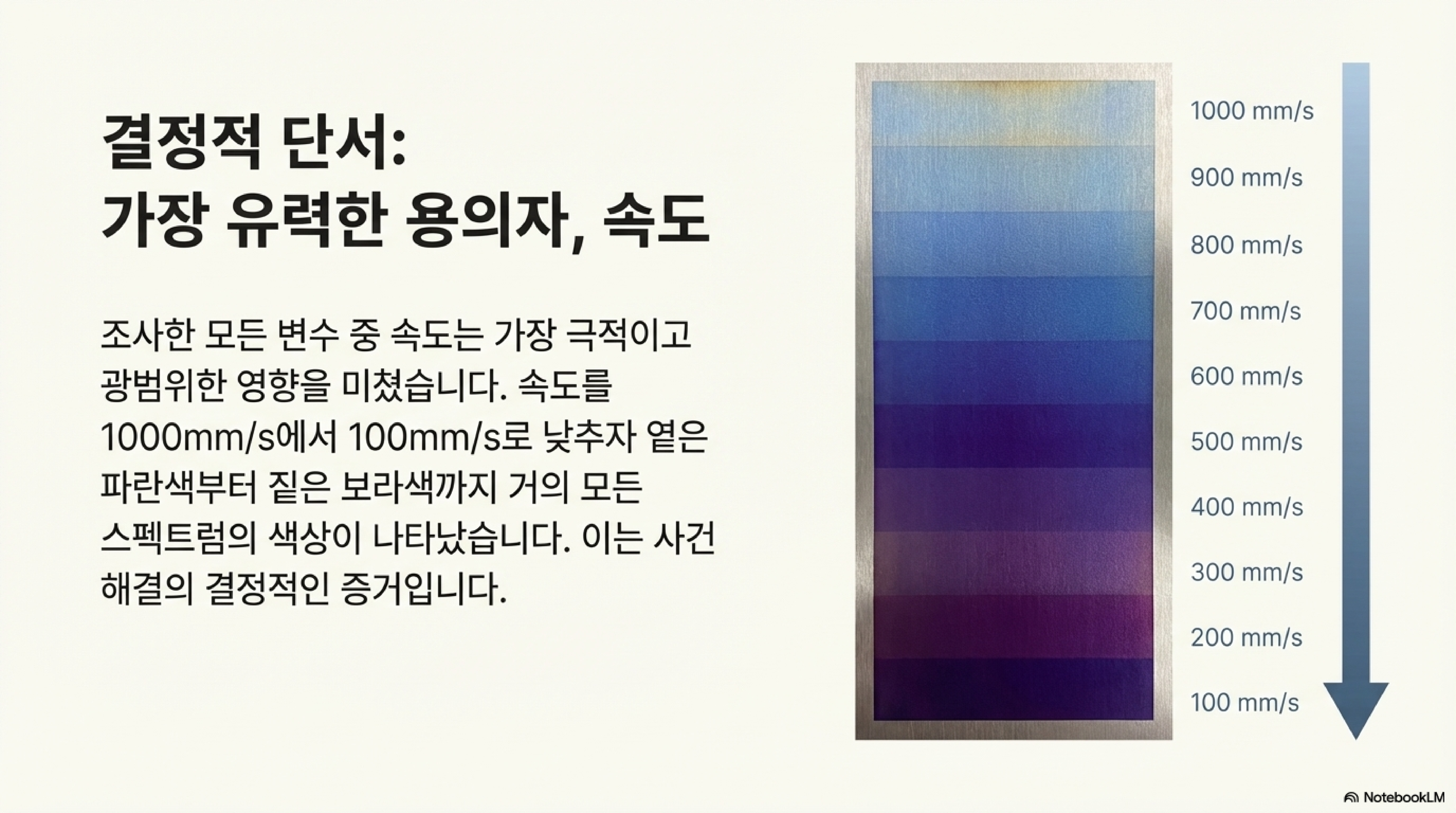 결론적으로 색상 변화를 일으키는 핵심 원인은 단순히 레이저가 지나가는 속도가 아니었습니다. 바로 그 속도 차이로 인해 발생하는 '열 축적량의 차이'가 진짜 비밀이었던 것입니다.