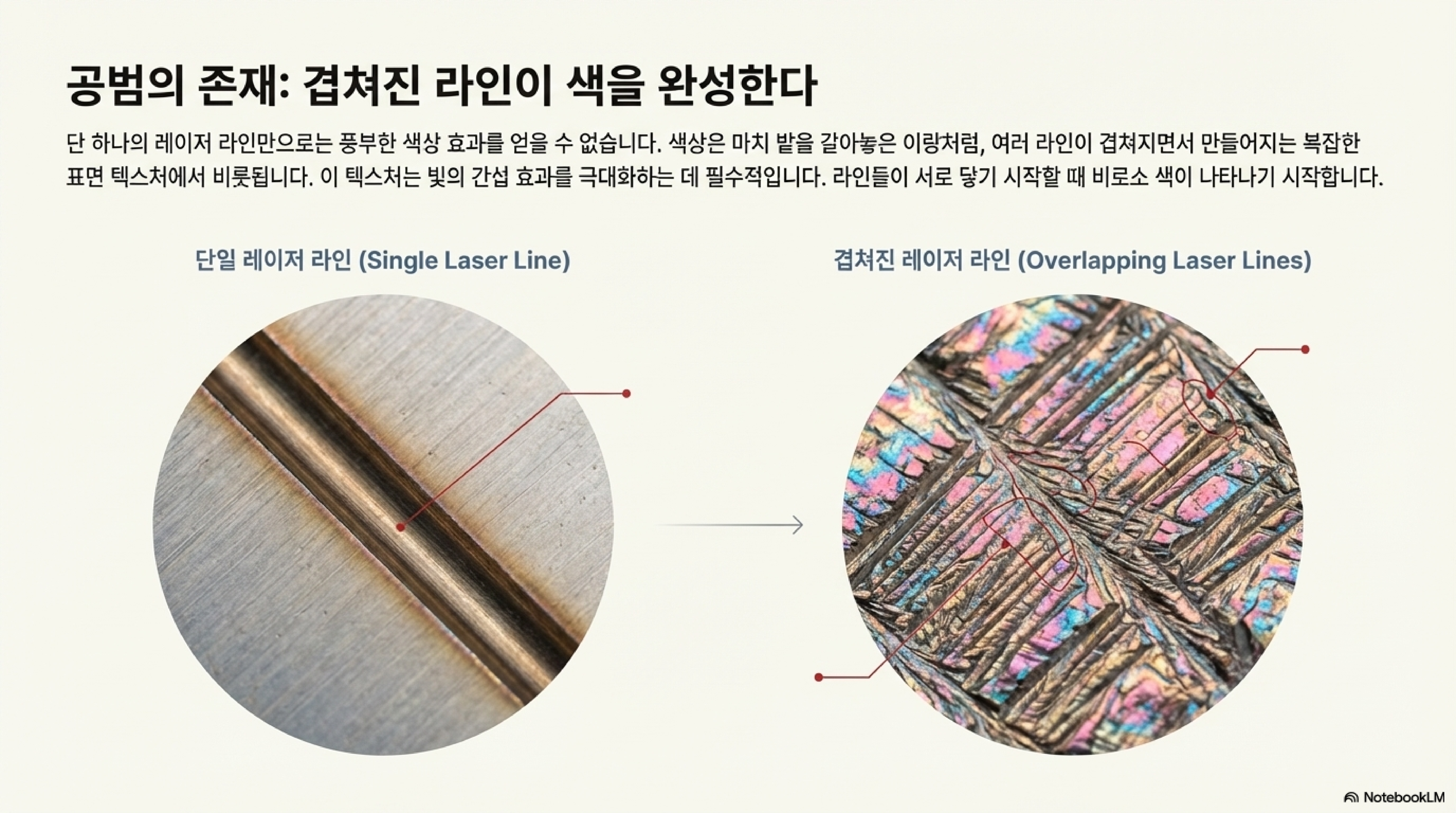 색상이 나타나기 시작하는 조건은 바로 레이저 선들이 서로 '겹치기 시작할 때'였습니다. 이 현상을 상상해 보십시오. 완벽하게 평평하고 거울 같던 밭이 있습니다. 이제 그 위를 아주 미세한 쟁기로 갈아 골과 이랑을 만든다고 생각해 보세요. 더 이상 단순한 거울이 아닙니다. 이 '쟁기질 된 밭(plowed field effect)'에 부딪힌 빛은 골과 이랑에서 서로 다른 각도로 반사되며 스스로와 간섭하기 시작합니다. 이것이 바로 겹쳐진 레이저 선들이 나노미터 규모에서 만들어내는 현상입니다.