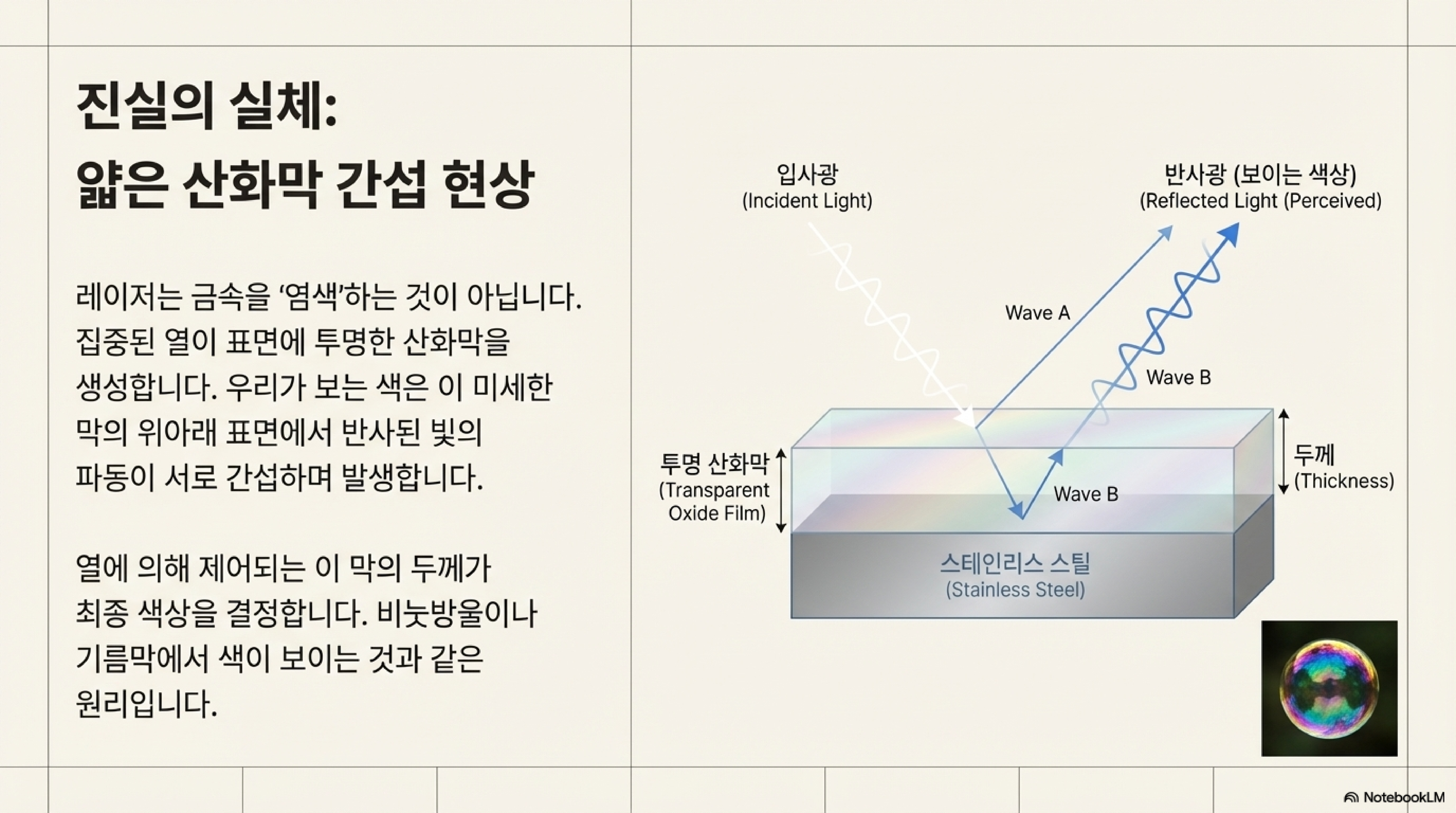 한 실험에서는 스테인리스 스틸 표면에 있던 눈에 보이지 않는 얇은 기름 막이 예상치 못한 무지갯빛을 만들어냈습니다. 이 막을 깨끗이 닦아낸 후에야 비로소 제대로 된 실험을 진행할 수 있었습니다. 얇은 막 간섭 현상은 빛의 파장 자체인 나노미터 단위에서 작동합니다. 분자 몇 개 두께의 보이지 않는 기름 막조차 빛이 반사되는 방식을 완전히 바꾸고, 우리가 인식하는 색을 뒤바꾸기에 충분했던 것입니다.