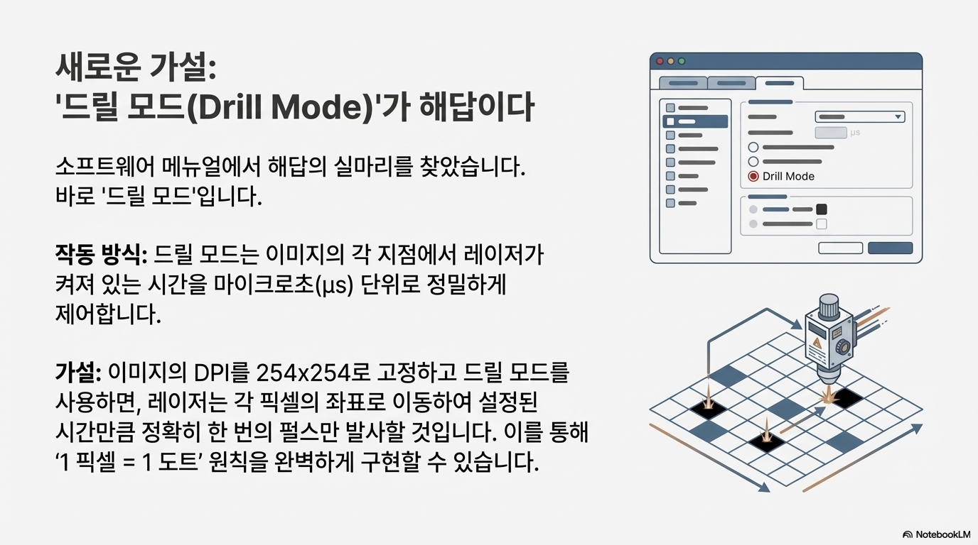 문제 해결의 결정적인 전환점은 소프트웨어 한구석에서 우연히 발견한 '드릴 모드(Drill Mode)'라는 기능이었습니다. 기존의 스캔 방식은 픽셀을 따라 '선을 긋는' 방식이었고, 이것이 바로 겹침과 번짐 문제의 핵심 원인이었습니다. 드릴 모드는 완전히 다른 접근법을 제시하는 듯했습니다.