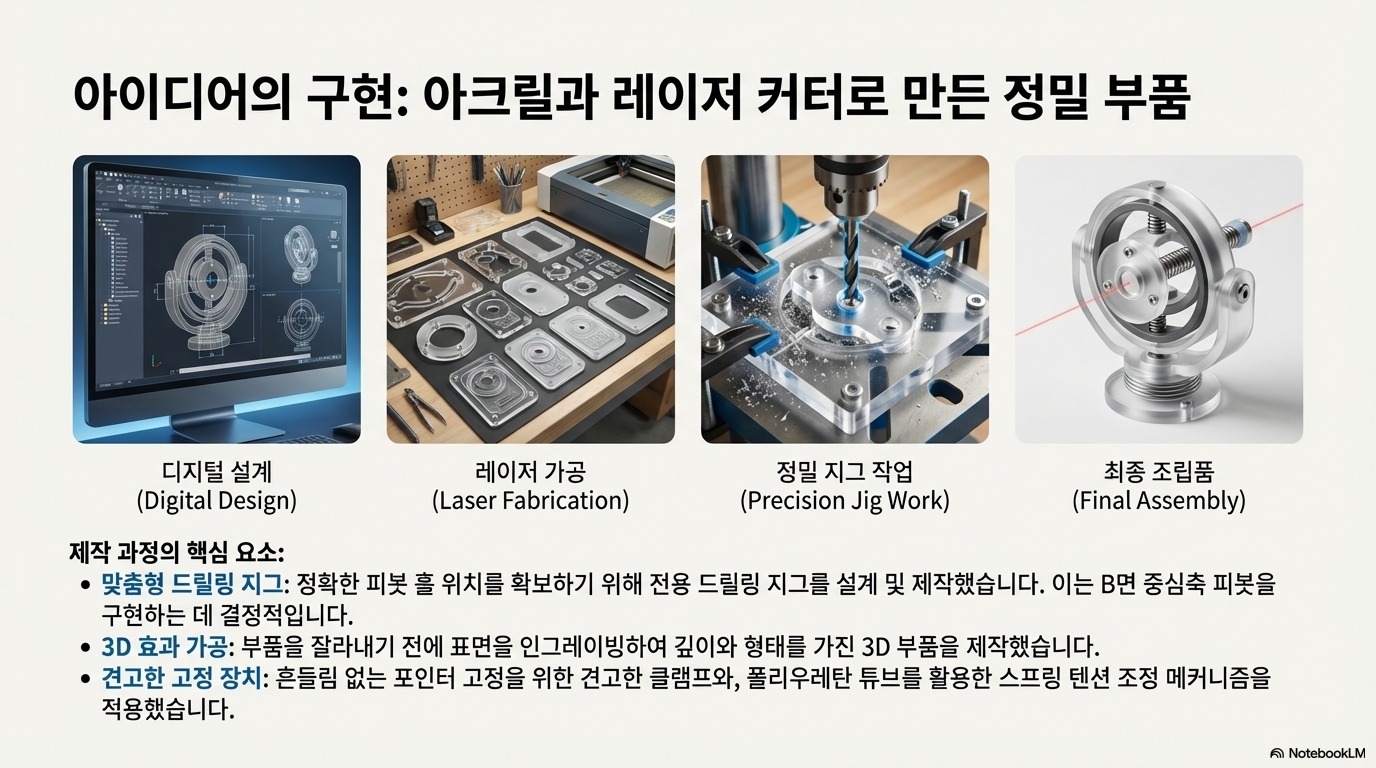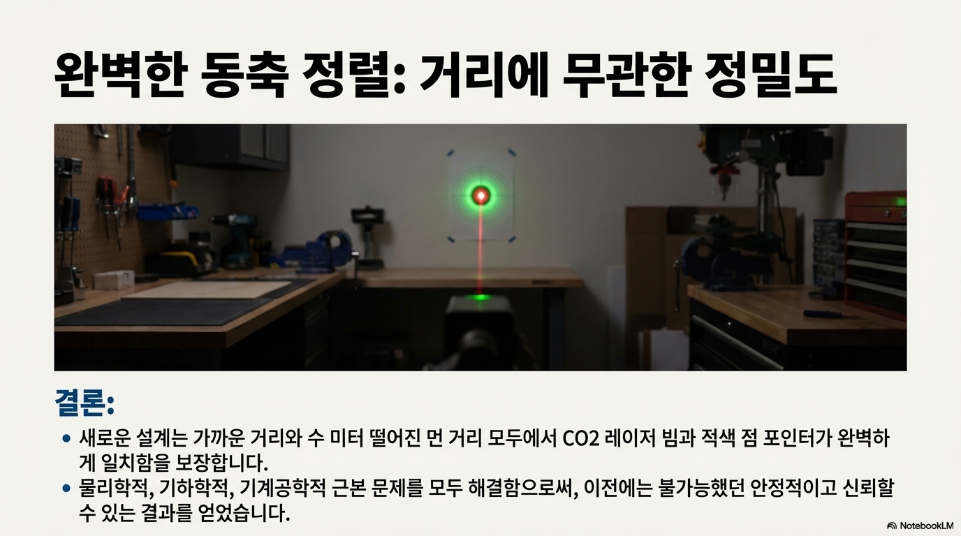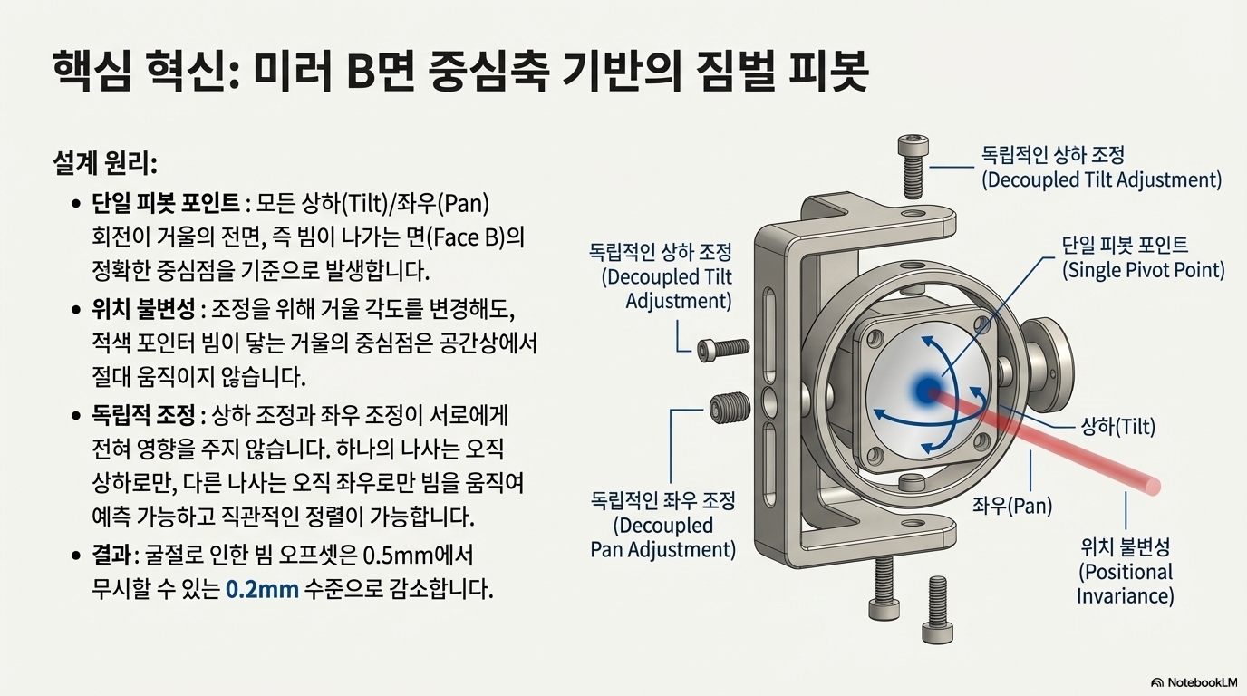 반면, 재설계된 짐벌(gimbal) 시스템은 두 개의 간단하고 독립적인 조정을 통해 고정된 중심점을 기준으로 거울의 기울기와 회전을 제어합니다. 이로써 레드닷이 항상 거울의 중심에 머무르게 하고, 거울의 중심점은 항상 공간상에 고정되도록 보장합니다. 이 단 하나의 설계 원칙이 모든 것을 바꿨습니다. 고정된 중심점 덕분에 0.2mm에 불과한 스넬의 법칙 오차를 보정하는 것은 사소한 작업이 되었고, 빔이 항상 중앙에 위치하므로 클리핑의 위험(핵심 발견 1)이 원천적으로 사라졌습니다. 복잡하고 좌절스러웠던 정렬 작업은 완벽한 동축 빔을 만들어내는 두 번의 간단한 조정으로 바뀌게 된 것입니다.