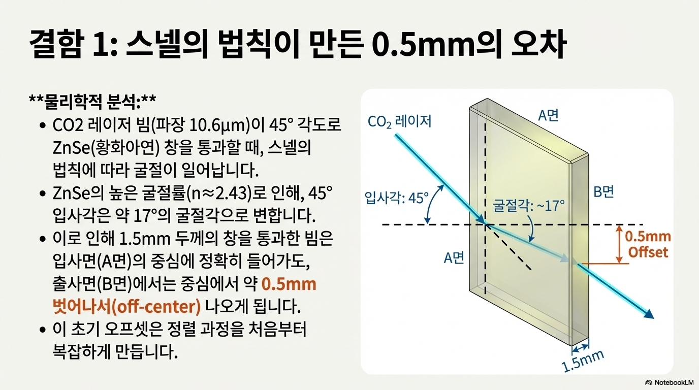 이것이 실제로 미치는 영향은 다음과 같습니다. 레이저 빔은 창의 뒷면 중심부로 정확히 들어가지만, 굴절 현상 때문에 앞면으로 나올 때는 중심에서 약간 벗어납니다. 45도 각도의 경우 이 오프셋은 약 0.5mm에 달합니다. 하지만 재설계된 70도 마운트(20도 기울기)에서는 이 오프셋이 불과 0.2mm로 줄어듭니다. 이는 새로운 설계의 우수성을 보여주는 강력한 정량적 증거입니다.
