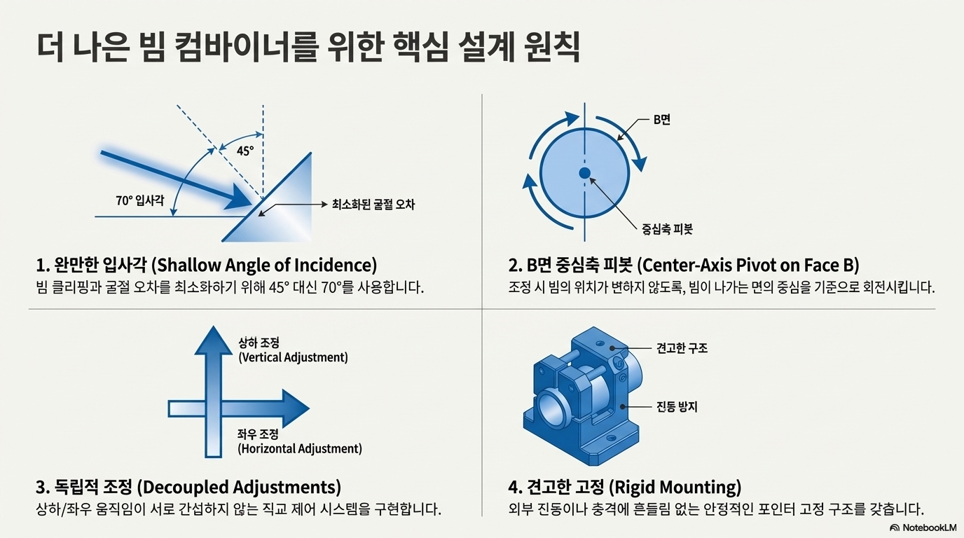 기존의 결함 있는 설계에서는 거울의 각도를 조정하면 공간상에서 거울의 위치 자체도 함께 움직였습니다. 이는 하나의 조정을 할 때마다 이전의 모든 조정이 틀어지는 악순환을 의미합니다.