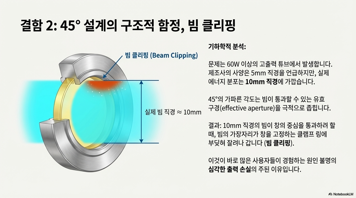 이 설계가 야기하는 가장 큰 문제는 '빔 클리핑(beam clipping)'입니다. 제조사는 빔 직경이 5mm라고 주장하지만, 실제 필드 테스트에서 전문가의 70W 튜브와 고객의 80W 튜브는 모두 10mm에 달하는 빔 직경을 보였습니다. 빔을 45도라는 가파른 각도로 통과시키면, 이 넓은 빔이 창을 고정하는 클램프 링의 가장자리에 걸려 잘려나갈 위험이 커집니다. 이는 빔이 첫 번째 거울에 도달하기도 전에 상당한 출력 손실을 유발하는 원인이 됩니다.
