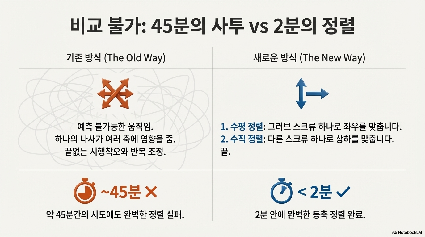 이 전문가는 결함 있는 시스템을 정렬하기 위해 45분 가까이 씨름했지만, 결국 동축 빔을 완벽하게 맞추는 데 실패했습니다. 이는 잘못 설계된 시스템을 조정하려는 노력이 얼마나 헛된지를 명확히 보여줍니다.