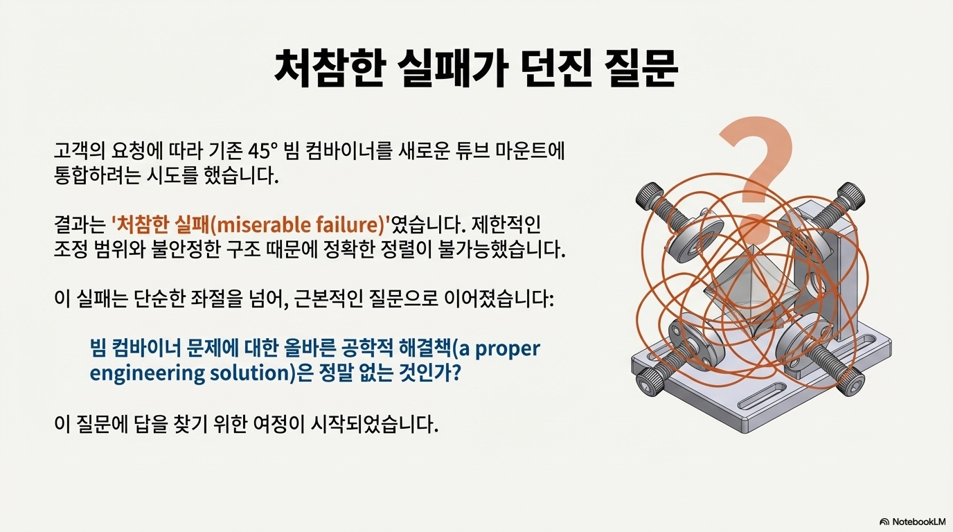여기 풍부한 경험을 가진 한 전문가가 있습니다. 그는 시중에서 판매되는 표준 빔 컴바이너를 설치하려다 "참담하게 실패"하고 맙니다. 하지만 메이커에게 실패란 새로운 도전의 시작일 뿐입니다. 그는 이 경험을 계기로, 마치 '양털 뭉치와 뜨개질바늘 두 개만 가지고 비행기에서 뛰어내리는' 심정으로 근본적으로 결함이 있는 설계를 진단하고 제1원칙에서부터 올바른 해결책을 재설계하는 여정을 시작합니다.