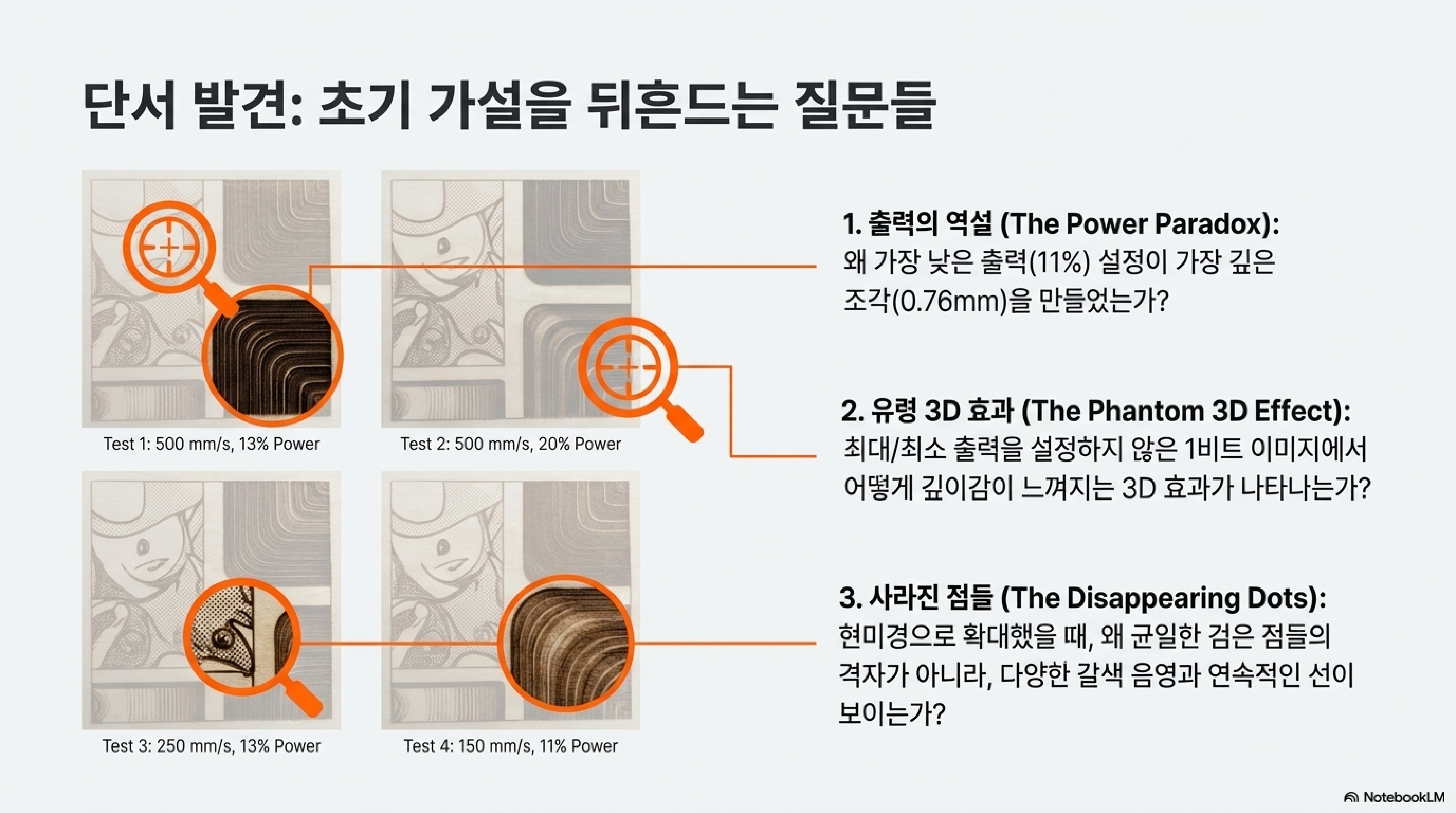 이러한 원리를 바탕으로 진행된 여러 실험은 매우 흥미로운, 그리고 직관에 반하는 결론에 도달했습니다. 다양한 속도와 파워 조합으로 테스트한 결과, 가장 낮은 파워(11%)와 가장 느린 속도(150mm/s)의 조합이 "단연코 최고의" 결과물을 만들어냈습니다.