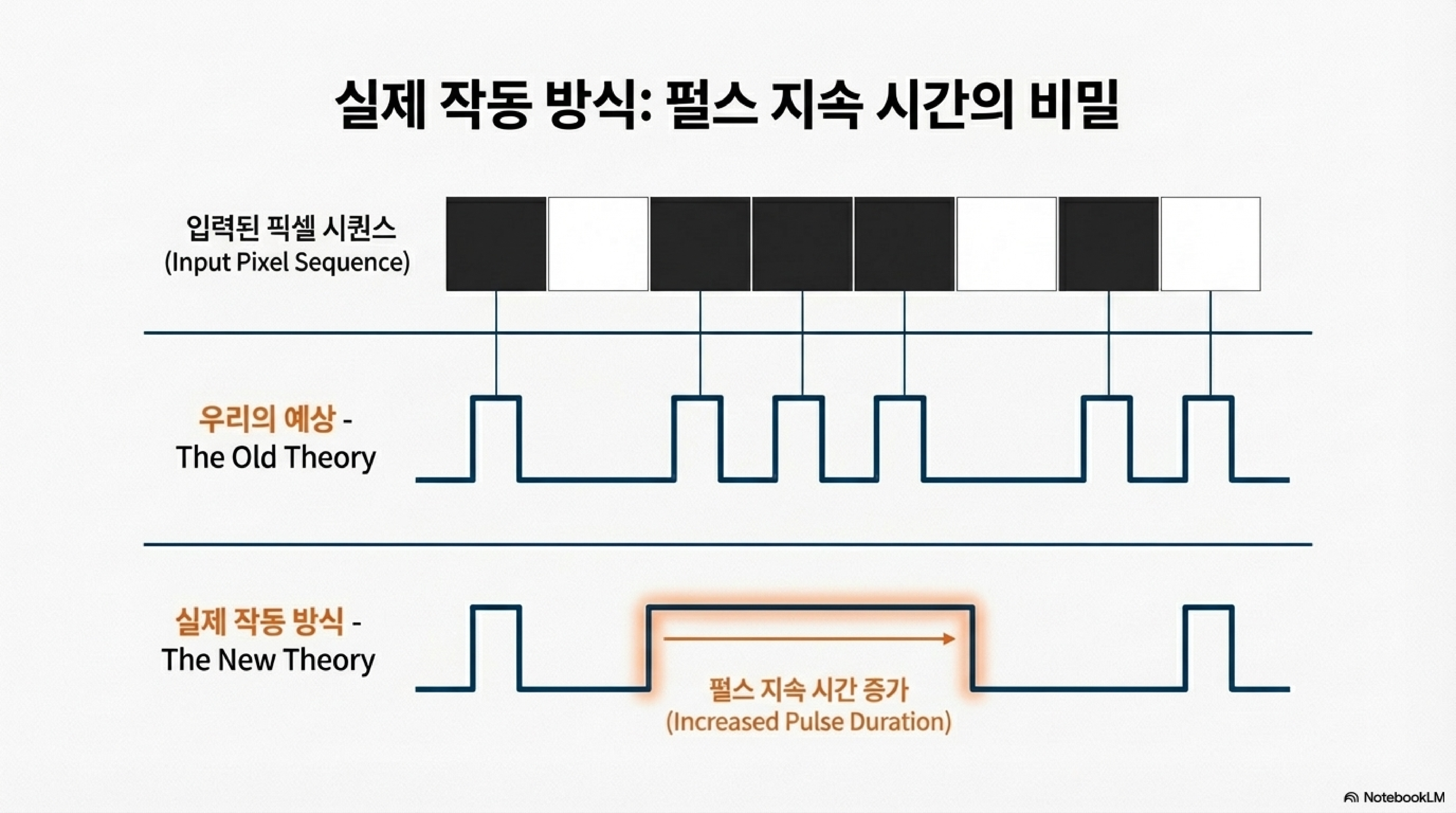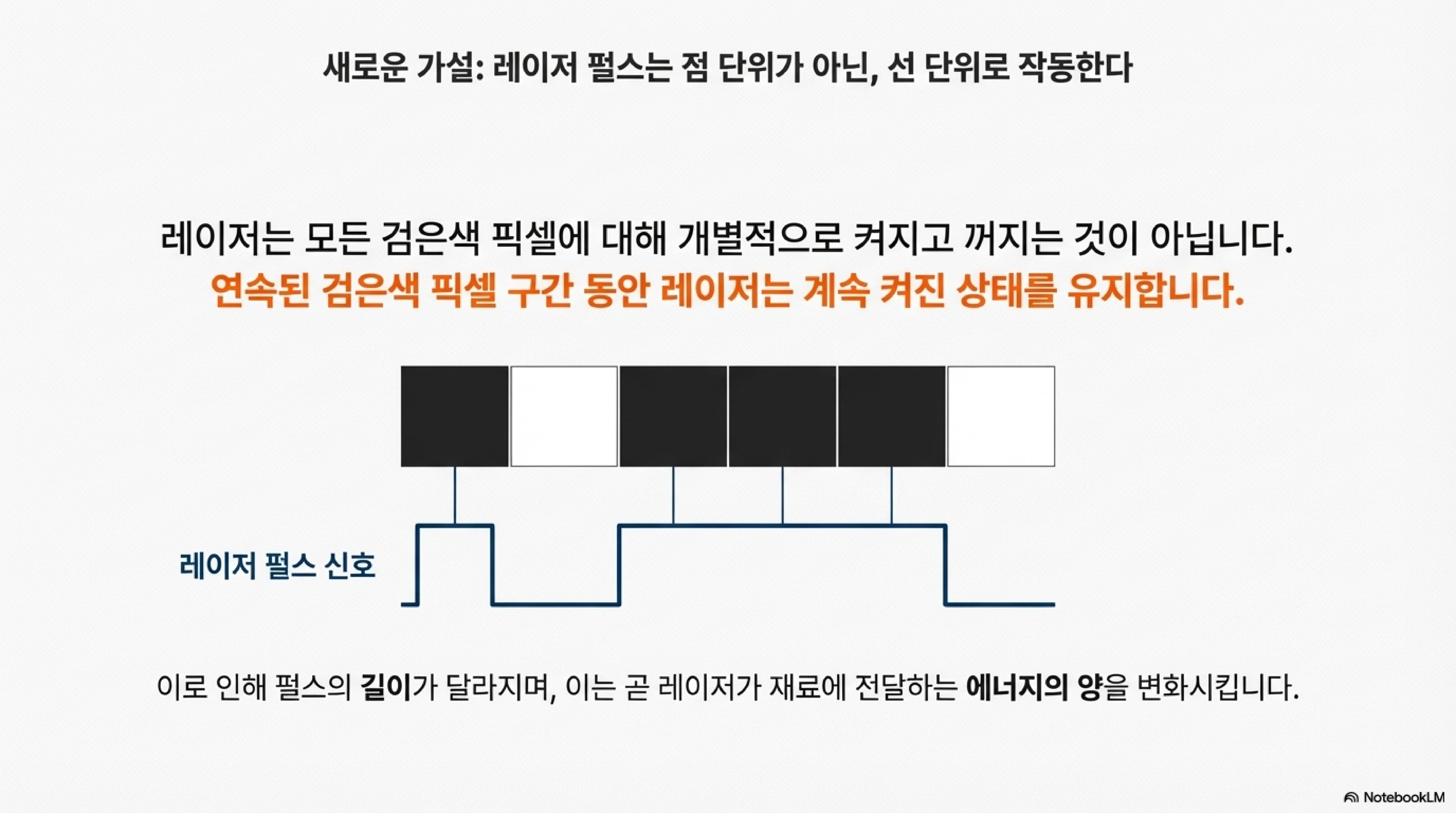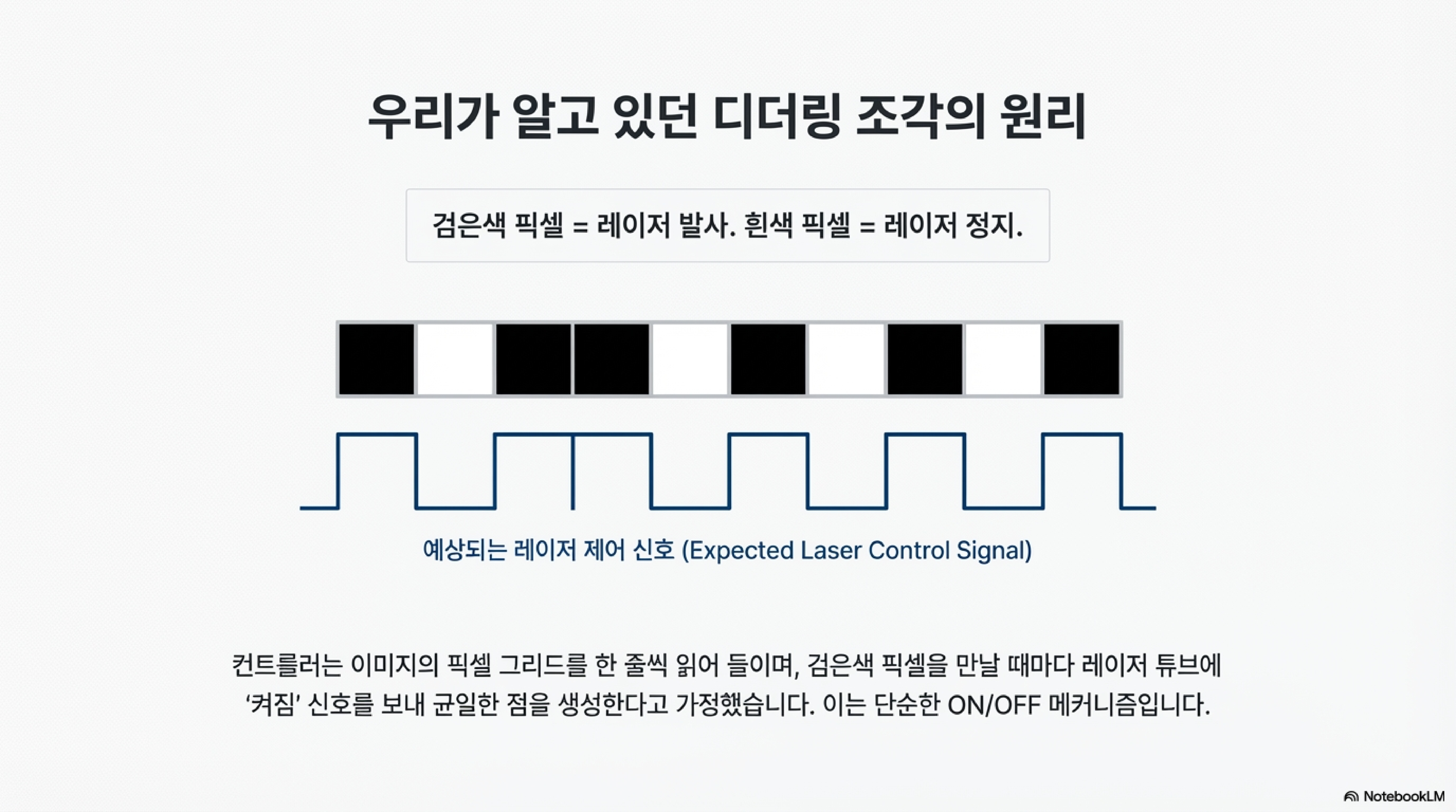 현장에서 발견된 증거는 우리의 상식을 배신했습니다. 현미경으로 관찰한 결과, 레이저는 개별적인 점을 찍는 것이 아니었습니다. 기존의 가설은 검은 픽셀 하나하나가 레이저의 개별적인 'ON' 신호에 해당하고, 흰 픽셀은 'OFF' 신호에 해당한다는 것이었습니다. 하지만 진실은 달랐습니다. 레이저는 연속된 검은 픽셀들을 하나의 긴 'ON' 신호로 처리하고 있었습니다. 즉, 검은 픽셀 세 개가 연달아 있다면 레이저는 "점, 점, 점" 하고 세 번 켜지는 것이 아니라, "주욱—" 하고 한 번 길게 켜진 상태를 유지했던 것입니다. 이 간단해 보이는 차이가 모든 미스터리를 푸는 핵심 열쇠였습니다.