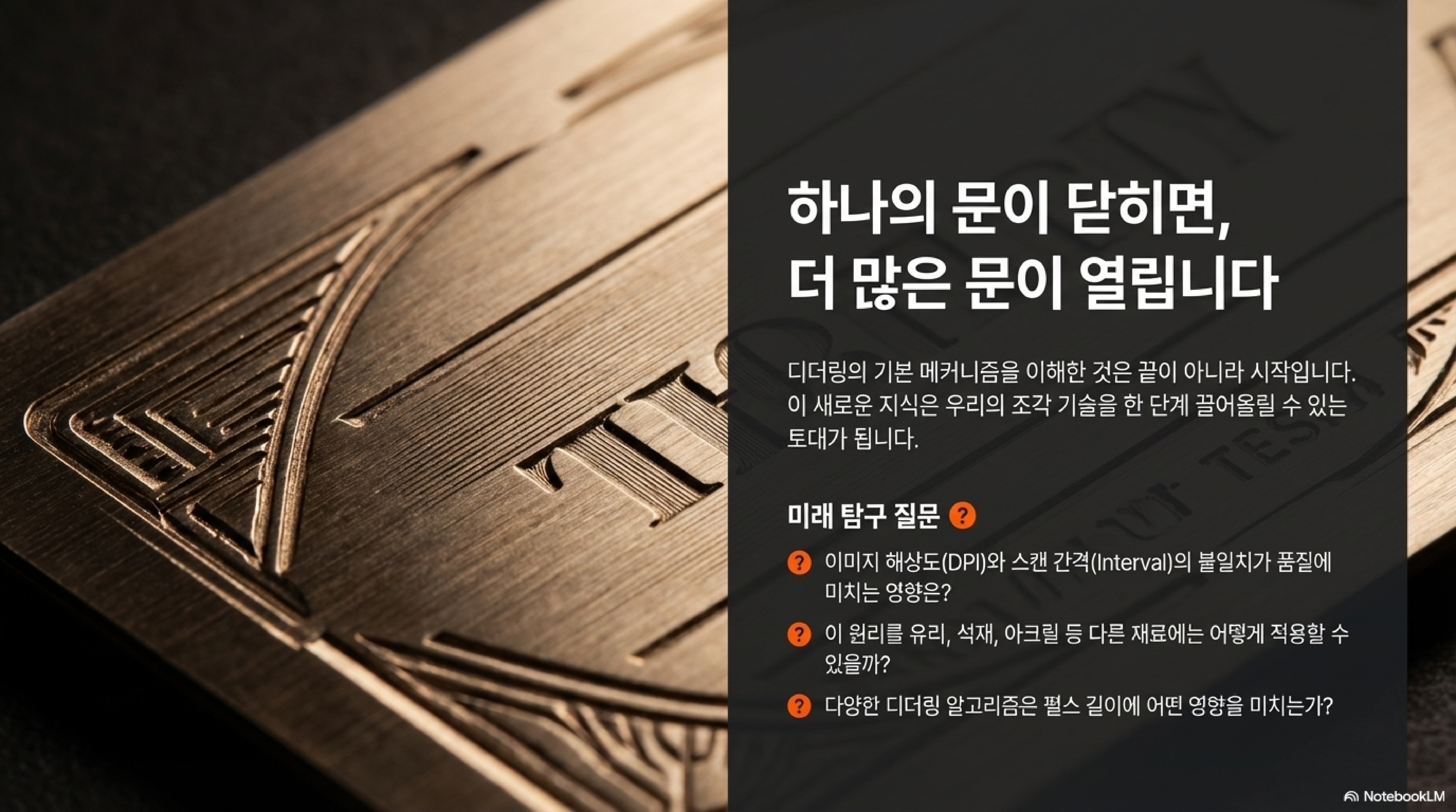 레이저 각인, 특히 디더링(dithering) 기법으로 처리된 이미지의 작동 원리는 매우 직관적으로 보입니다. 컴퓨터 화면의 검은 점은 레이저가 '켜지는' 신호, 흰 점은 '꺼지는' 신호. 이 디지털 신호들이 모여 우리가 원하는 이미지를 재료 위에 태워내는 것, 이것이 우리가 가진 일반적인 상식일 것입니다.