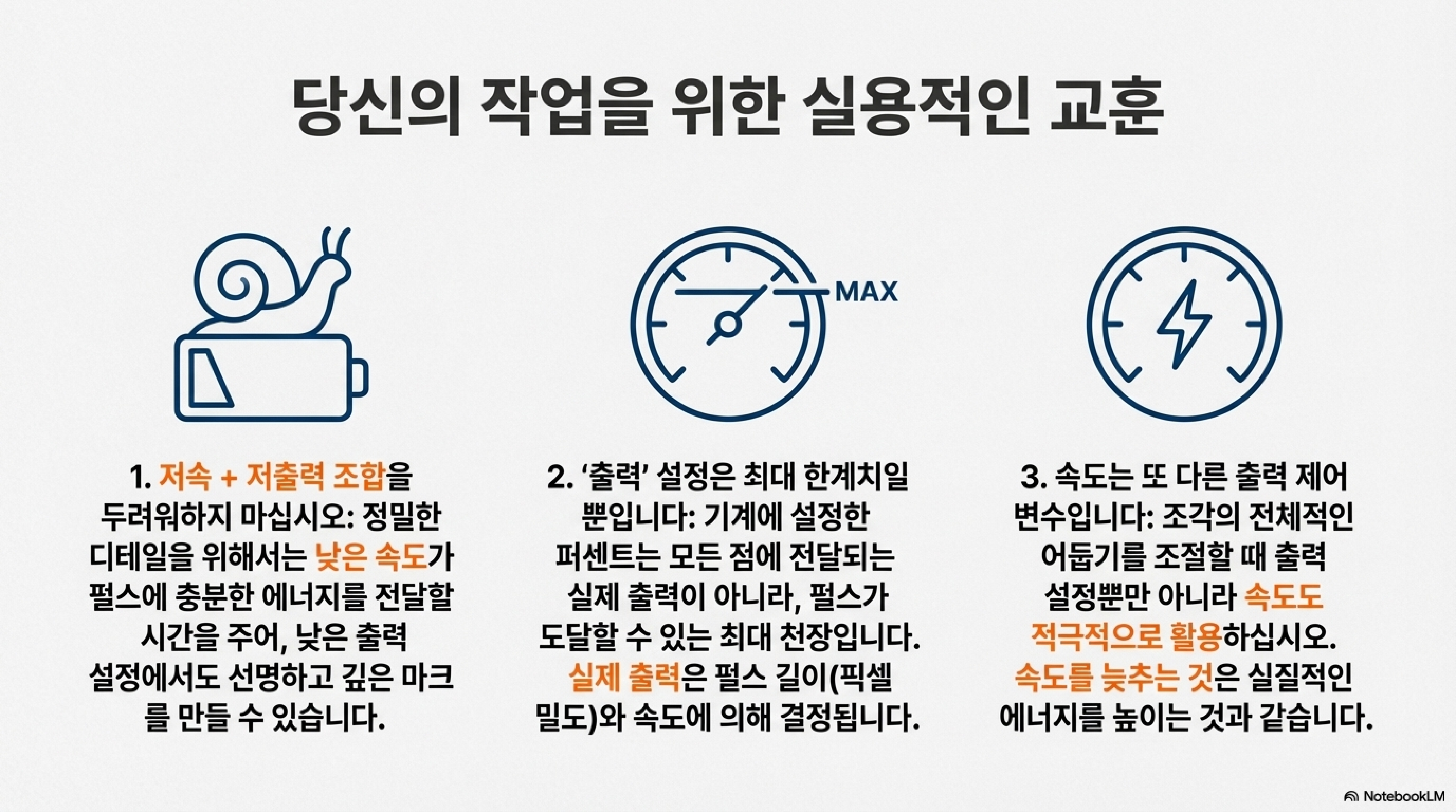 그 이유는 앞서 설명한 '파워 램프업 시간' 개념에 있습니다. 속도를 늦추면 레이저 헤드가 각 지점에 더 오래 머물게 됩니다. 이는 낮은 파워 설정에서도 레이저가 최대 잠재력에 도달할 충분한 시간을 확보하게 해주어, 결과적으로 더 깊고 선명한 각인을 가능하게 한 것입니다.