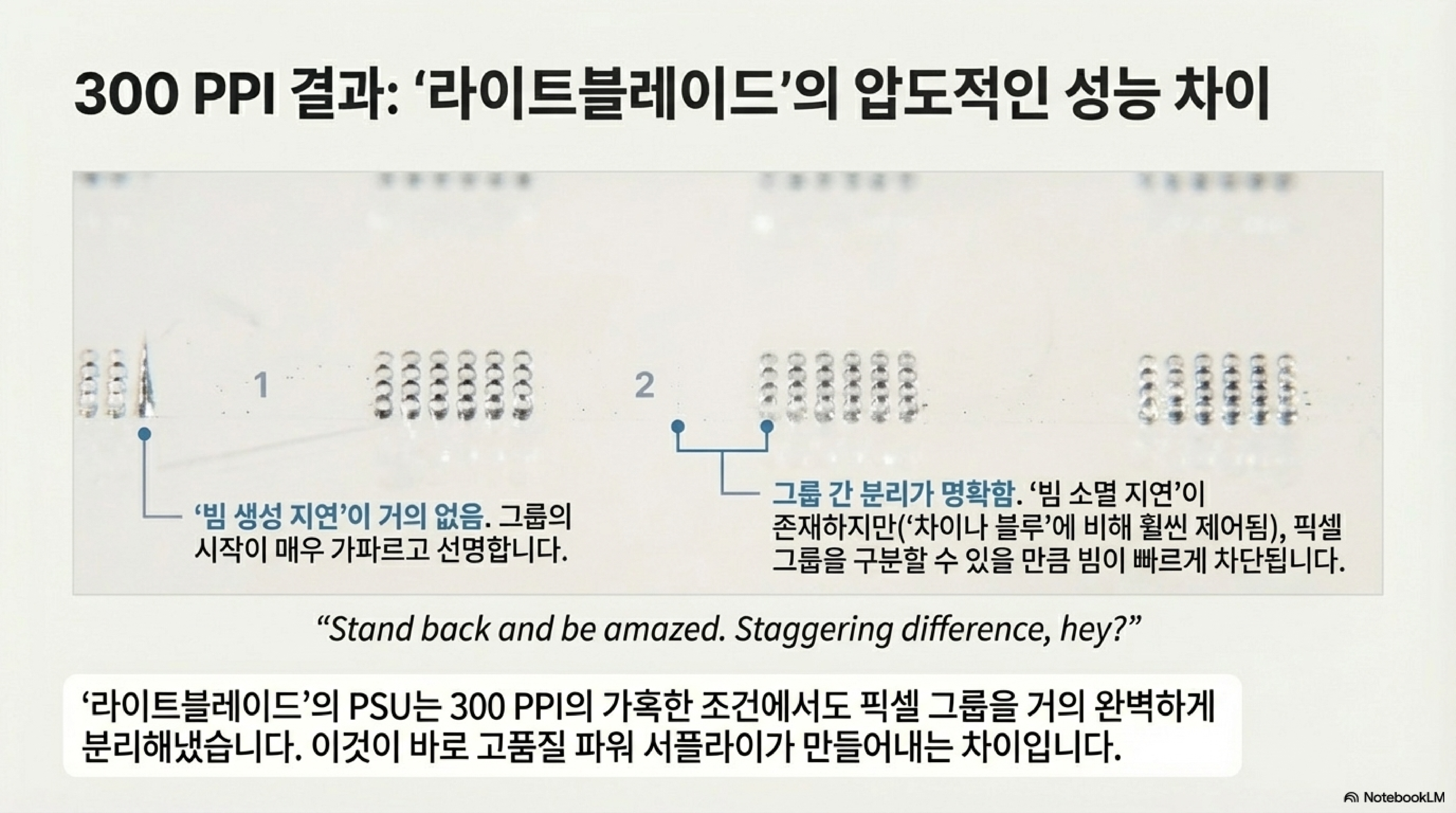 그 결과, 300 DPI 테스트에서 픽셀 그룹 사이에 존재해야 할 "4픽셀 간격은 존재하지 않게" 되었고, 모든 그룹이 서로 합쳐져 뭉개진 선으로 변해버렸습니다. 빔이 "급격하게 떨어지지 않기" 때문에 벌어진 참사입니다.