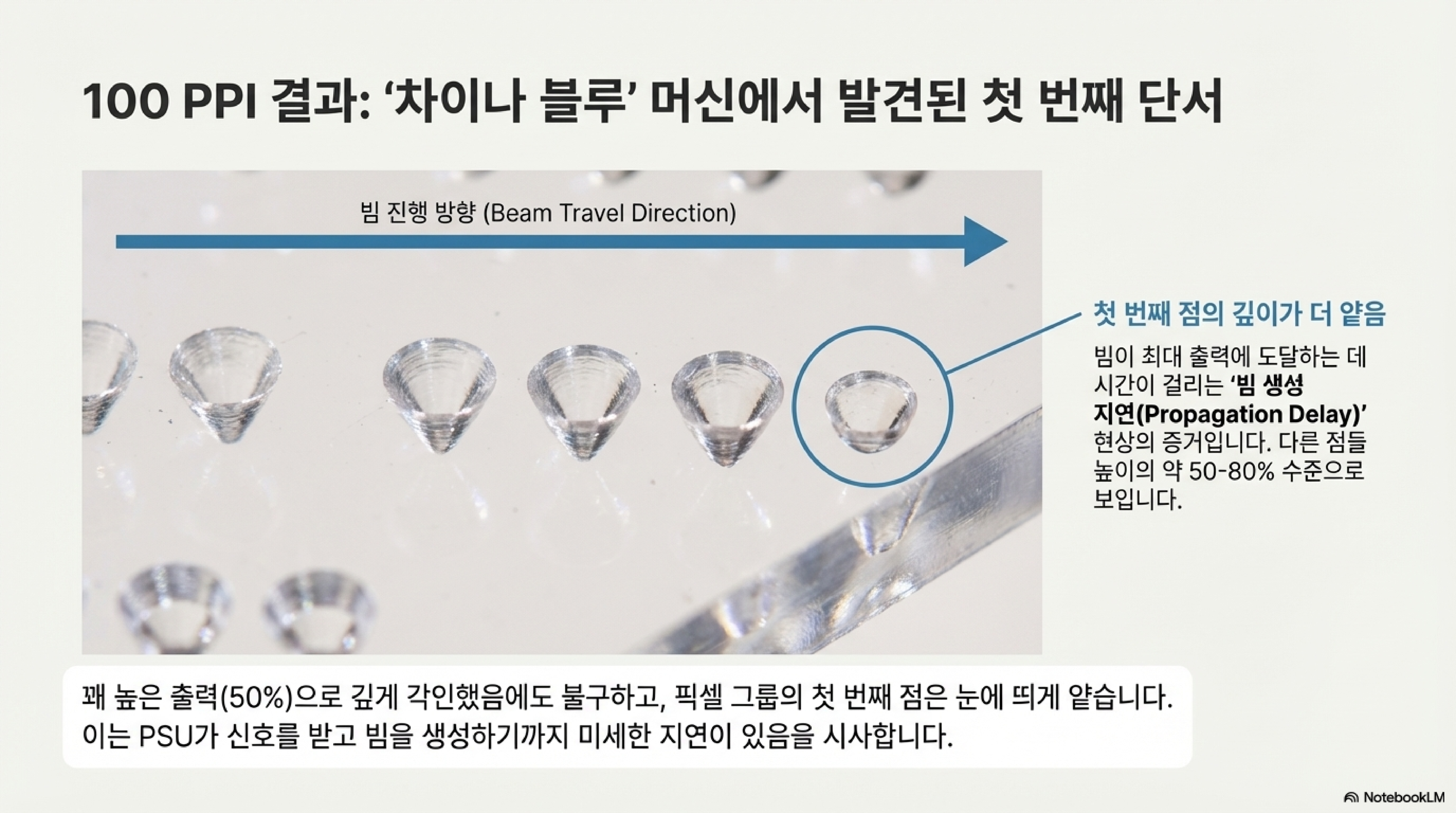 성능이 낮은 'China blue' 기계에서는 이 현상이 재앙과도 같았습니다. 예를 들어, 4개의 픽셀로 이루어진 그룹을 조각할 때, 빔이 움직이기 시작하는 첫 번째 픽셀이 나머지 픽셀들보다 현저히 얕게 파였습니다(전파 지연). 더 심각한 것은, 픽셀 그룹들 사이에 의도적으로 둔 공백이었습니다. 빔이 제때 꺼지지 않는 '소멸 지연' 때문에 이 간격이 완전히 메워져 버린 것입니다.