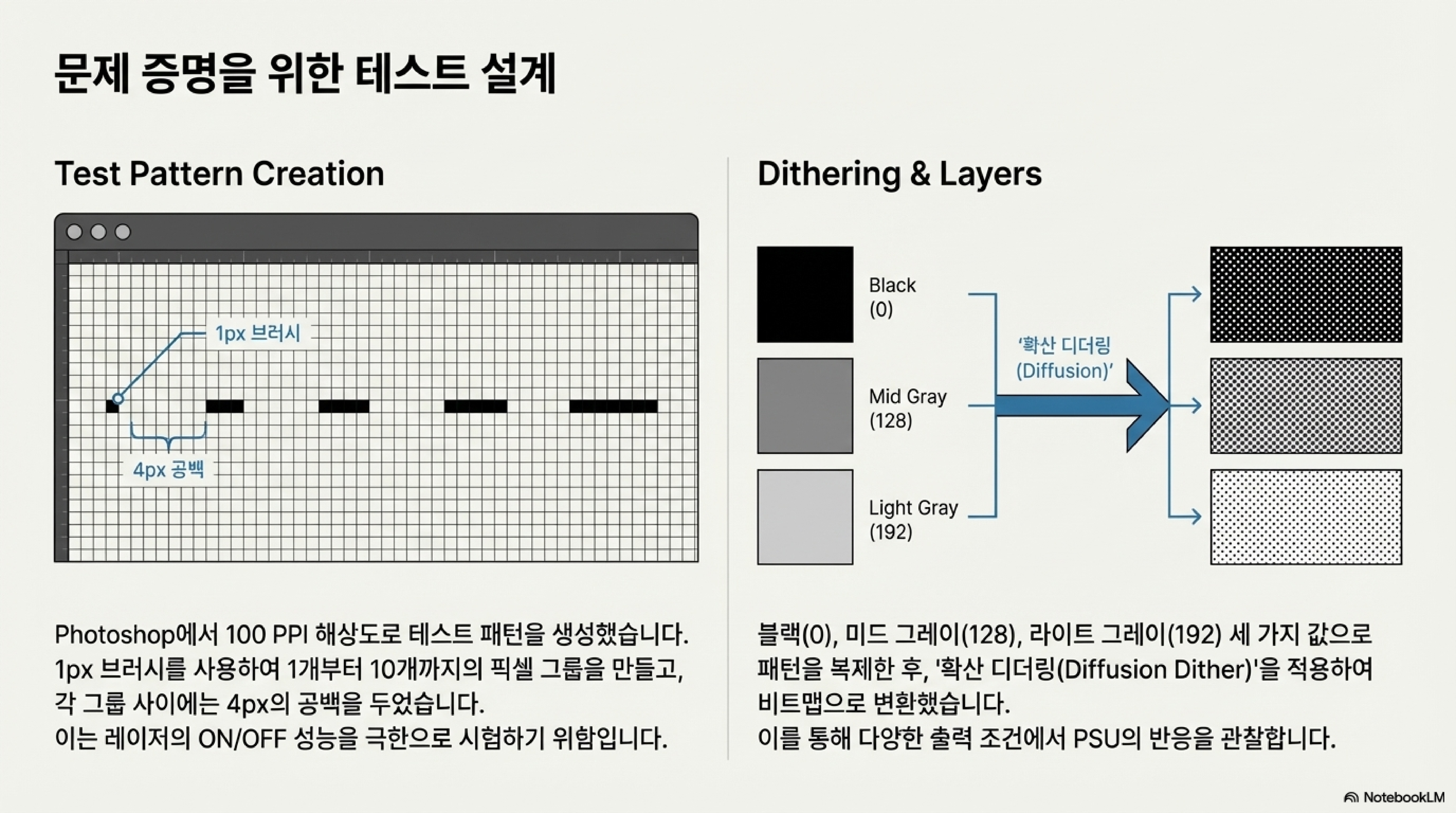 이 놀라운 발견들을 당신의 기계에서도 직접 확인할 수 있습니다. 테스트 방법은 간단합니다. 포토샵 같은 이미지 편집 프로그램에서 순수한 검은색을 사용하여 1, 2, 3, 4 픽셀 너비의 점 그룹들을 만들고, 각 그룹 사이에는 4픽셀의 공백을 두는 방식입니다. 이 파일을 비트맵으로 저장하면 당신만의 진단 키트가 완성됩니다.