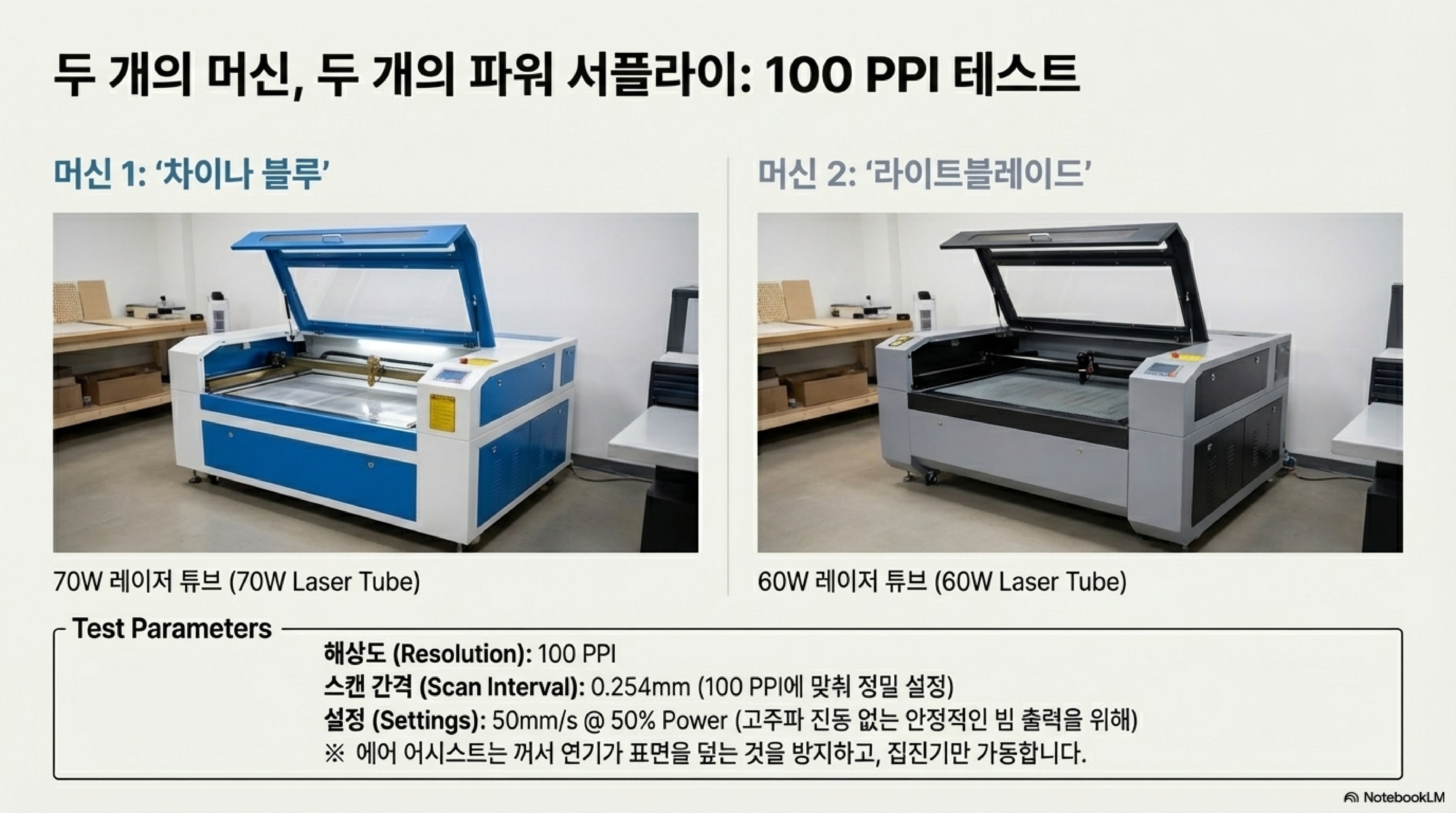 실험은 서로 다른 두 대의 레이저 기계('China blue'와 'Light blade')에서 동일한 패턴을 조각하는 것으로 시작되었습니다. 놀랍게도 결과물에서는 "놀라울 정도로 엄청난 성능 차이(Stark differences in performance)"가 나타났습니다. 상식을 뒤엎는 결과였습니다. 출력이 더 높은 70W 기계보다 오히려 60W 기계의 결과물이 비교할 수 없을 정도로 선명하고 깔끔했던 것입니다.