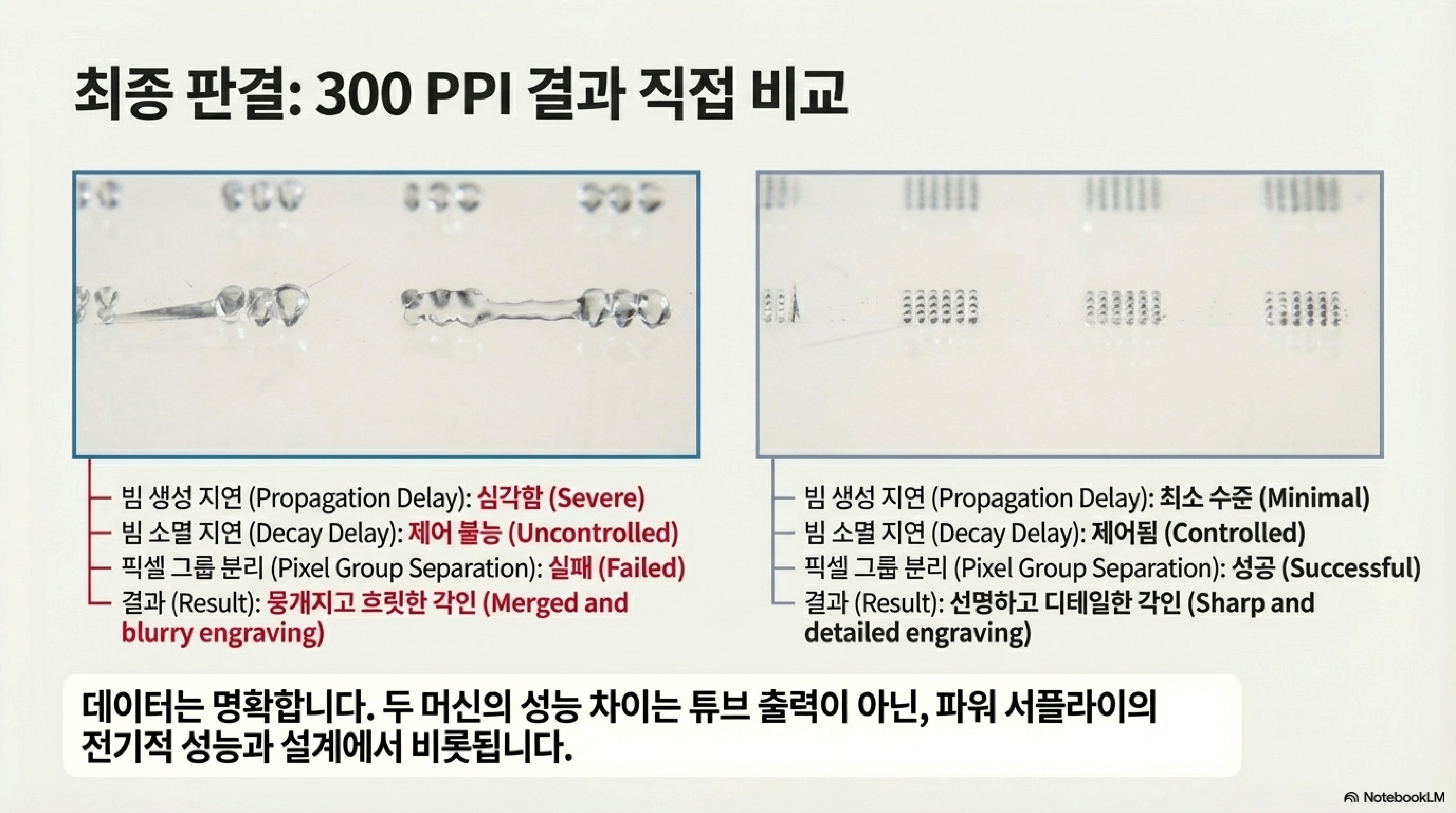 성능이 낮은 'China blue' 기계에서 해상도를 100 DPI에서 300 DPI로 높이자, '레이저의 관성' 문제는 통제 불능 상태가 되었습니다. 이는 반응이 굼뜬 파워 서플라이에게 100미터를 3초에 주파하라고 요구하는 것과 같습니다. 해상도가 3배 높아지자 각 픽셀에 할당된 시간은 1/3로 줄었고, 빔을 켜고 끌 물리적인 시간이 절대적으로 부족해진 것입니다.