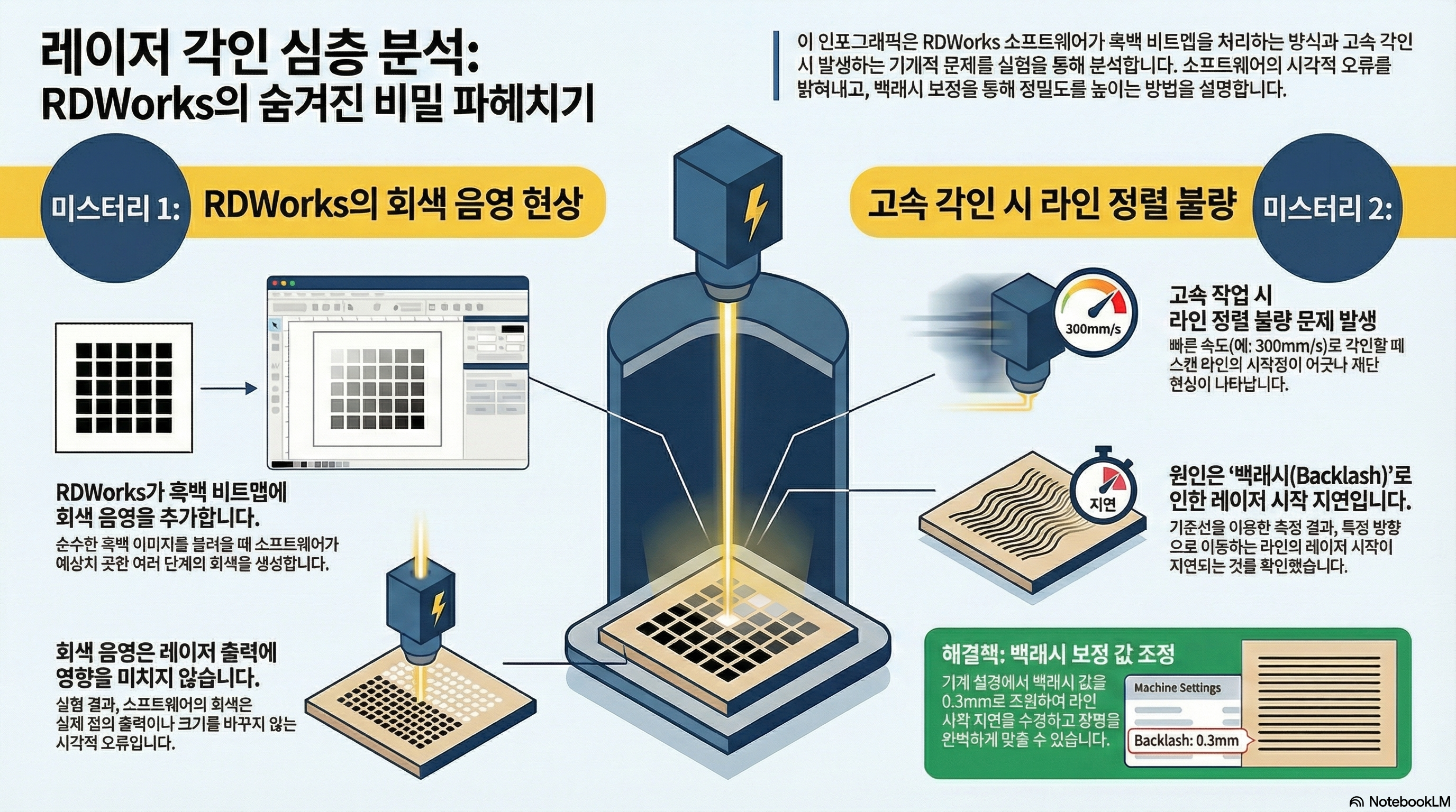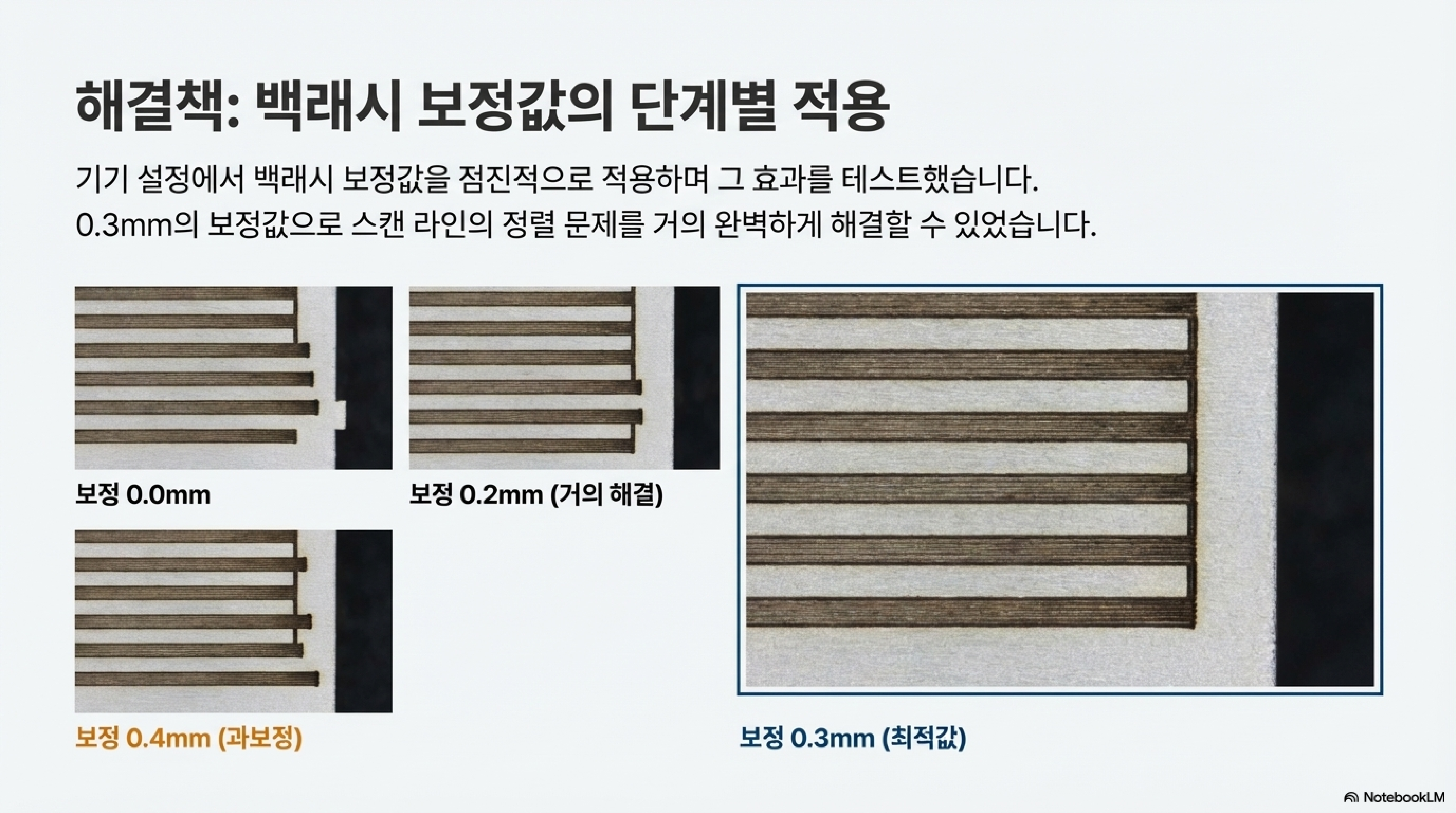 이 어긋남 현상의 진짜 원인은 기계적인 **백래시(backlash)**였습니다. (백래시란, 기계의 축이 운동 방향을 바꿀 때 발생하는 미세한 틈이나 유격으로 인해 생기는 위치 오차를 의미합니다.) 그렇다면 이 복잡해 보이는 문제는 어떻게 해결할 수 있을까요? 놀랍게도 해답은 단 하나의 설정에 있었습니다. 기계 컨트롤러의 '백래시 보정(backlash compensation)' 값을 조절하는 것만으로 거의 완벽하게 해결될 수 있다는 사실이 밝혀졌습니다. 실험에 사용된 "China Blue" 장비에서 0.3mm의 백래시 보정 값을 추가하자, 들쭉날쭉했던 스캔 라인들이 극적으로 정렬되었습니다.
