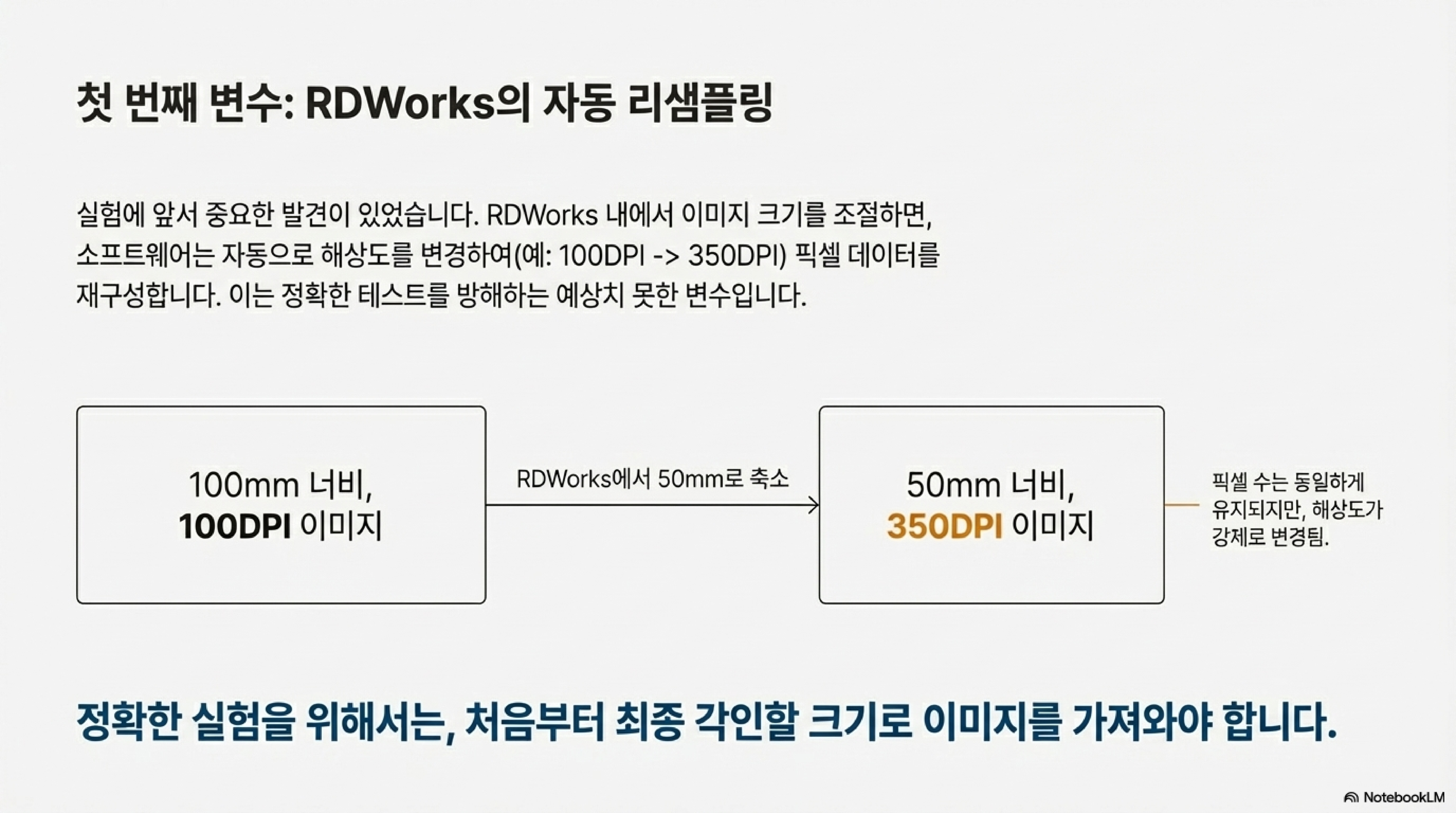 실험에서 사용된 예를 들어보겠습니다. 100 PPI의 비트맵 이미지의 물리적 크기를 프로그램 내에서 50%로 줄였더니, 이미지의 특정 디테일(눈 모양)을 구성하는 픽셀의 수는 변하지 않았습니다. 대신, 이미지의 해상도가 100 PPI에서 350 PPI로 급격히 증가했습니다. 이는 RDWorks가 사용자의 의도와 다르게 픽셀 밀도를 임의로 변경했음을 의미합니다.