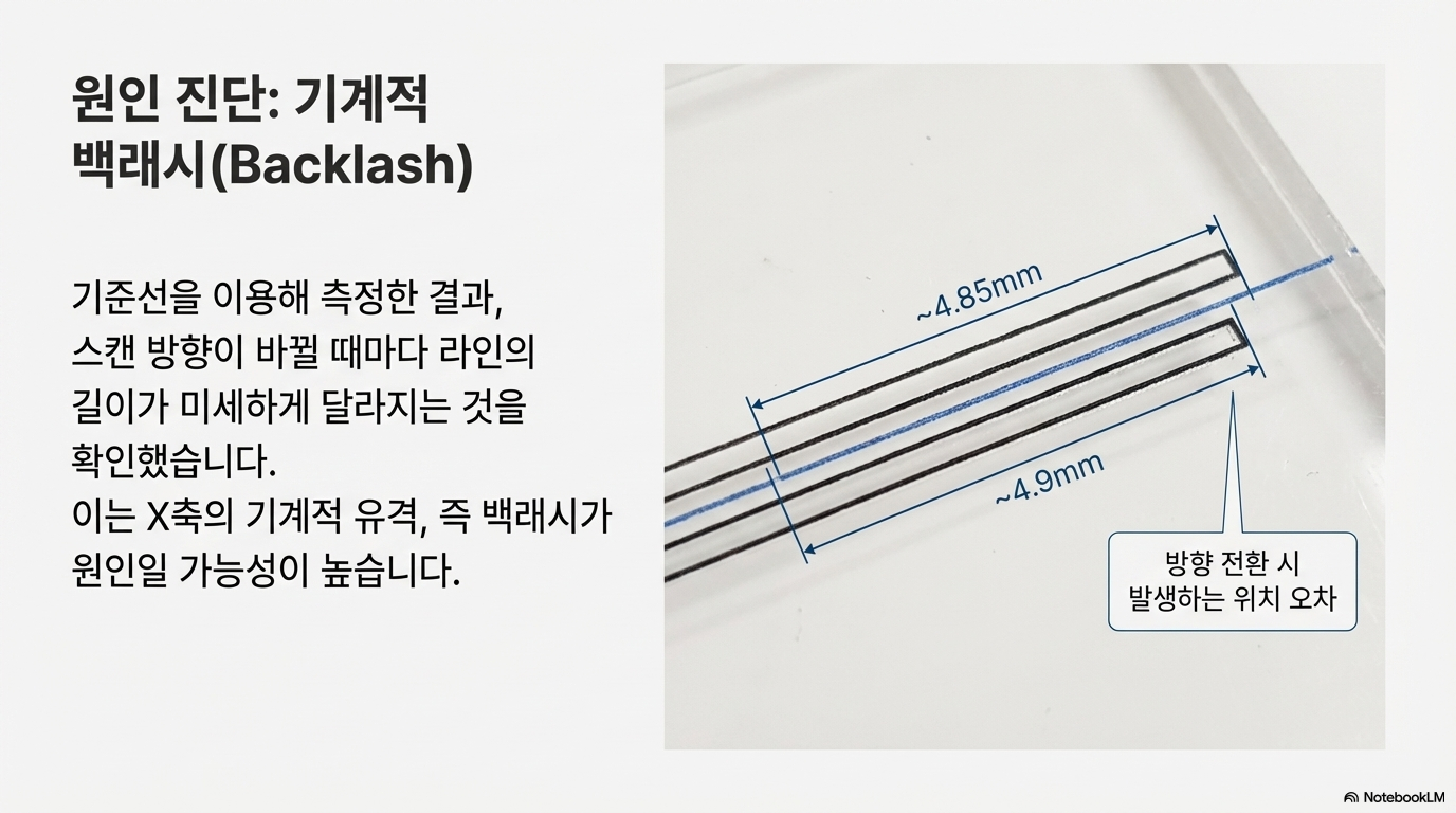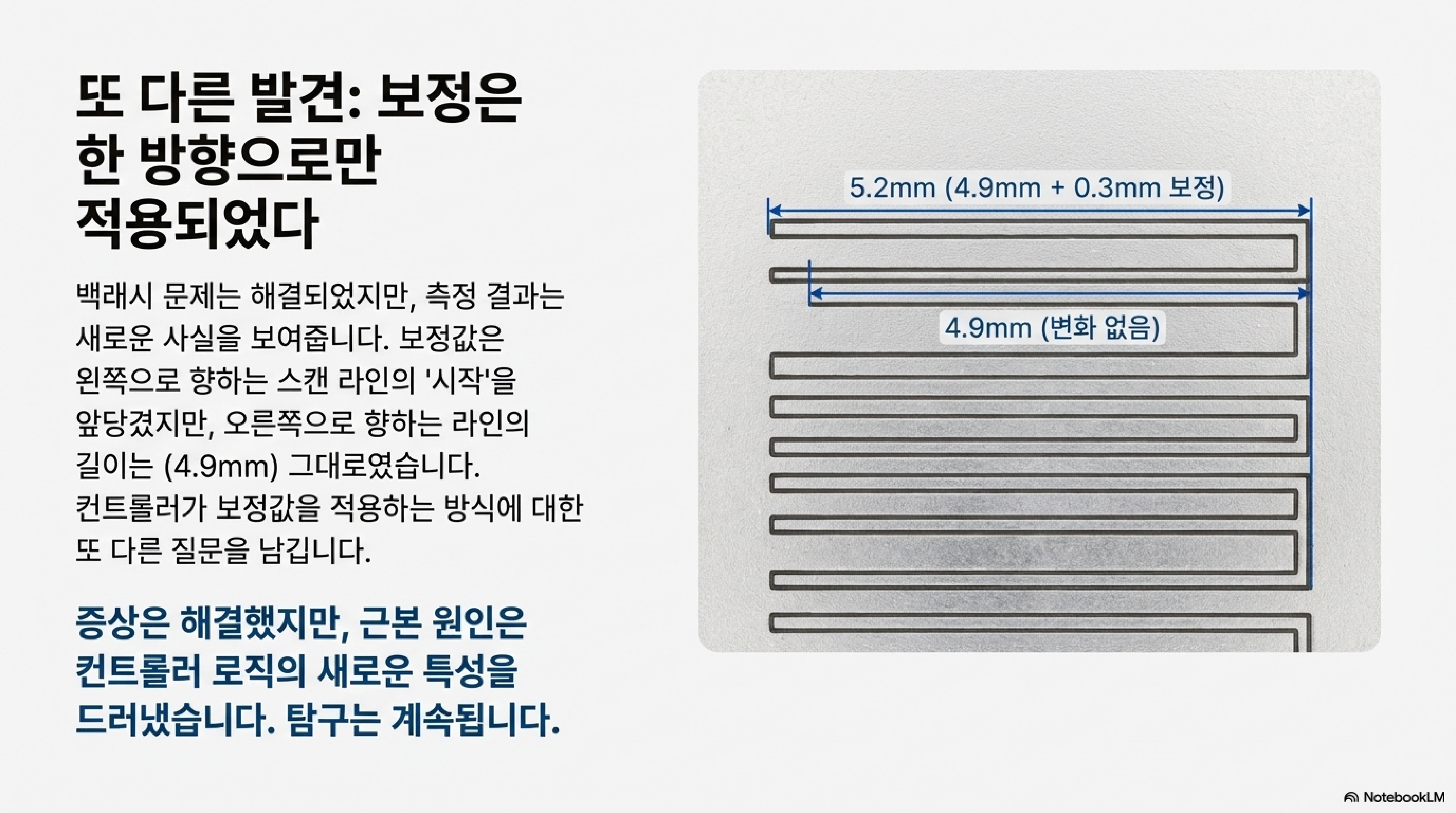 백래시 문제를 성공적으로 해결한 후, 이 보정 기능이 어떻게 작동하는지에 대한 더 깊고 직관에 반하는 사실이 드러났습니다. 보정 값을 적용한 뒤 정밀 측정을 해보니, 이 보정이 모든 스캔 라인에 동일하게 적용되지 않는다는 점이 밝혀졌습니다.