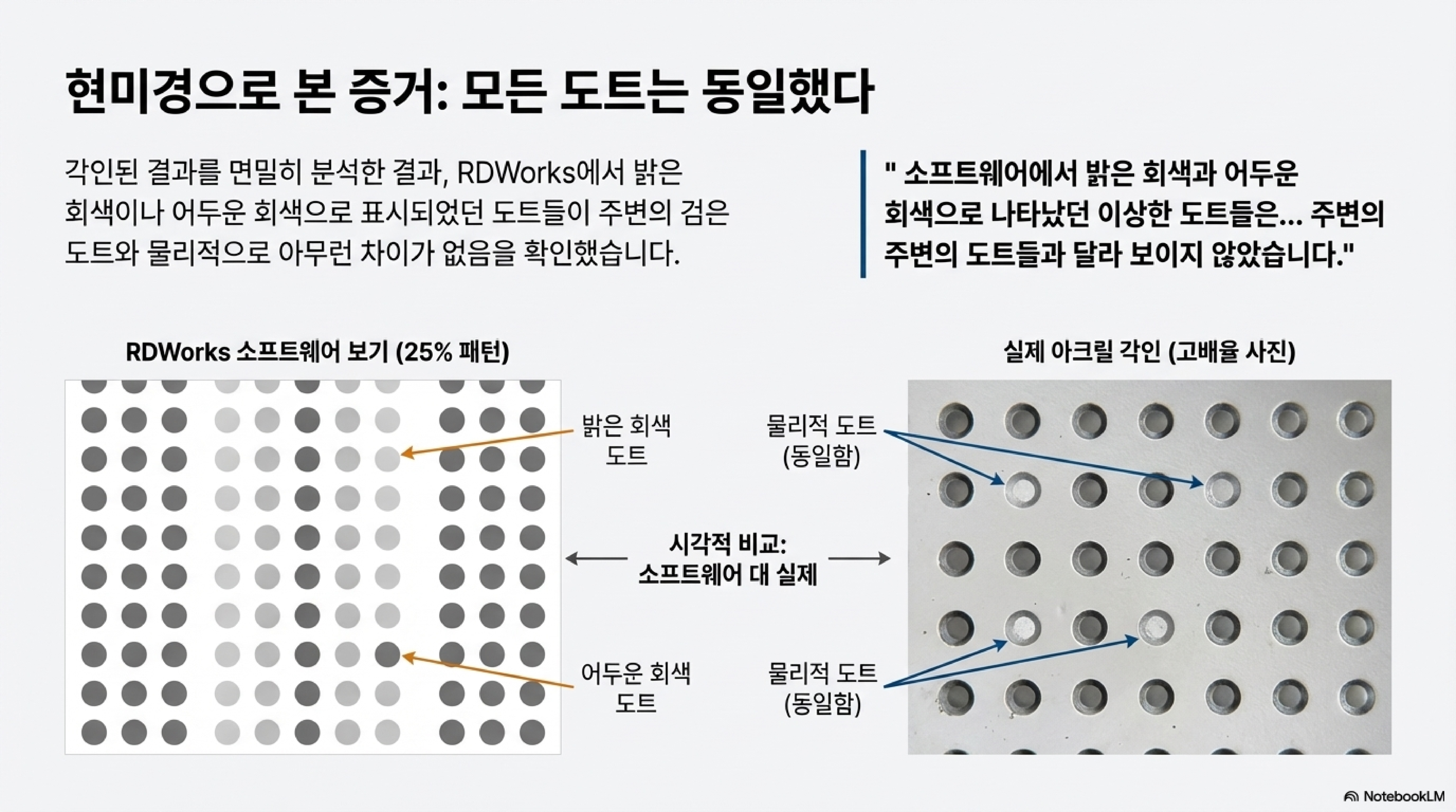 하지만 아크릴에 다양한 패턴을 각인하며 테스트한 결과, 이는 소프트웨어 화면에만 나타나는 순수한 시각적 착시 현상임이 밝혀졌습니다. 화면에 연회색으로 보이던 부분, 중간 회색으로 보이던 부분, 그리고 검은색으로 보이던 부분에서 생성된 각인된 점들은 물리적으로 모두 동일했습니다.