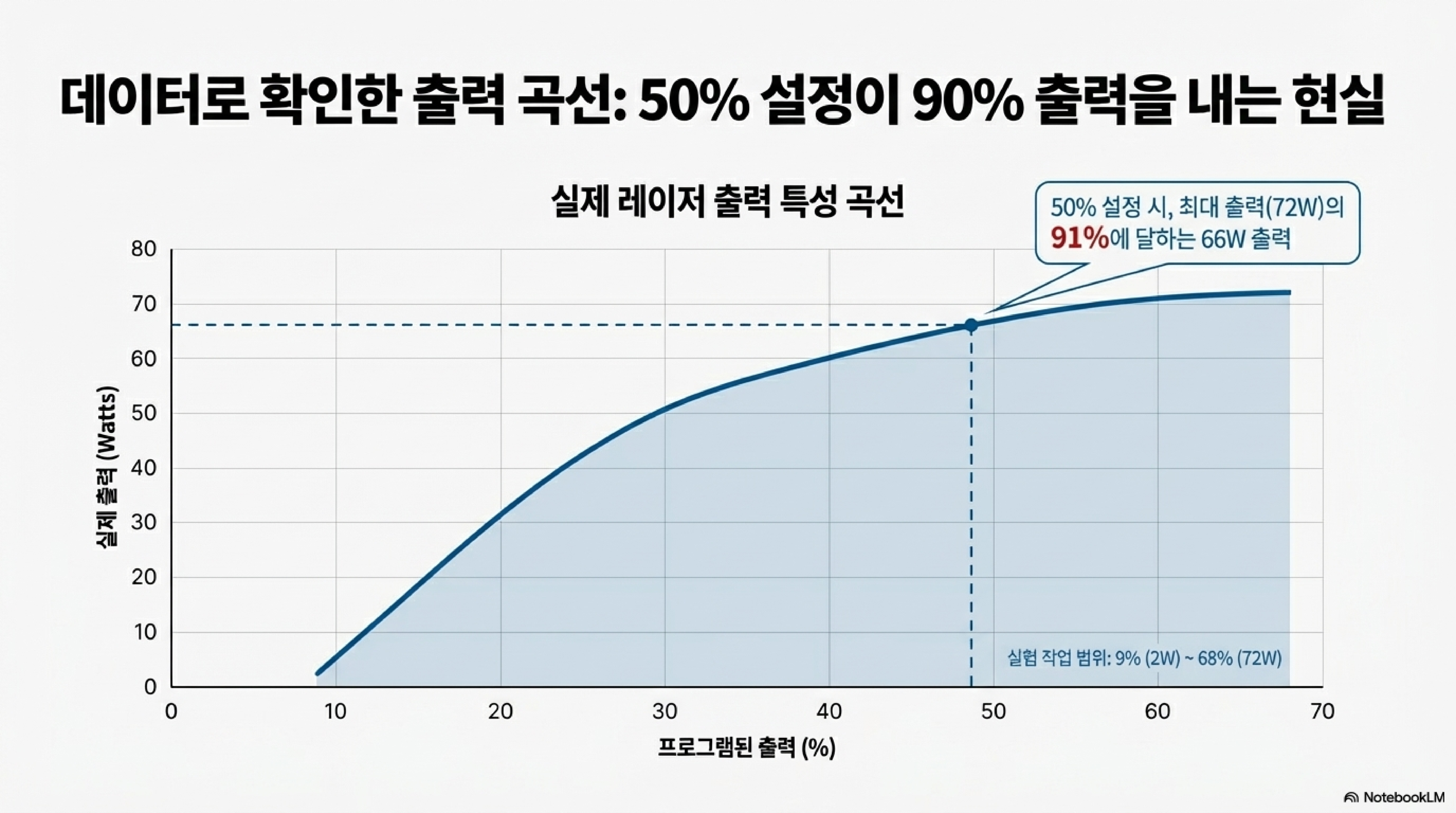 레이저 각인 소프트웨어에서 출력 값을 50%로 설정하면, 레이저 튜브 최대 출력의 절반이 나올 것이라고 기대하는 것이 상식적입니다. 하지만 충격적이게도, 현실은 전혀 다릅니다. 소프트웨어의 '출력 비율(%)'과 레이저 튜브에서 실제로 나오는 '와트(W)' 사이의 관계는 완전히 비선형적입니다.