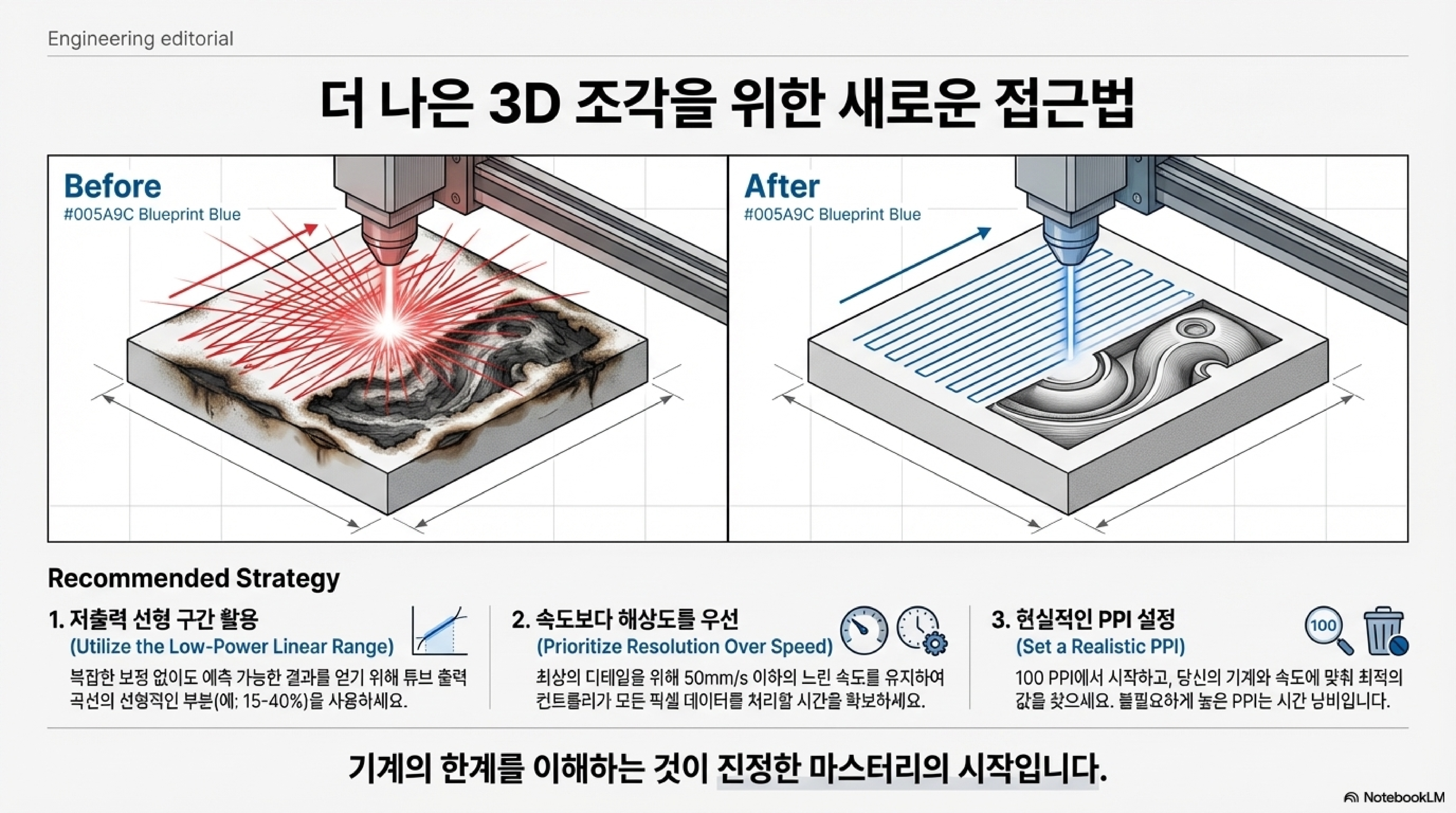 우리가 파헤친 4가지 진실—출력의 비선형성, DPI의 환상, 컨트롤러의 속도 제한, 그리고 기계 부품에 대한 오해—은 하나의 중요한 결론으로 귀결됩니다. 3D 각인의 품질은 우리가 눈으로 보고 만질 수 있는 하드웨어보다, 기계 내부의 보이지 않는 소프트웨어 로직과 숨겨진 규칙에 의해 더 크게 좌우된다는 것입니다.