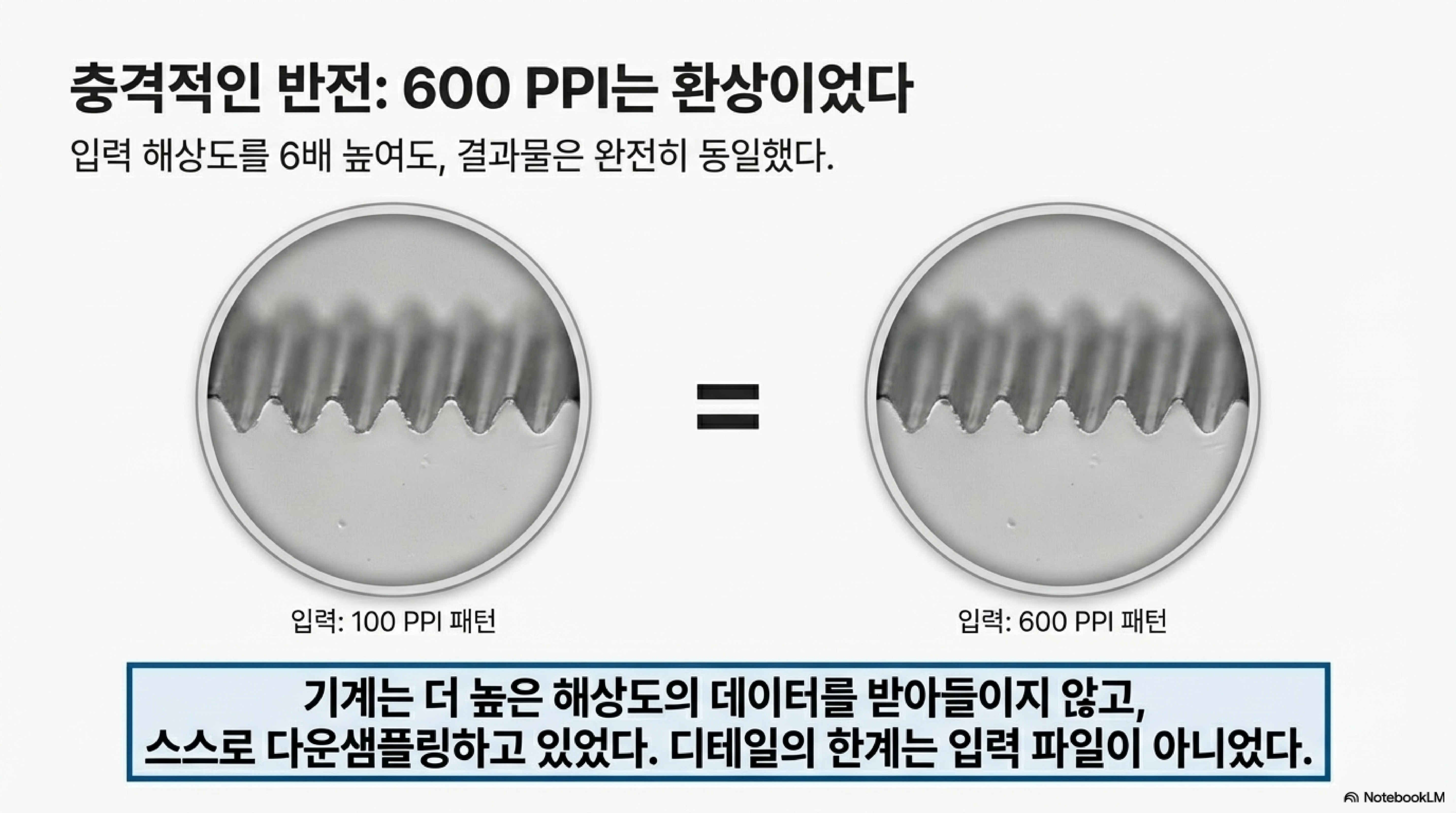 실험에서는 동일한 패턴의 이미지를 각각 100ppi와 600ppi 해상도로 준비하여 각인했습니다. 하지만 결과물을 현미경으로 관찰했을 때, 두 샘플에서 생성된 점(dot) 패턴에는 어떠한 차이도 발견되지 않았습니다. 6배나 높은 해상도를 사용했음에도, 기계는 사실상 더 낮은 해상도로 작업을 처리한 것입니다. 이 이해할 수 없는 결과는 우리를 더 깊은 질문으로 이끌었습니다: 도대체 기계 내부에서 무슨 일이 벌어지고 있는 것일까? 이 발견은 단순히 이미지 파일의 해상도를 높이는 것이 3D 각인의 정밀도를 높이는 마법의 해결책이 아님을 명확히 보여줍니다.