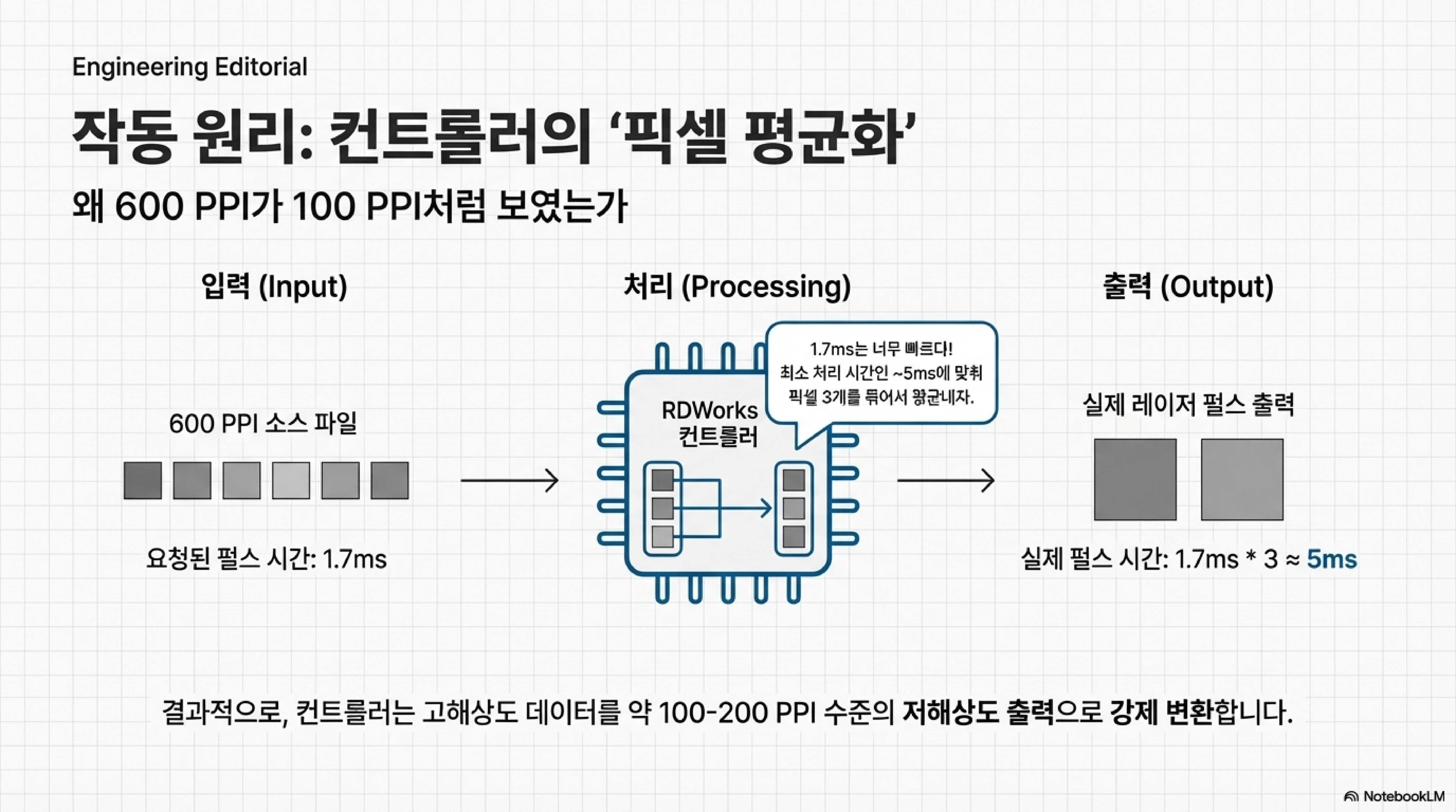 컨트롤러가 처리할 수 없는 속도의 명령을 받으면 어떻게 될까요? 1.7밀리초라는 불가능한 속도로 6개의 개별 펄스를 쏘는 대신, 컨트롤러는 그 6개 픽셀 그룹에 필요한 '평균 출력'을 계산하여 그 값으로 더 길고 단일화된 펄스를 한 번 발사하는 것입니다. 이것이 바로 600 DPI 이미지의 섬세한 디테일이 사라지고 기계가 실제로 처리할 수 있는 해상도로 되돌아가는 이유입니다. 중요한 점은 이것이 레이저 파워 서플라이나 기계 자체의 물리적 한계가 아니라, 우리가 알 수 없는 소프트웨어 알고리즘의 한계일 가능성이 높다는 것입니다.
