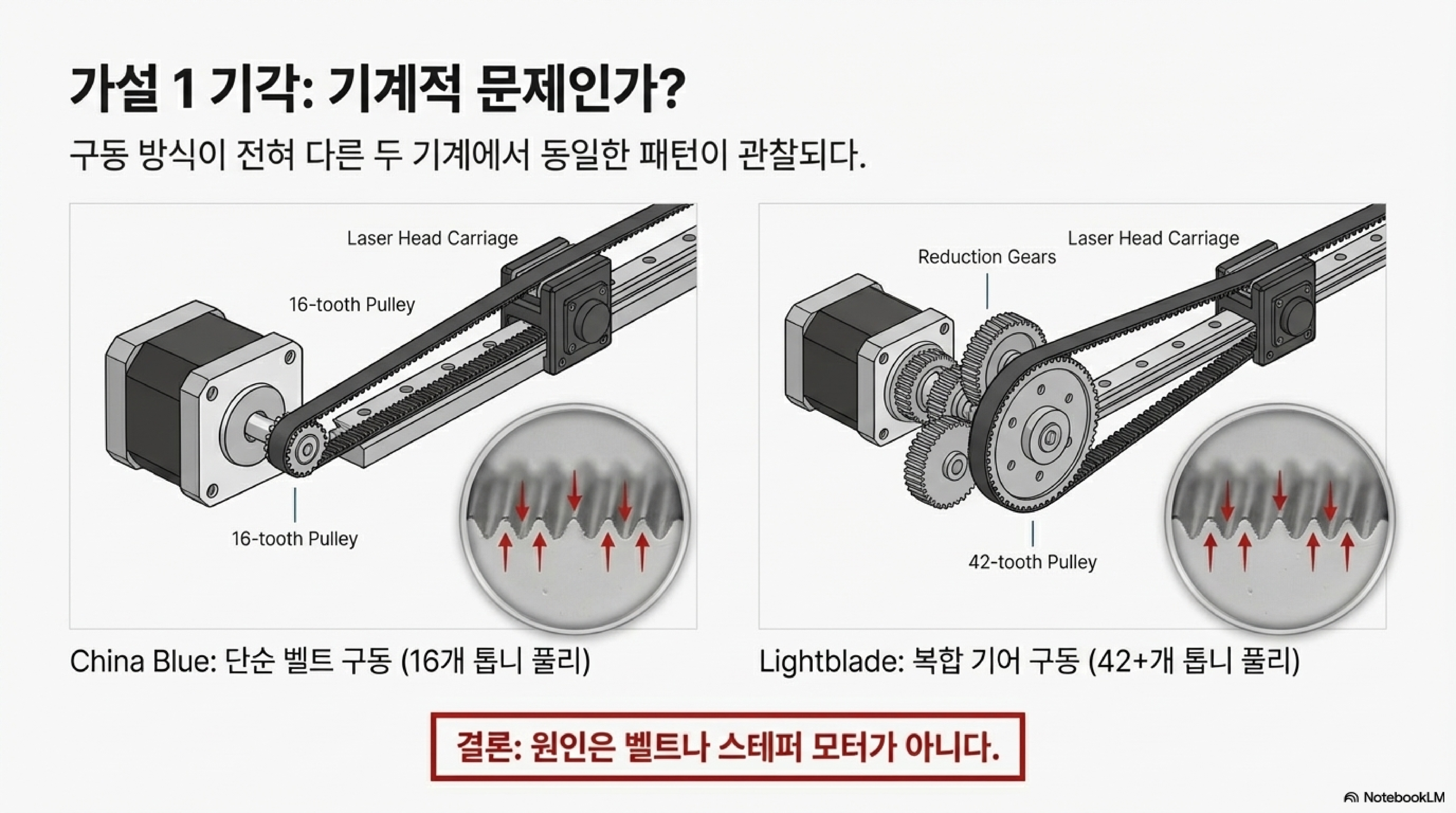 각인 결과물에 나타나는 톱니 모양 같은 이상한 패턴을 발견하면, 많은 사용자들이 스테퍼 모터의 정밀도나 구동 벨트의 장력 문제를 의심합니다. 기계적인 결함이 결과물의 품질을 저하시킨다는 것은 매우 직관적인 추측이죠.