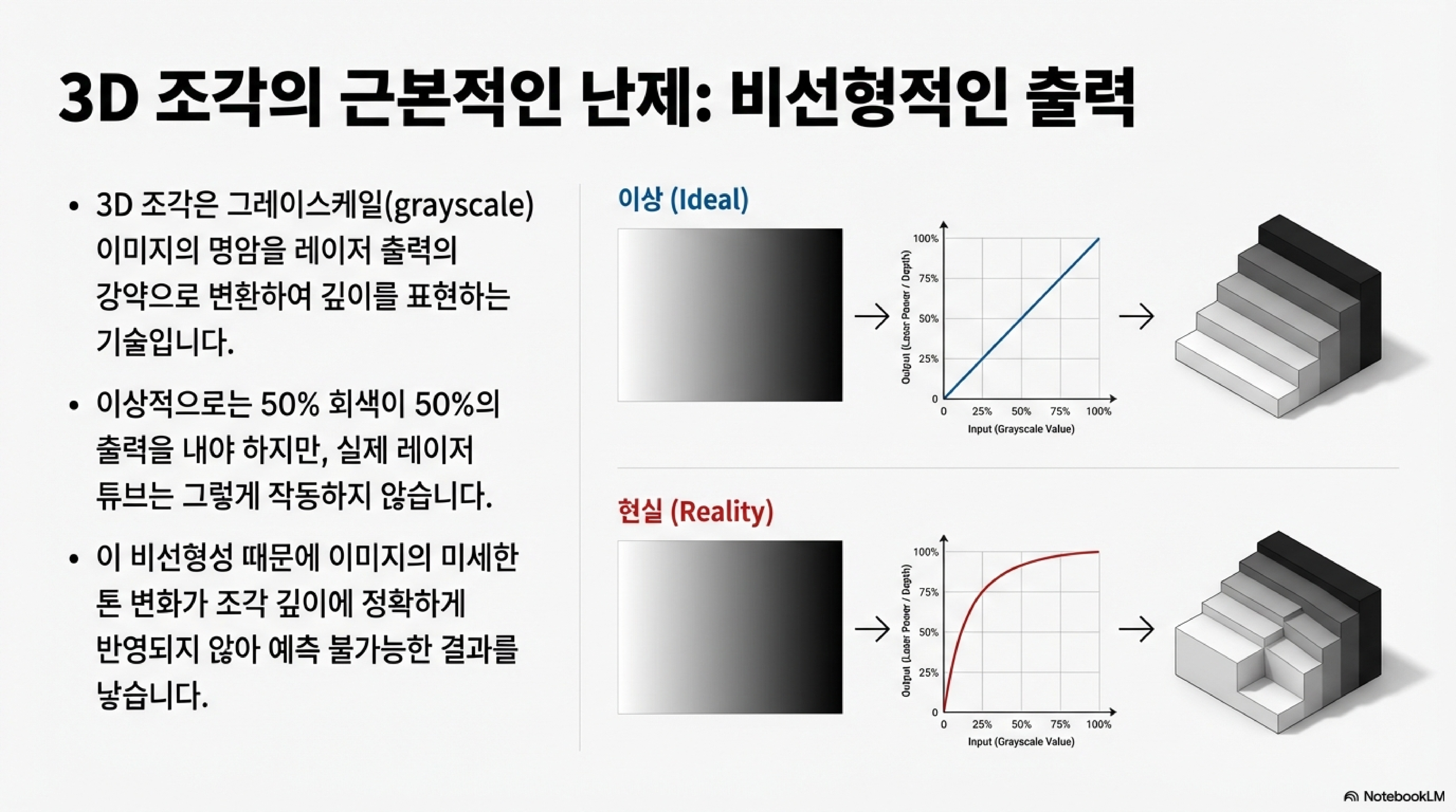 이 비선형성은 회색 음영(grayscale)의 미묘한 차이에 비례하여 출력을 정밀하게 조절해야 하는 3D 각인에서 심각한 문제를 일으킵니다. 이것이 바로 당신의 디자인에서 부드러운 회색 그라데이션이 실제로는 급격하게 어두워지며 중간 톤의 디테일을 모두 뭉개버리는 이유입니다. 중간 회색 픽셀이 의도했던 것보다 훨씬 더 강한 에너지를 재료에 가하게 되어, 결국 디자인의 깊이와 디테일을 망가뜨리는 주된 원인이 됩니다.