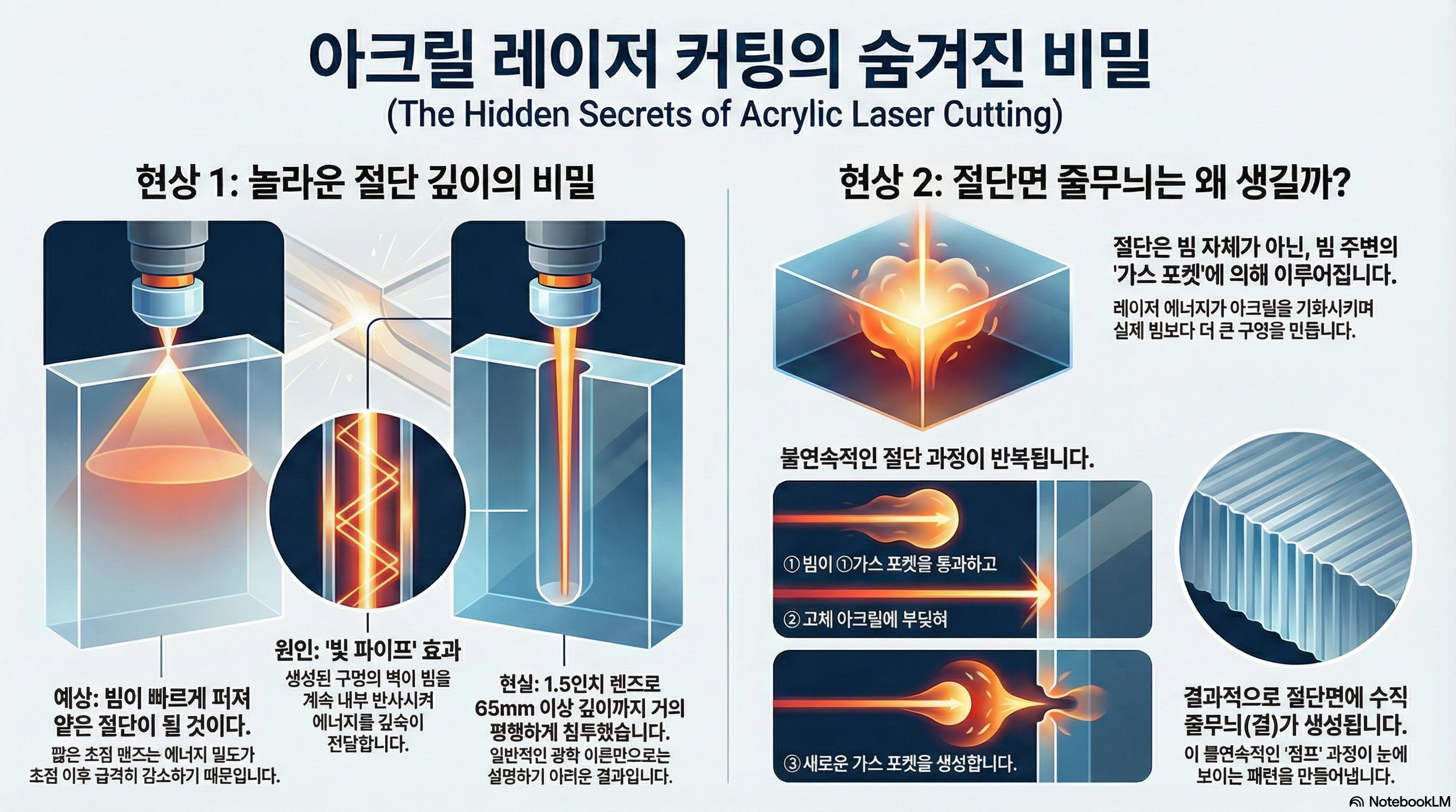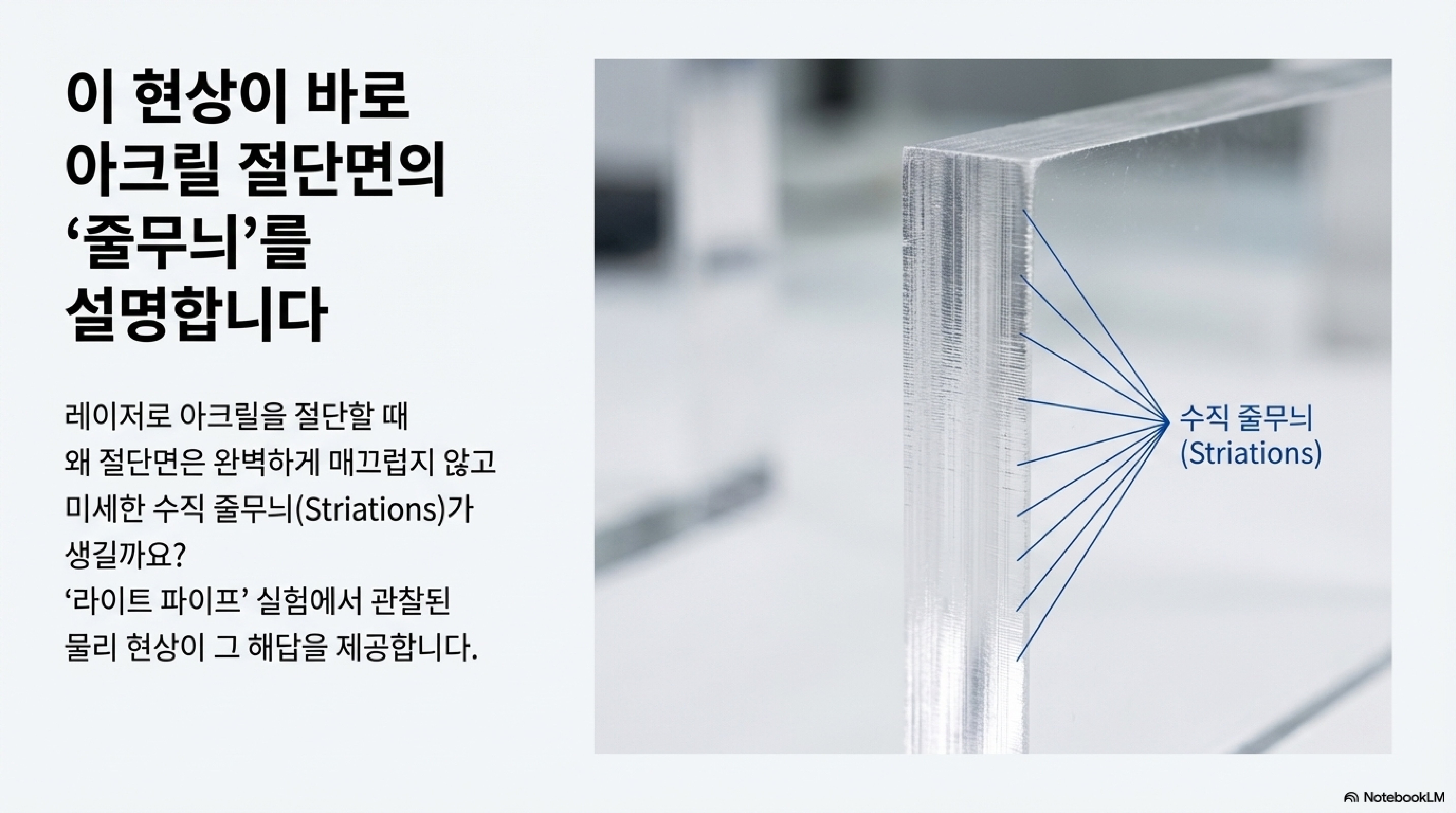 레이저로 자른 아크릴 단면을 자세히 보면 미세한 세로 줄무늬(striations)를 발견할 수 있습니다. 많은 이들이 이를 불완전한 가공의 흔적이나 기계적 결함으로 오해하지만, 사실 이것은 예측 가능한 물리적 과정의 증거입니다.