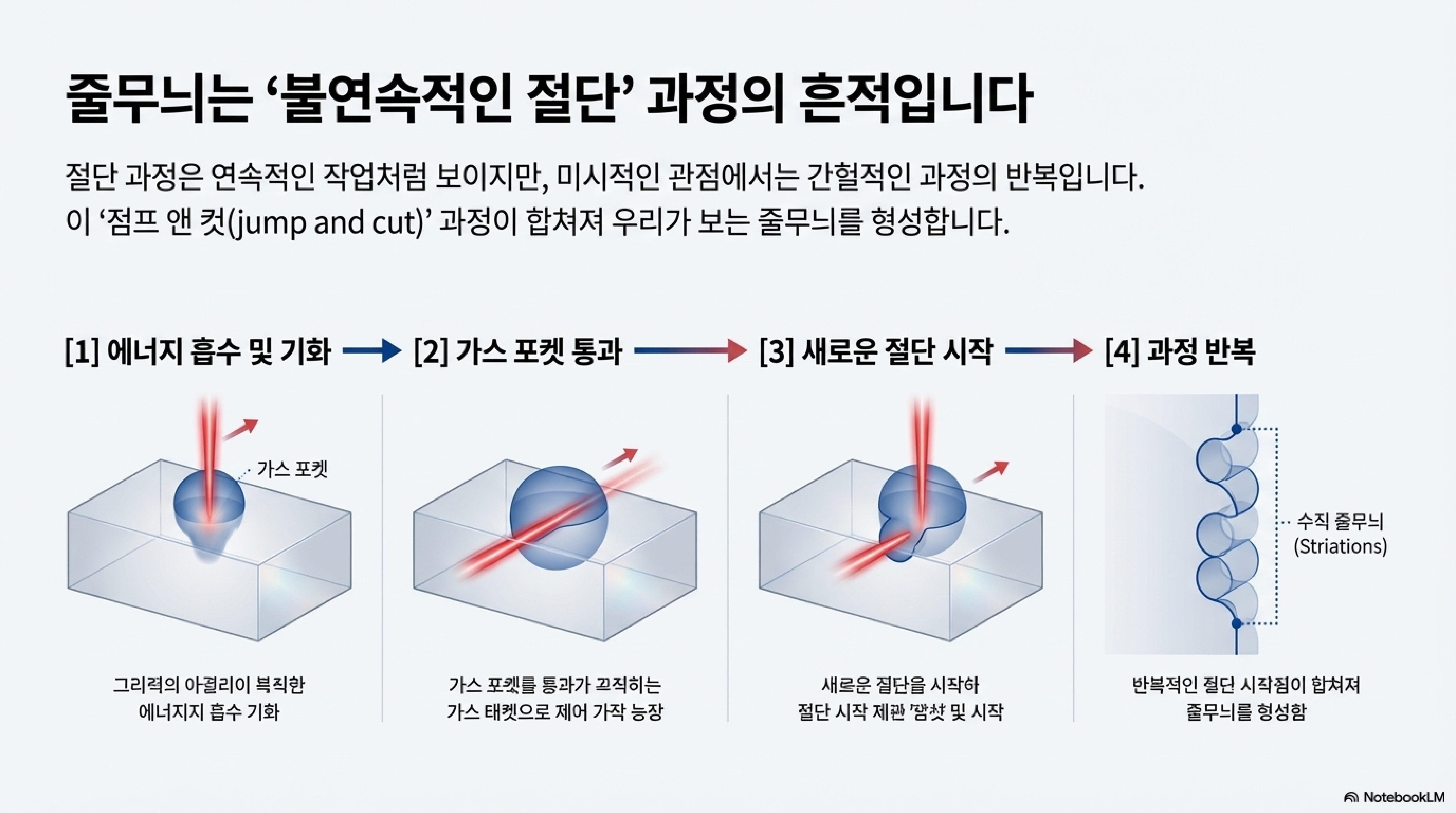 이 과정이 매우 빠른 속도로 반복되면서, 절단면에는 마치 구형의 영향권(spheres of influence)이 연속적으로 합쳐진 듯한 패턴이 남게 됩니다. 우리가 보는 미세한 줄무늬는 바로 이 현상의 흔적인 것입니다.