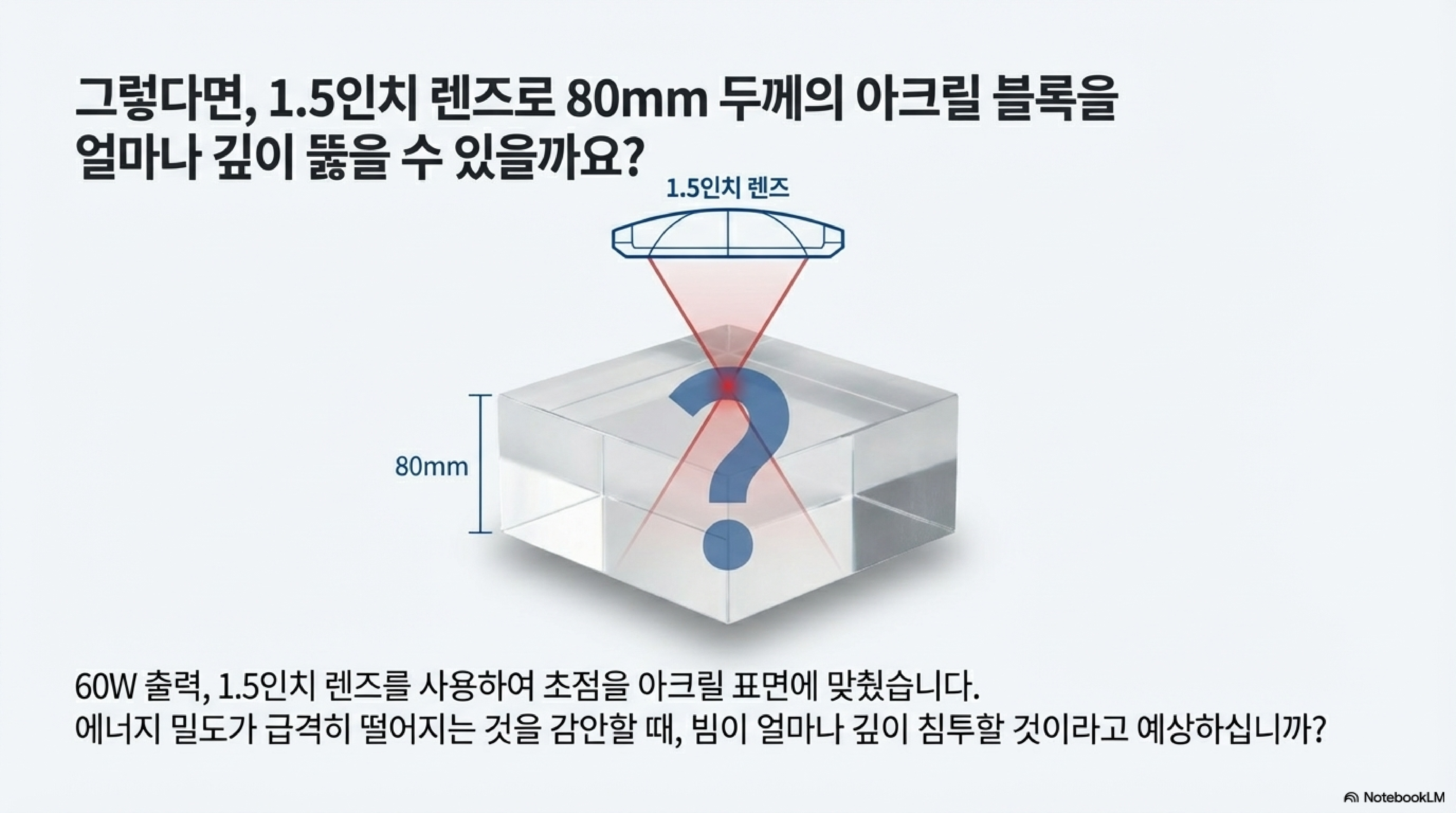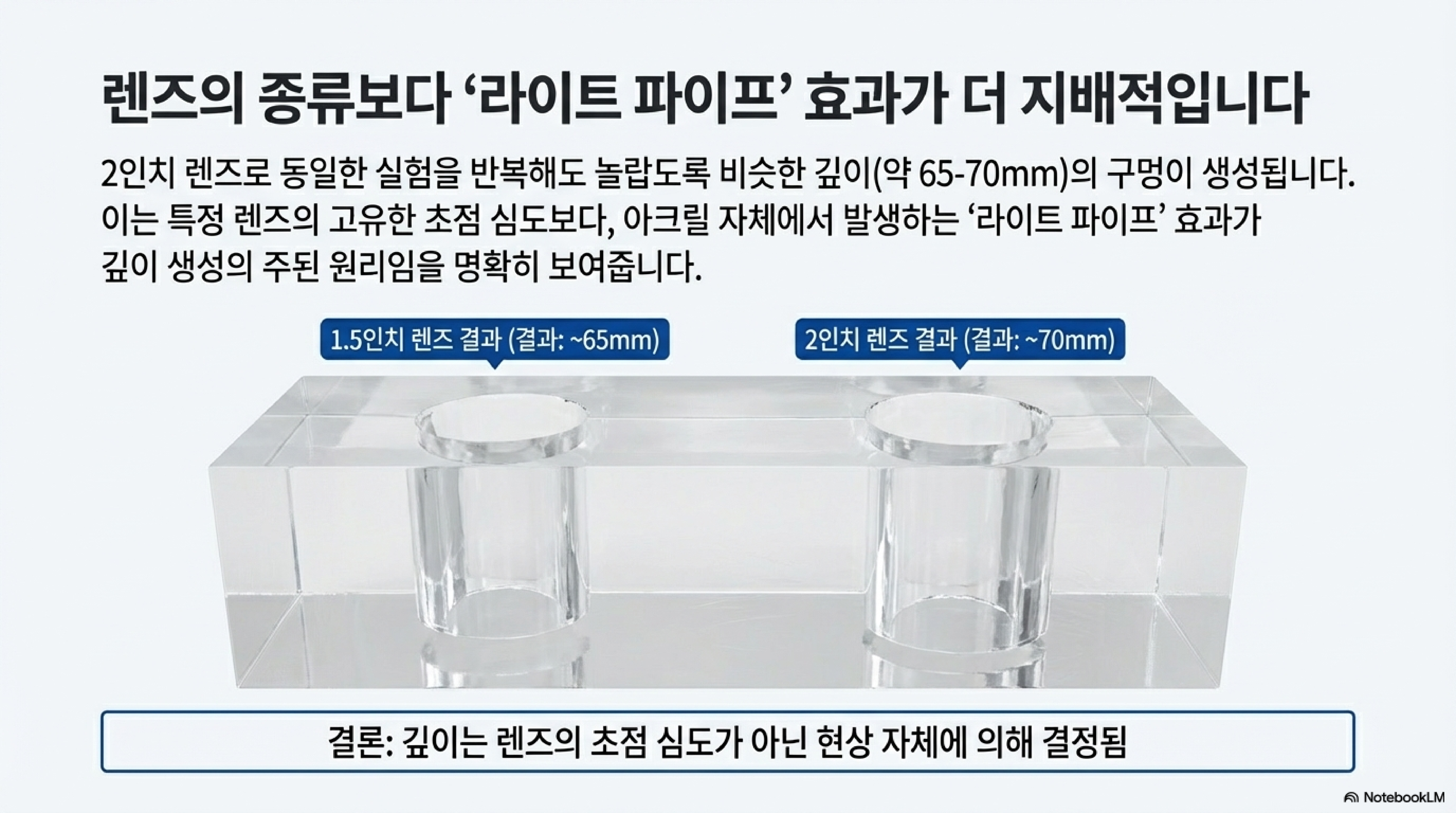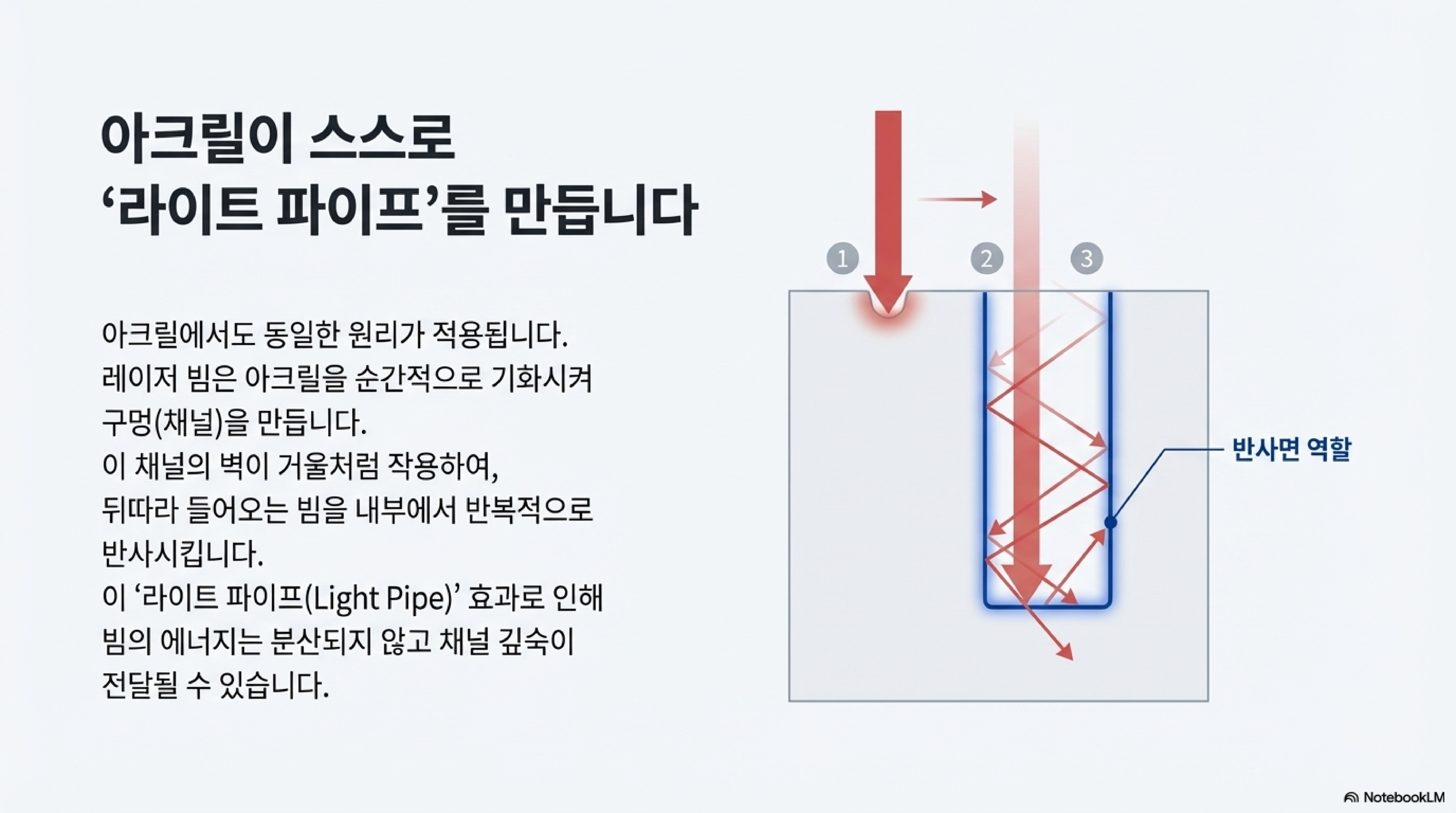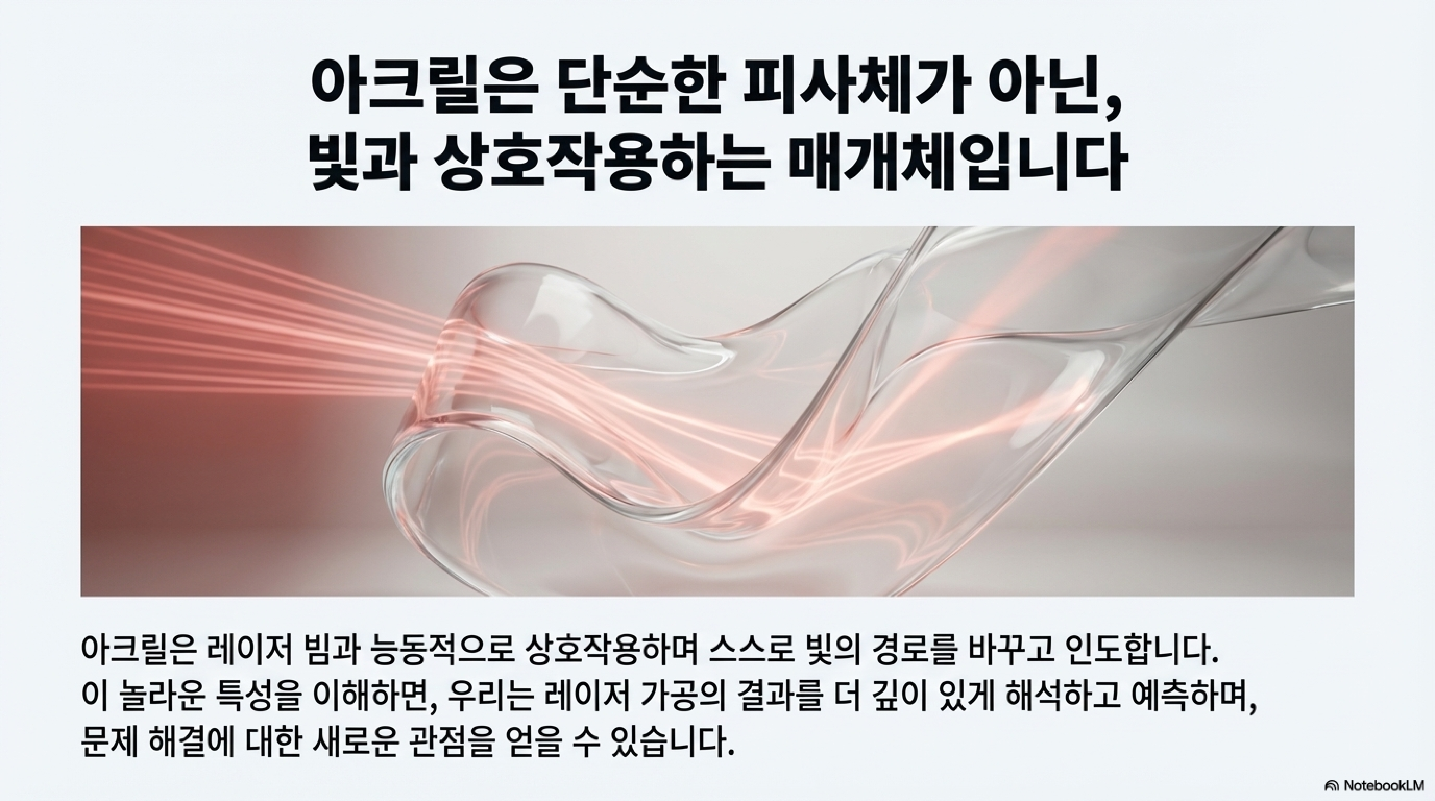 가장 놀라운 현상 중 하나는 아크릴이 레이저 빔을 마치 '라이트 파이프(light pipe)'나 광섬유처럼 작용하게 만들어, 빔이 예상보다 훨씬 깊이 파고들 수 있다는 점입니다.
