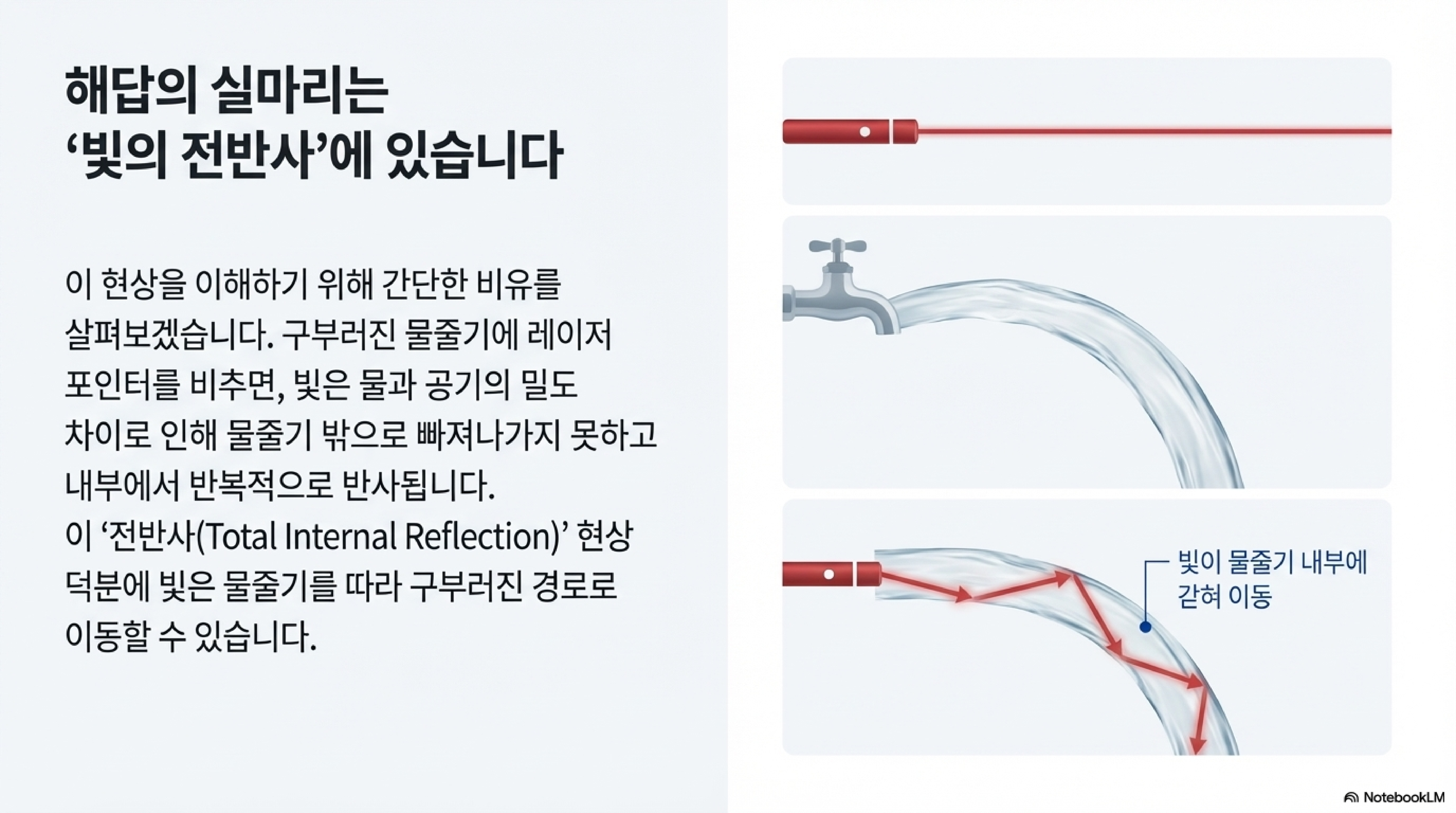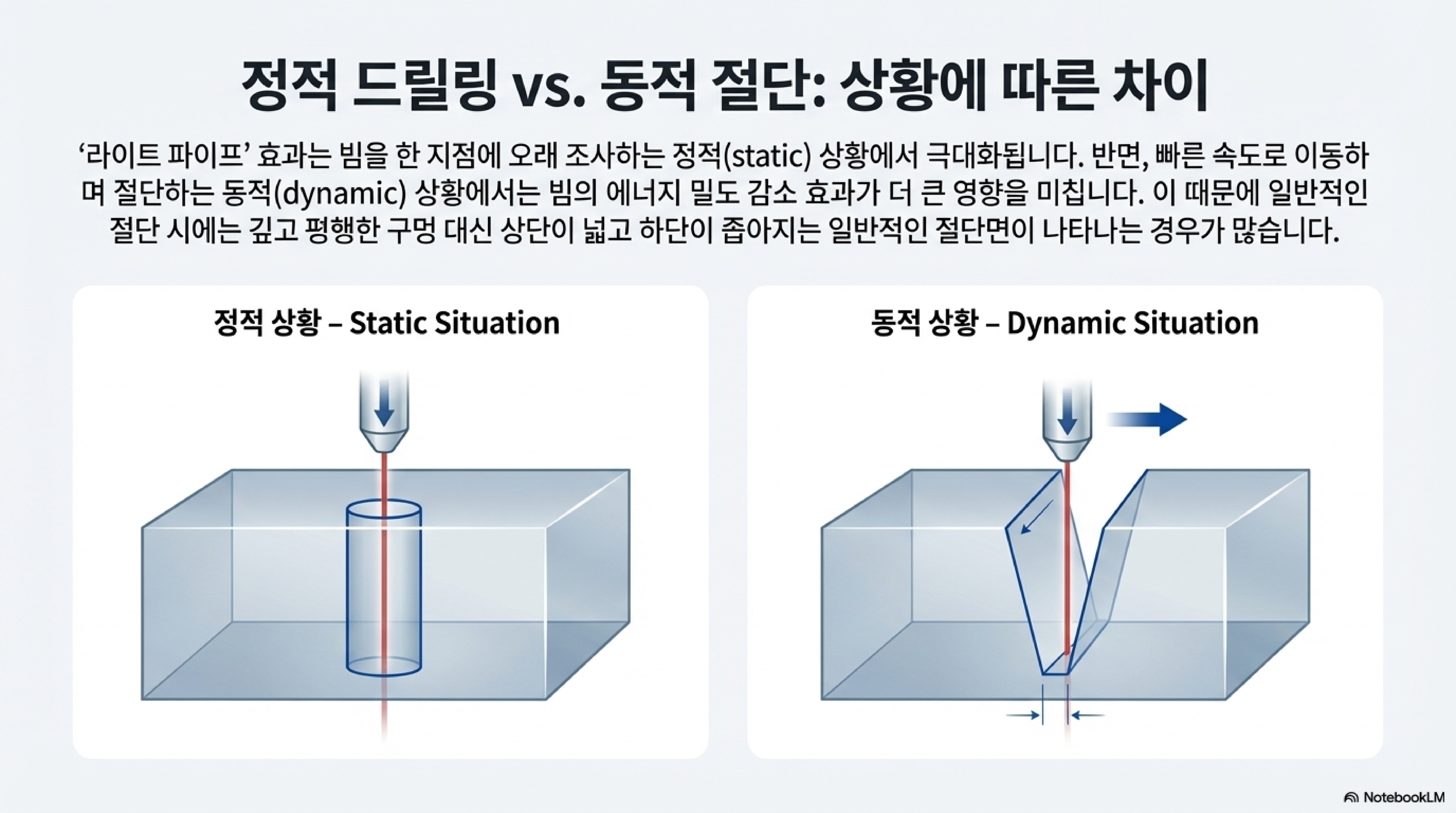 이 원리는 흐르는 물줄기 속을 통과하는 레이저 포인터 비유로 쉽게 이해할 수 있습니다. 물과 공기의 밀도 차이 때문에 빛이 물줄기 밖으로 빠져나가지 못하고 내부에서 계속 반사되며 나아가는 것처럼(내부 전반사), 레이저 빔도 아크릴이 기화하며 만들어낸 구멍의 내벽에서 계속해서 반사되며 깊이 전진하는 것입니다. 빔의 에너지가 분산되지 않고 구멍 벽에 갇혀 바닥까지 전달되는 것입니다.