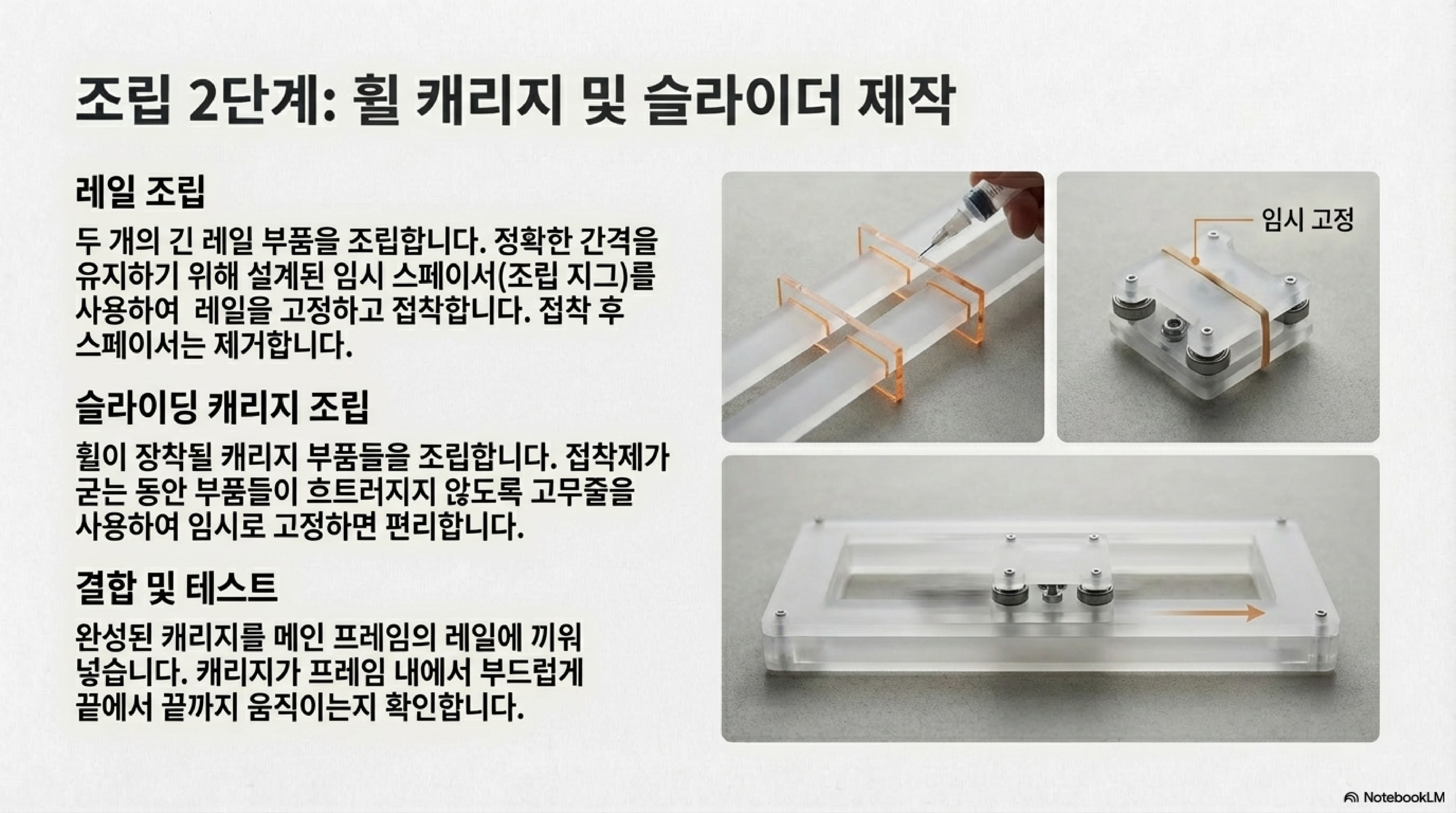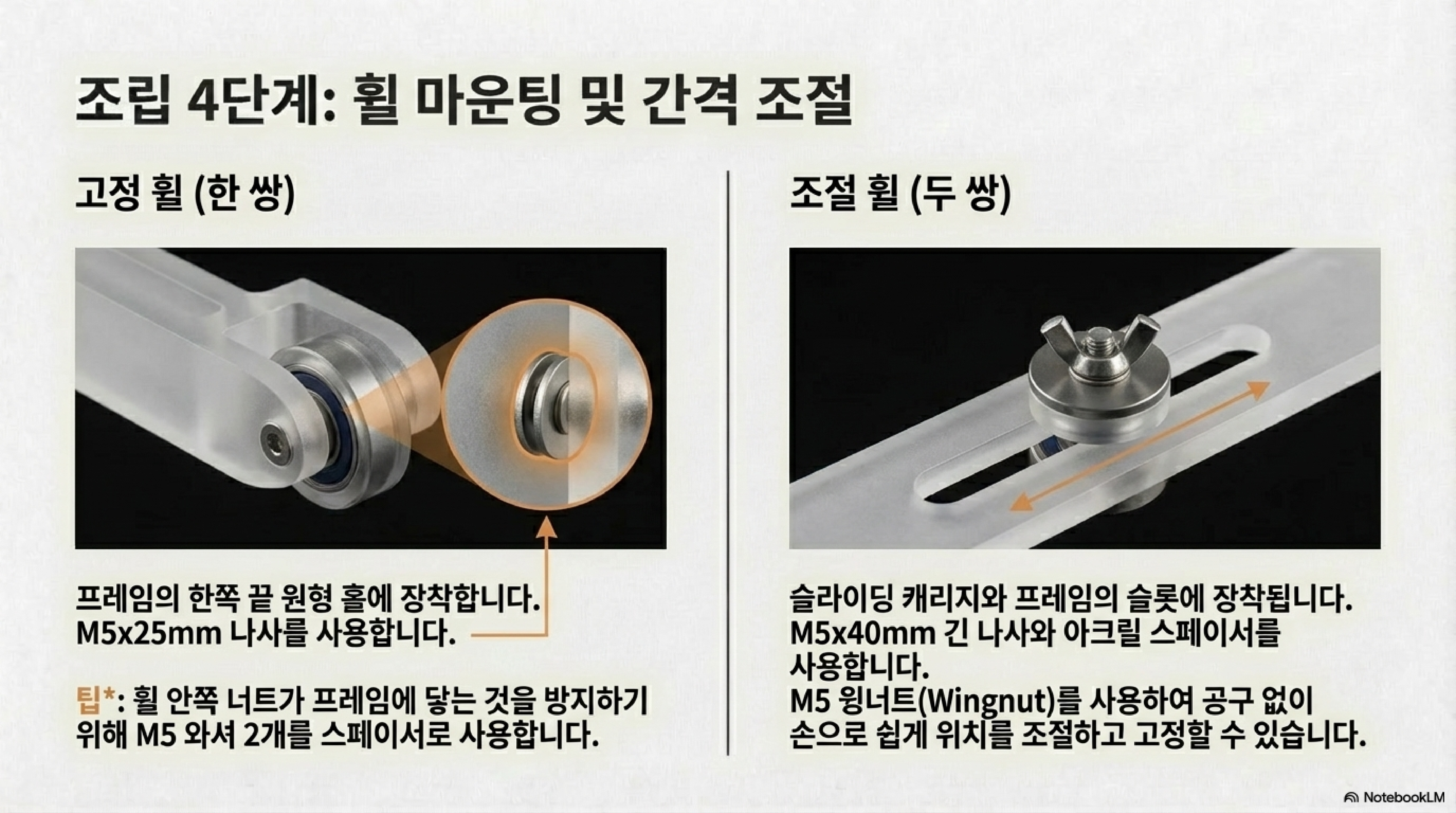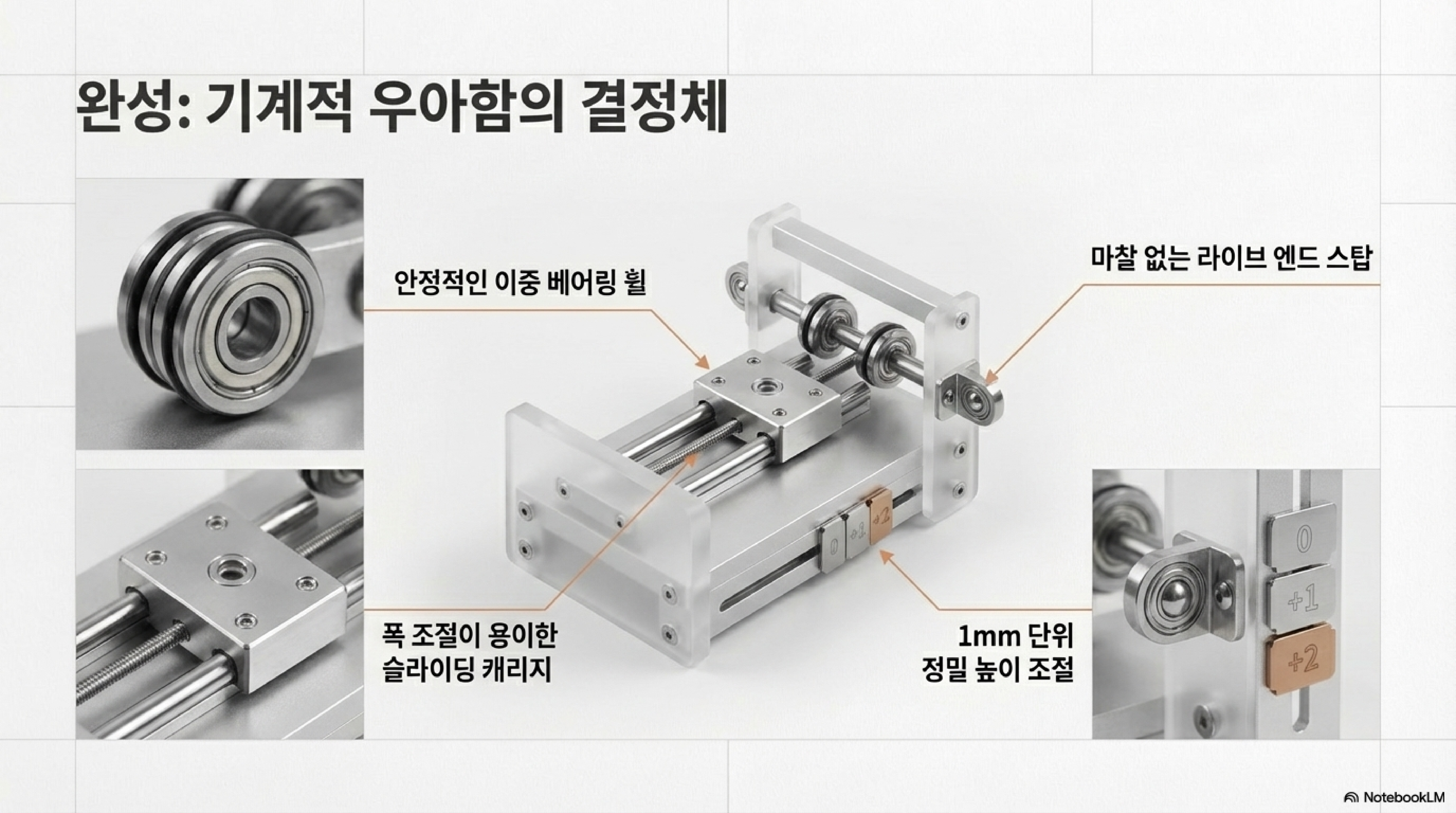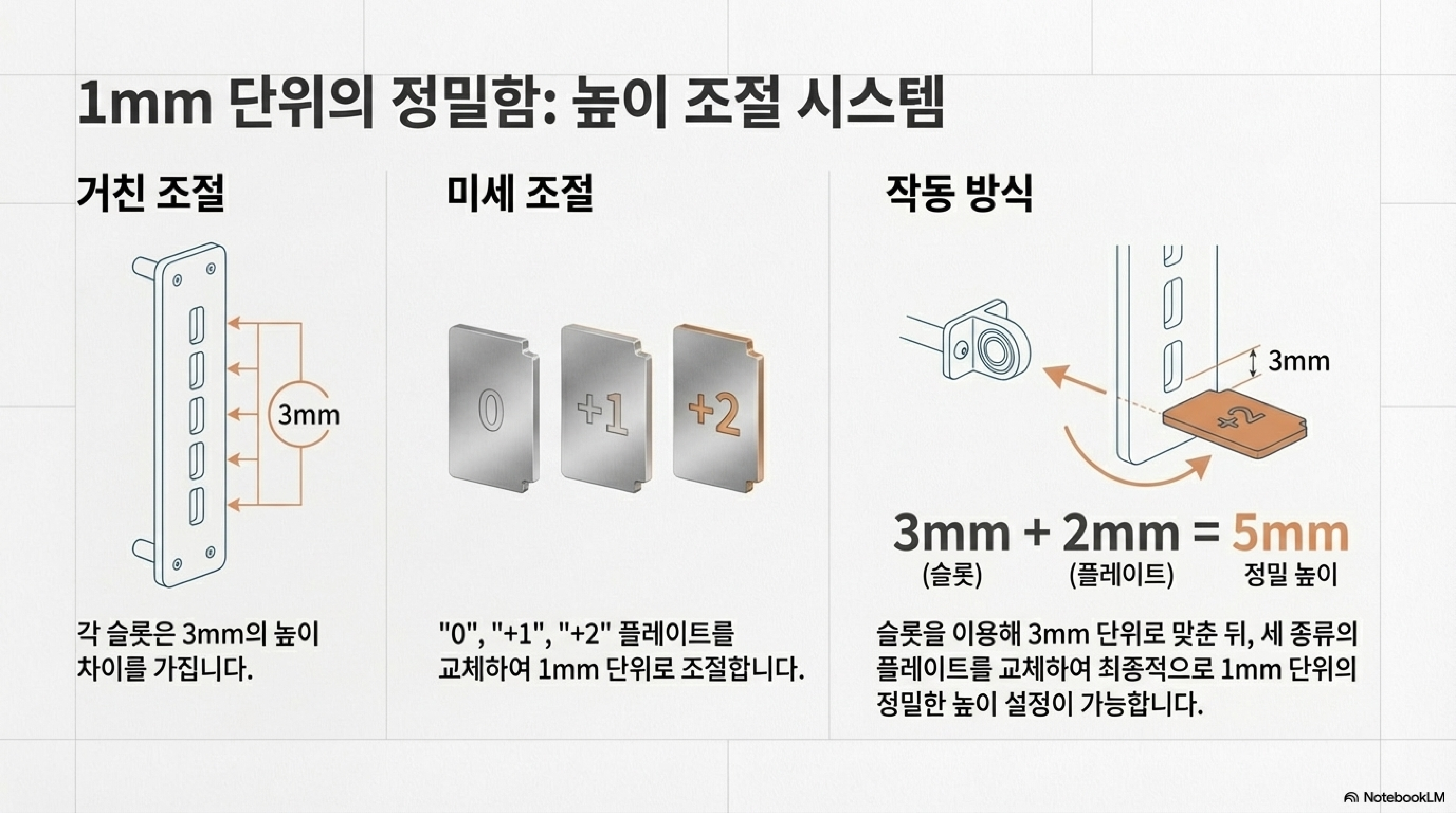 또한 높이 조절 시스템의 세심함도 돋보입니다. 3mm 간격의 슬롯과 함께 0, +1, +2로 표시된 세 종류의 심(shim) 플레이트를 제공합니다. 이들을 조합하면 1mm 단위의 정밀한 높이 조절이 가능해져, 다양한 크기의 물체를 완벽하게 수평으로 맞출 수 있습니다. 이런 디테일이 바로 이 프로젝트의 완성도를 높이는 핵심입니다.
