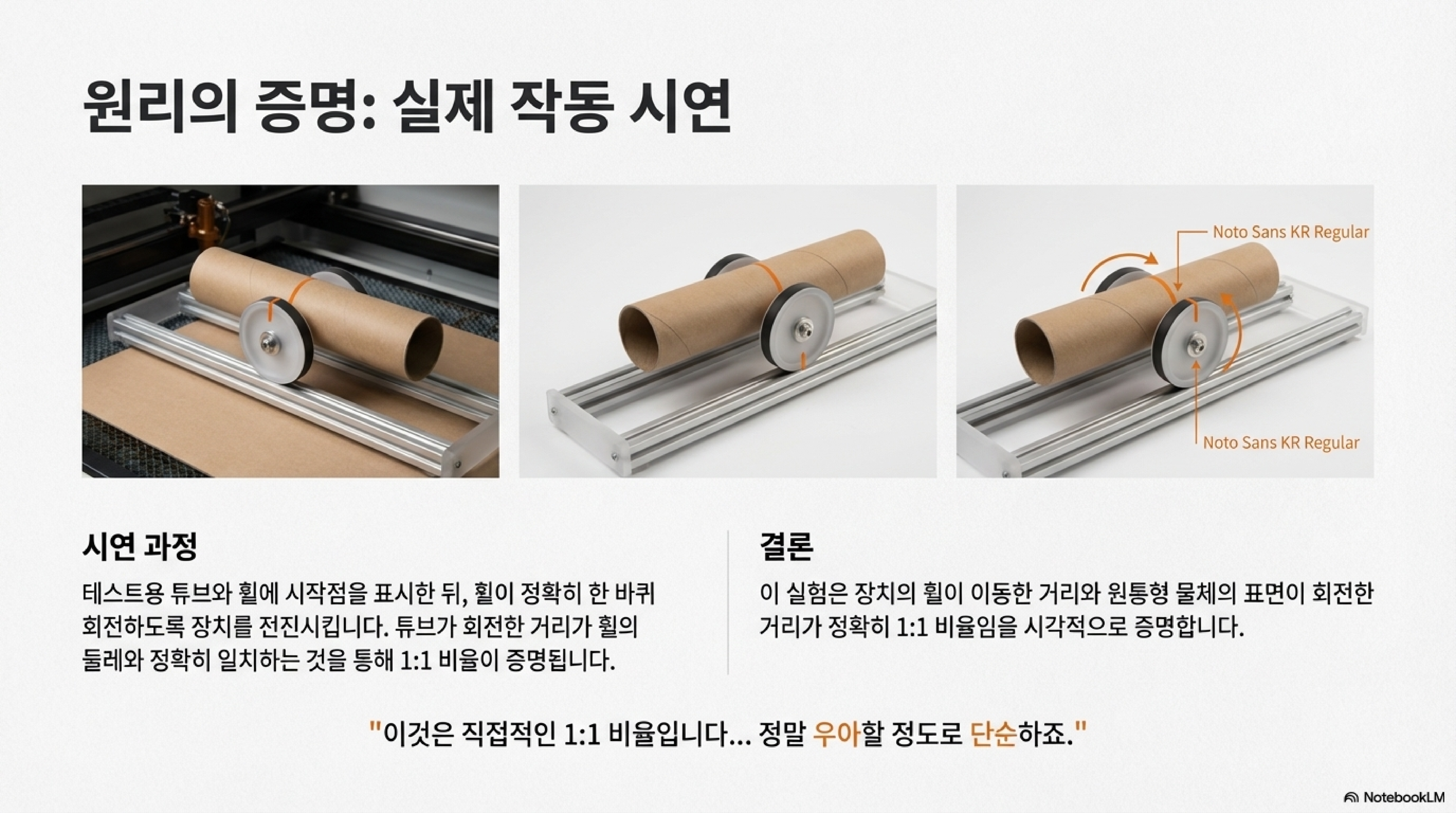 Russ는 이 원리를 간단하지만 강력한 시연으로 증명합니다. 그는 골판지 튜브에 표시를 하고, 그 표시를 바퀴의 나사 하나와 정렬시킵니다. 그런 다음 캐리지를 앞으로 굴려 바퀴가 정확히 한 바퀴 회전하도록 합니다. 놀랍게도 튜브 역시 정확히 회전하여 미리 표시해 둔 두 번째 지점과 완벽하게 일치합니다. 이 간단한 실험은 직선 운동이 어떻게 완벽한 1:1 비율로 회전 운동으로 변환되는지를 명확하게 보여줍니다.