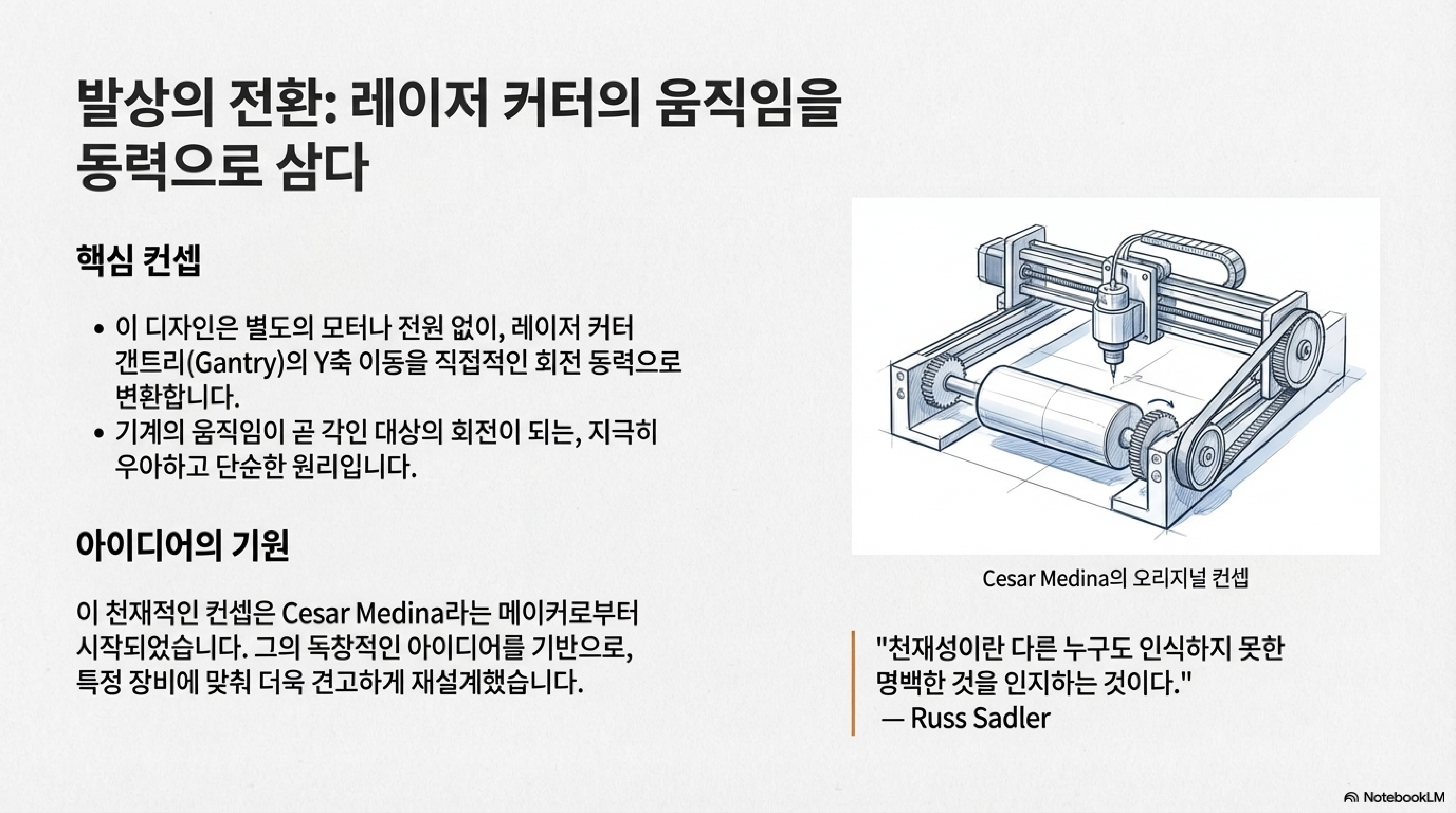 이 디자인의 가장 반직관적이면서도 뛰어난 점은 바로 모터가 없는 회전 조각기라는 사실입니다. Russ Sadler조차 이 아이디어를 처음 접했을 때 "‘훌륭하다’는 말로는 부족하다"고 표현하며, "솔직히 내가 먼저 발견했더라면 하고 부러워했다"고 말할 정도였죠.