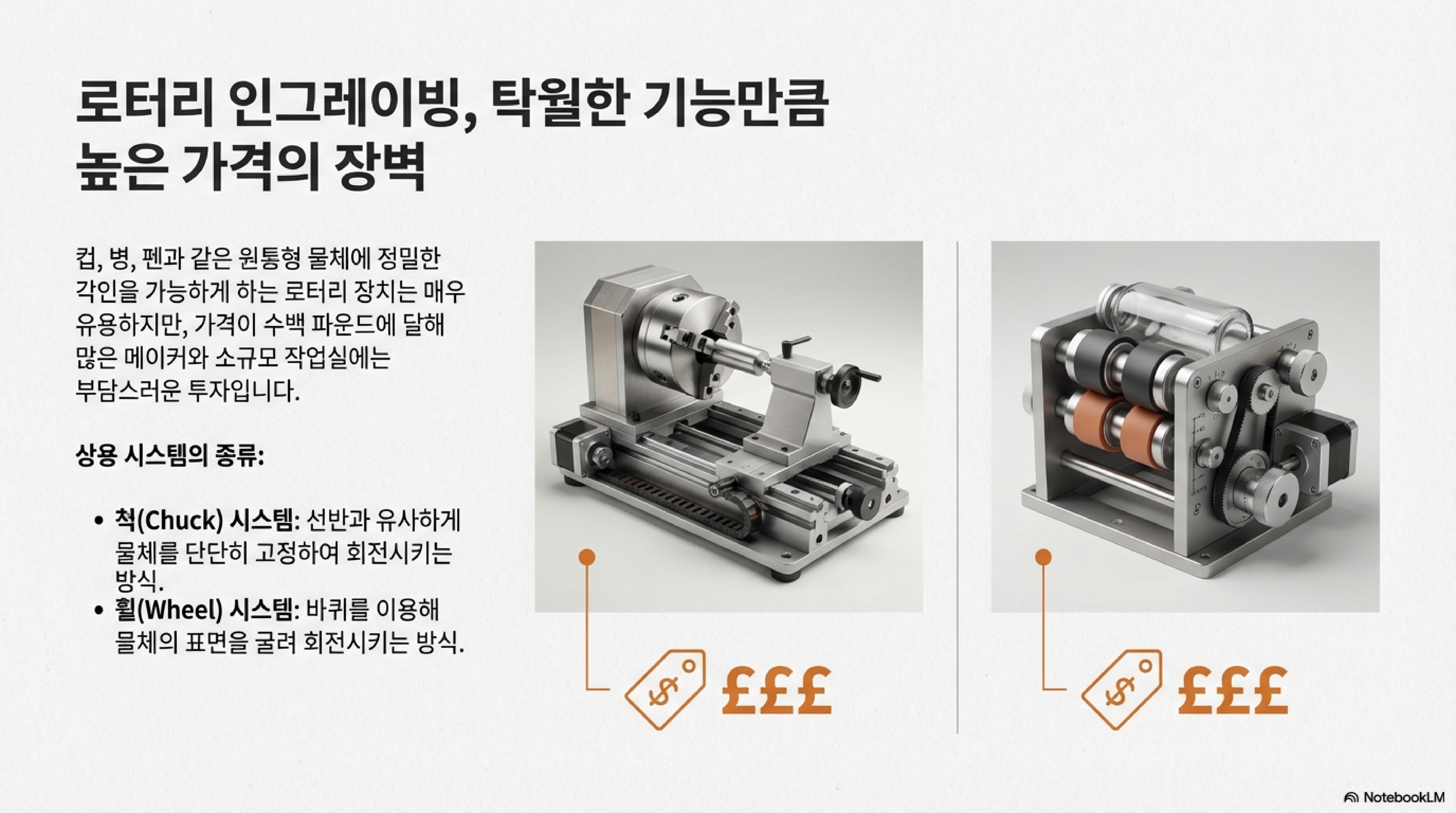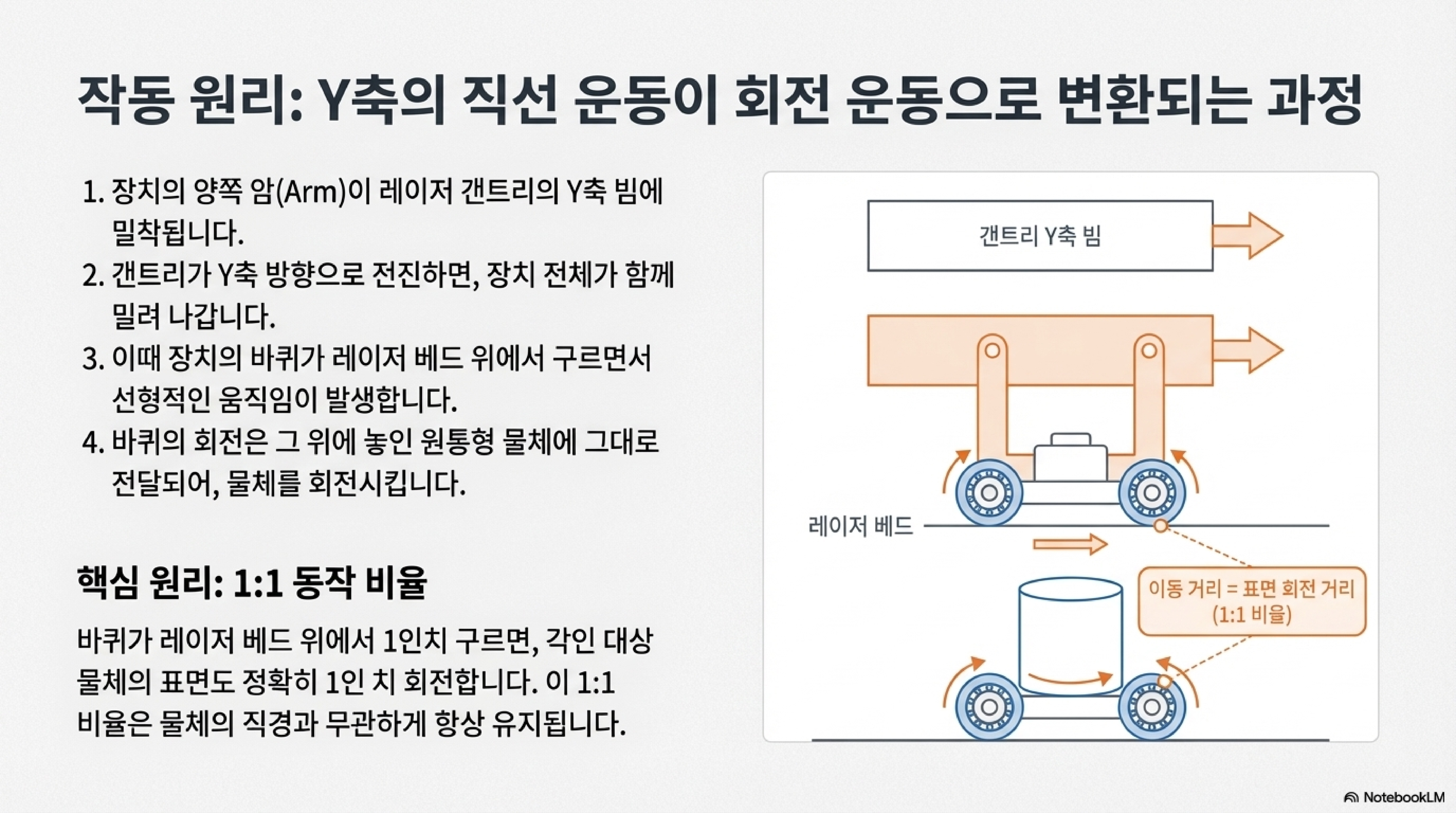 이 단순한 디자인이 왜 그토록 효과적일까요? 그 비밀은 바로 "원주 구동(circumferential drive)" 원리에 있습니다. 이는 기계 테이블에서 캐리지가 이동한 직선 거리가, 조각되는 물체 표면의 원주 거리로 오차 없이 완벽하게 동일하게 변환된다는 것을 의미합니다.