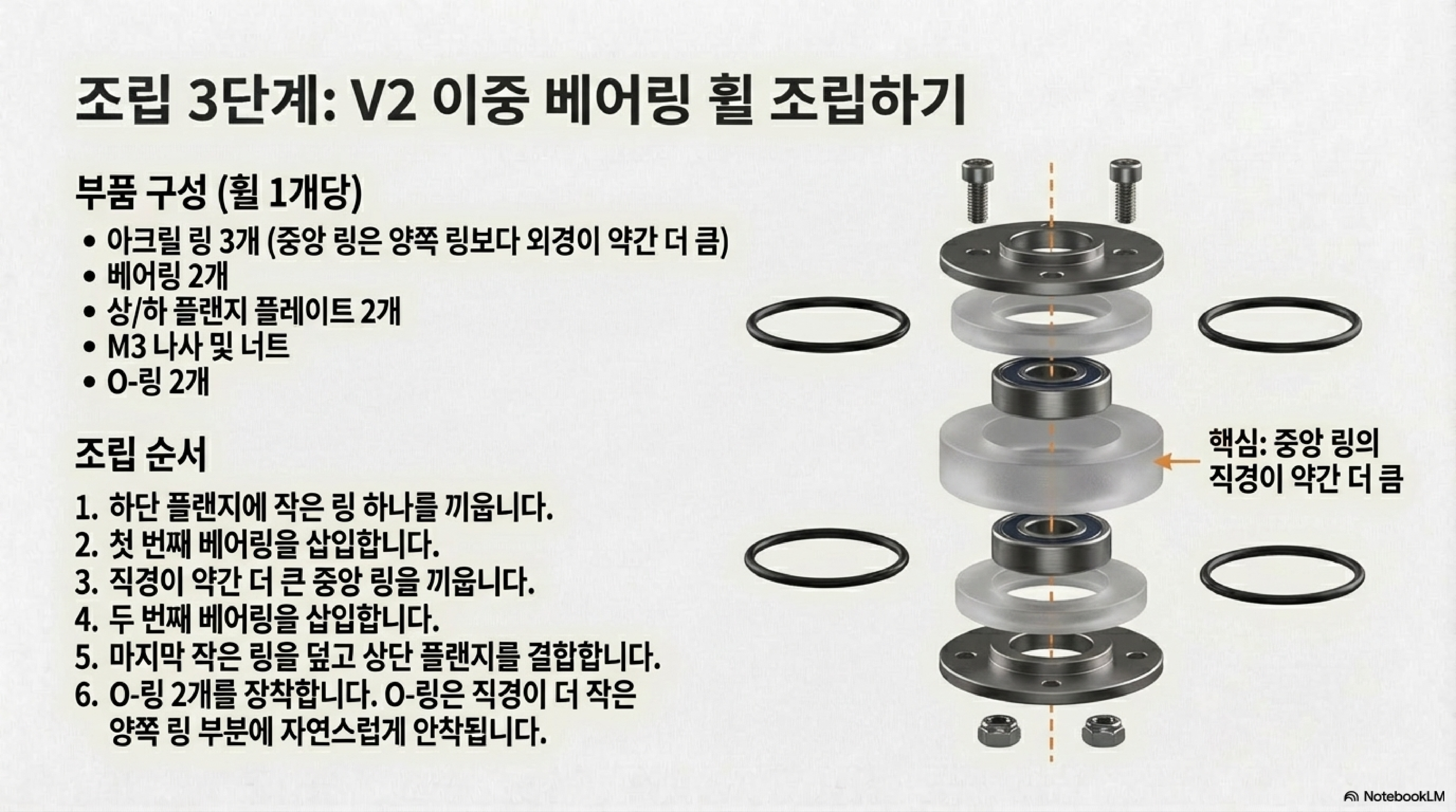 그의 해결책은 단순히 베어링을 하나 더 추가하는 것 이상이었습니다. 그는 바퀴를 재설계하여 두 개의 베어링을 함께 쌓고, 그 사이에 있던 4mm 두께의 스페이서 대신 3mm 두께의 스페이서 3개를 끼워 넣었습니다. 그는 "3mm 아크릴 3장이면 두 베어링의 두께인 10mm와 거의 같아진다"고 설명합니다. 이처럼 가용 재료를 활용한 실용적인 수정 덕분에 안정성이 극적으로 향상되었고 흔들림은 완전히 사라졌습니다. 이는 모든 메이커에게 중요한 교훈입니다. 최고의 콘셉트라도 현실적인 테스트와 반복적인 개선 과정을 거쳐야만 완성될 수 있다는 것입니다.