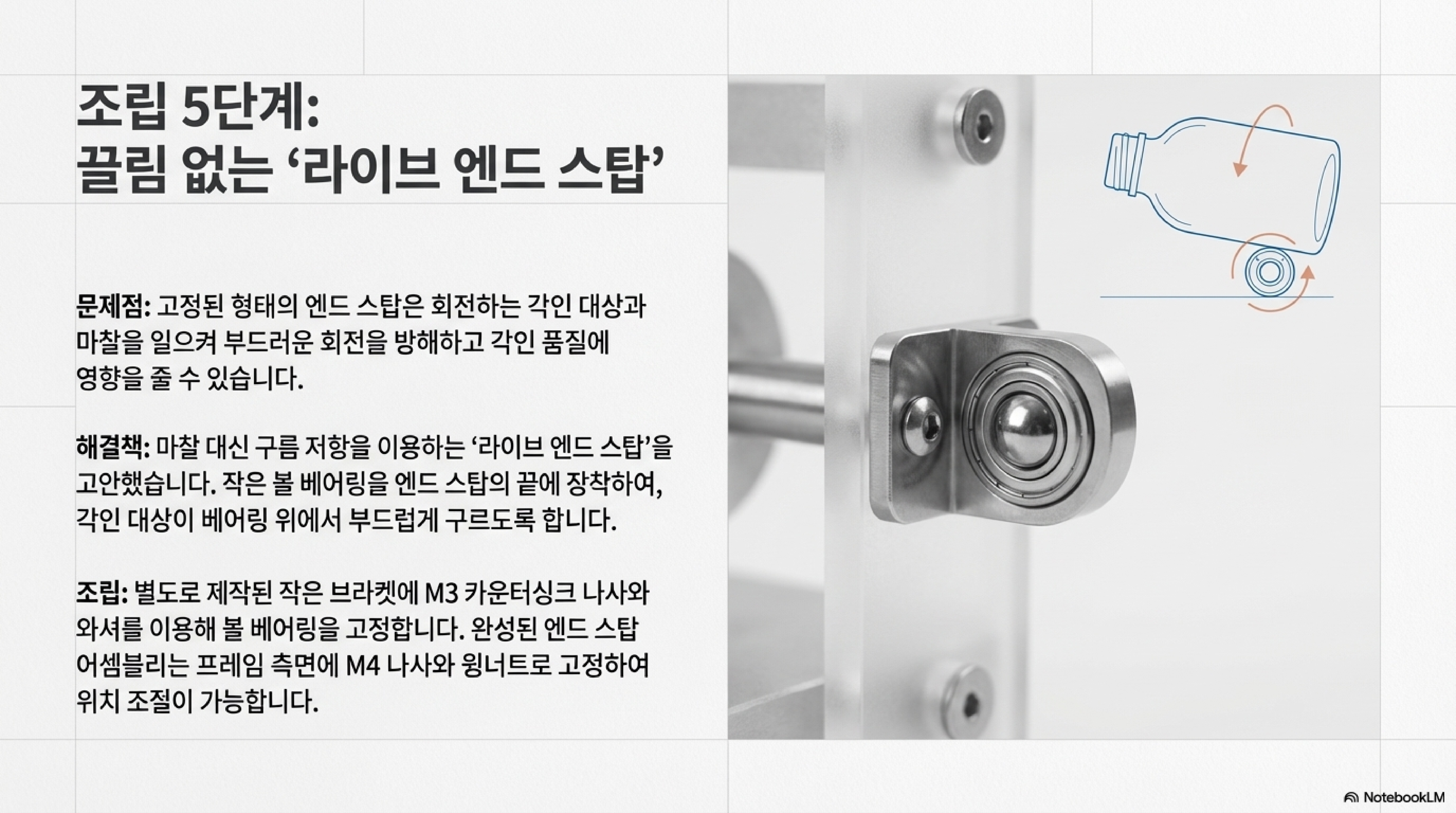 해결책은 접촉점으로 자유롭게 회전하는 작은 볼 베어링을 사용하는 것이었습니다. 이 "살아있는" 스토퍼는 카운터싱크 나사와 m3 와셔로 고정되어, 물체 끝에서 함께 구르며 마찰 없이 지지대 역할을 합니다.