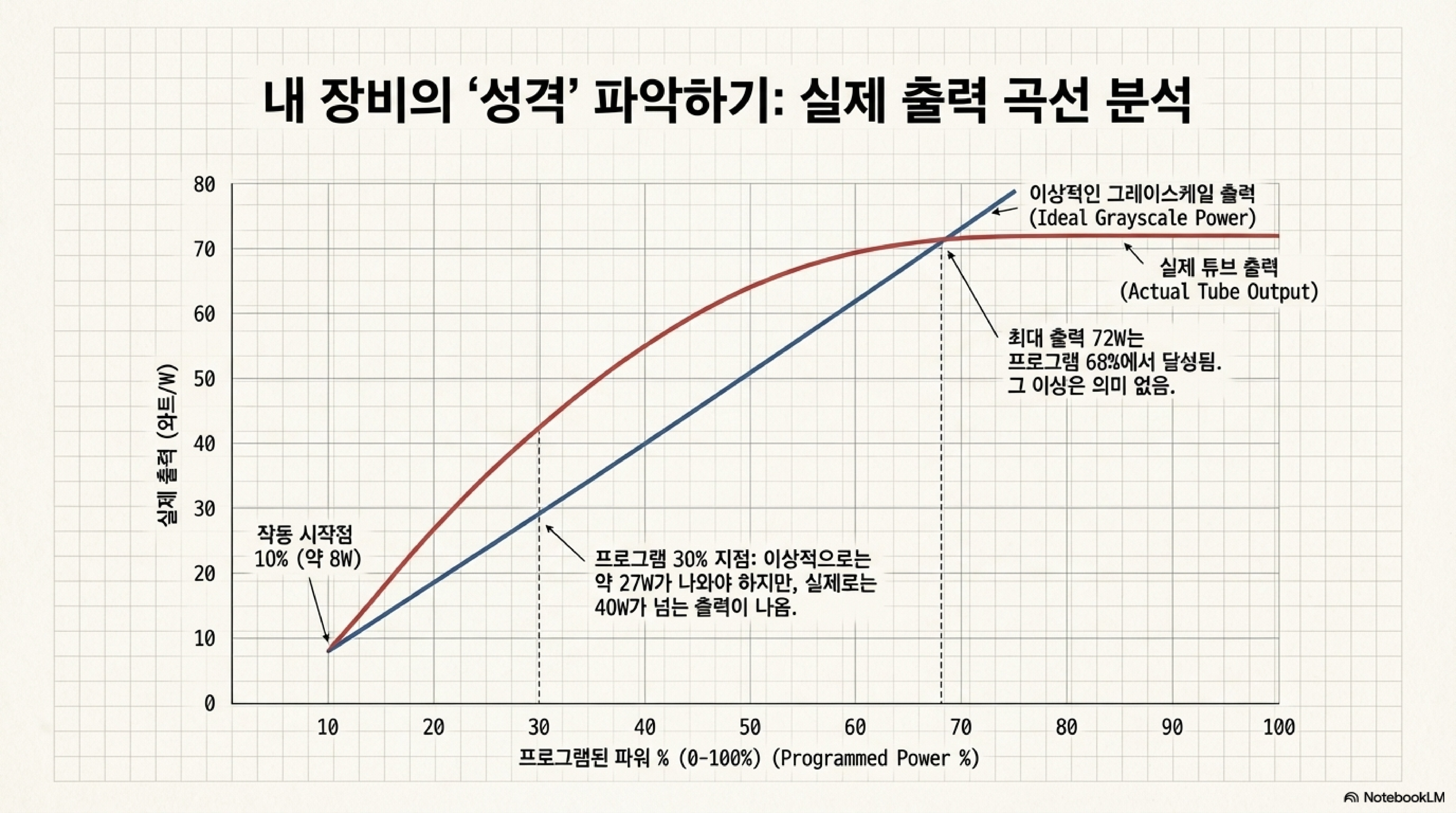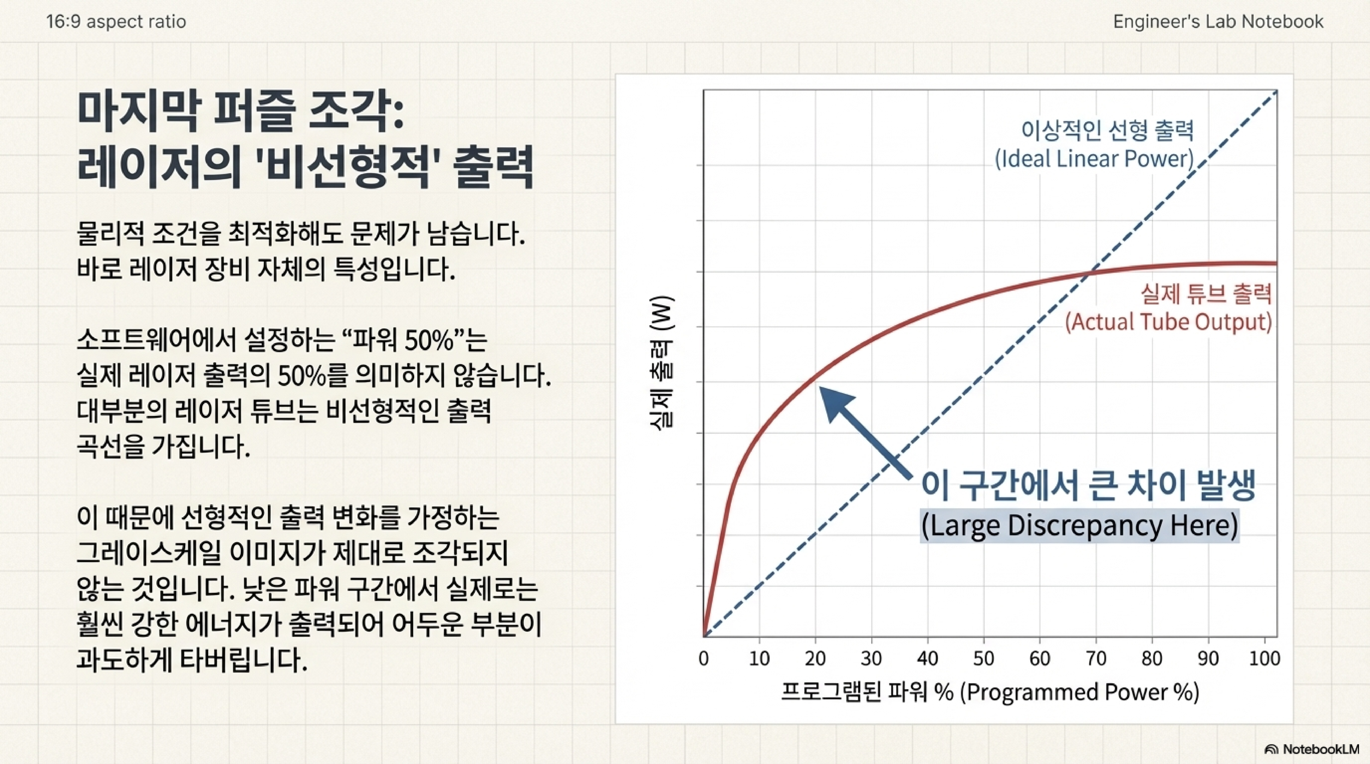 대부분의 사용자가 모르는 충격적인 사실이 있습니다. 당신이 소프트웨어에서 설정하는 레이저 출력 50%는 실제 최대 출력의 50%가 아니라는 점입니다. 레이저 튜브의 실제 출력(W)은 제어 신호(%)와 정비례하지 않는 '비선형성(non-linearity)' 문제를 가지고 있습니다.