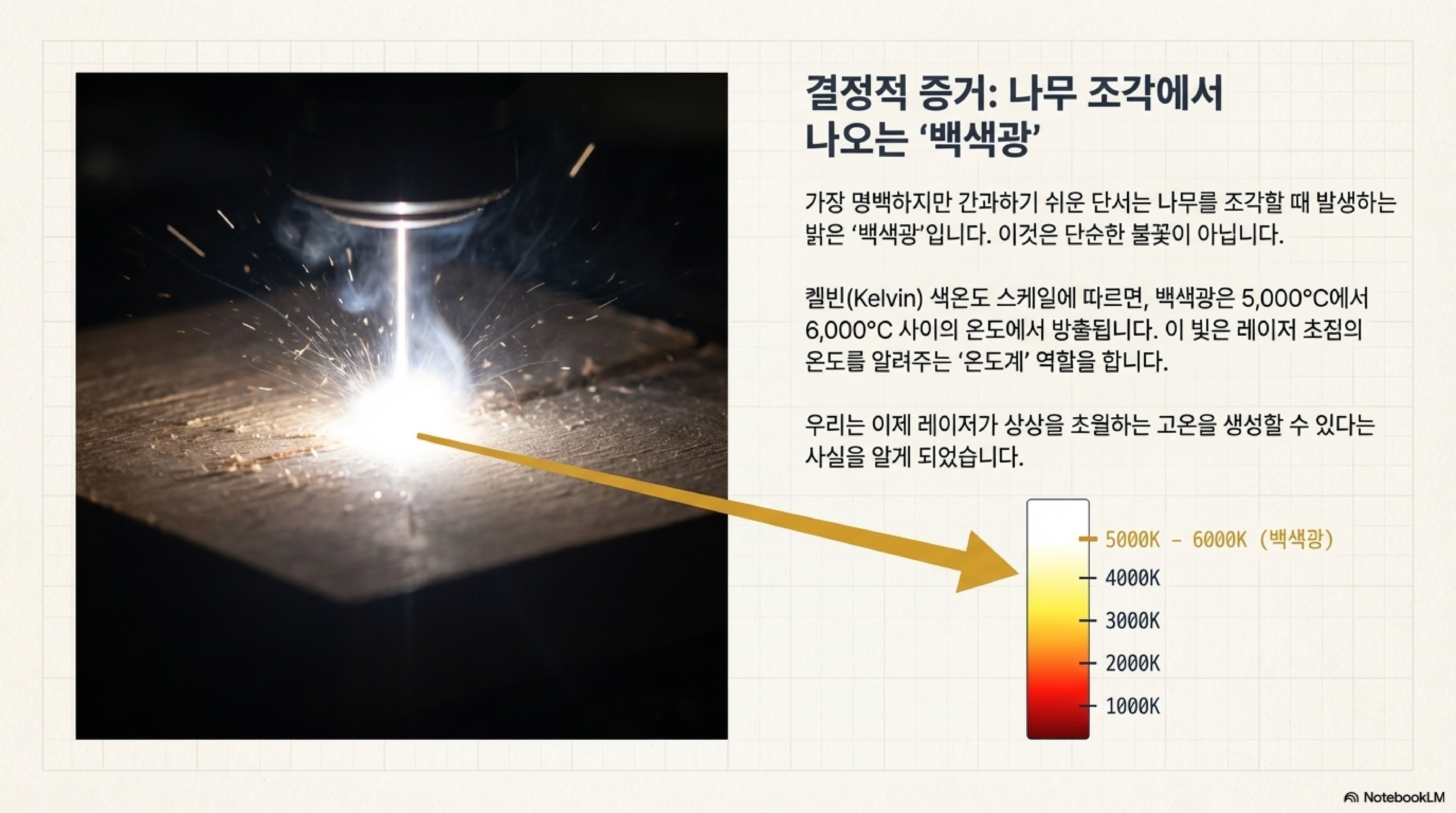 우리가 흔히 보는 그 눈부신 '흰색 불꽃'. 켈빈 온도 스케일에 따르면, 물체가 내는 빛의 색은 그 물체의 온도를 나타냅니다. 그리고 그 흰색 빛은 놀랍게도 약 5,000°C에서 6,000°C 사이의 초고온에서만 발생할 수 있는 현상입니다. 당신의 작업대 위에서 태양 표면 온도에 버금가는 일이 벌어지고 있었던 것입니다.