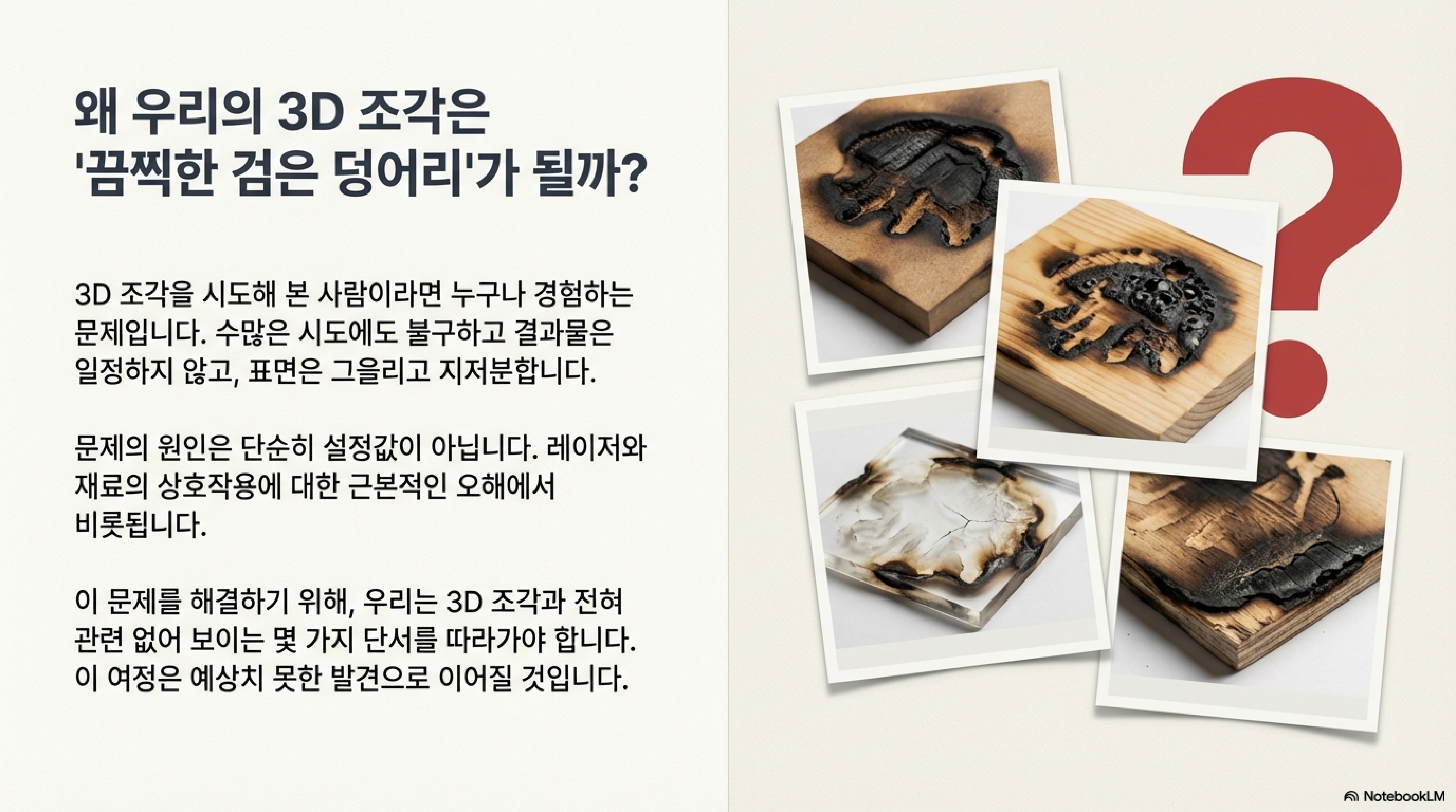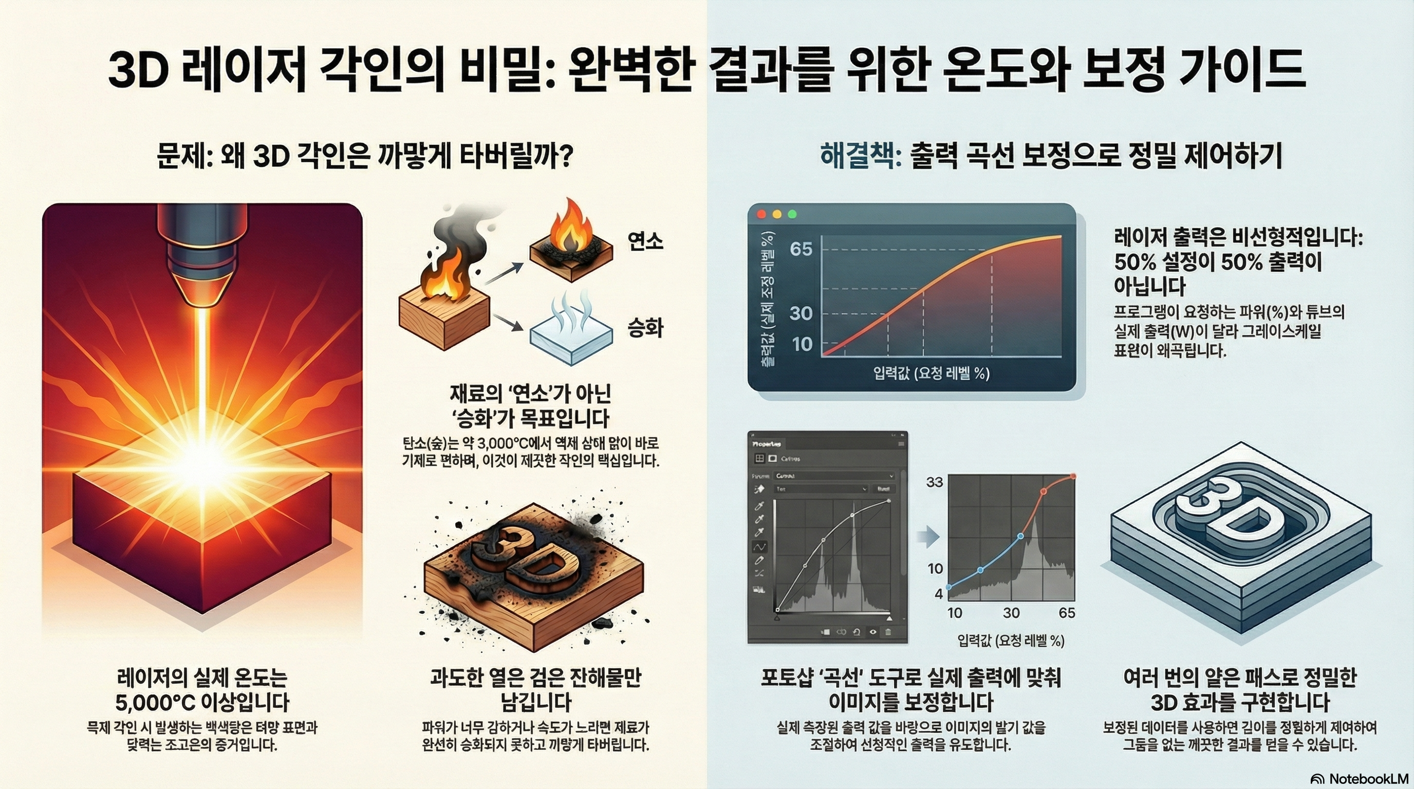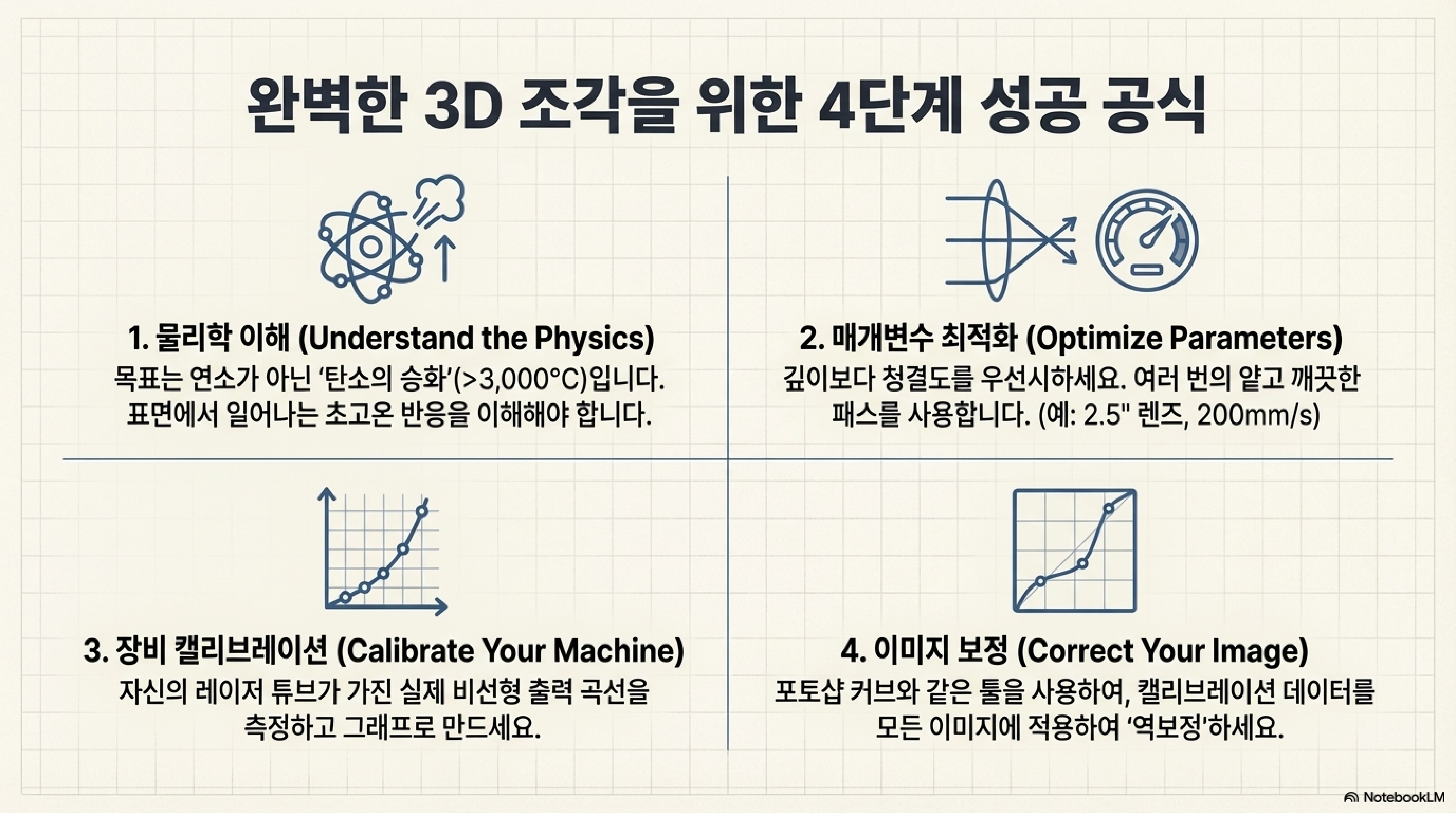 지금까지 우리는 3D 각인 실패의 이면에 숨겨진 놀라운 진실들을 추적해왔습니다. 레이저는 단순한 열이 아닌 '빛'이며, 그 끝에서는 태양 표면과 맞먹는 '초고온'이 발생합니다. 재료는 타는 것이 아니라 '승화'하며, 기계의 출력 설정은 종종 우리를 속이는 '비선형성'을 가집니다. 그리고 우리는 이 모든 한계를 '소프트웨어 보정'을 통해 극복할 수 있습니다.