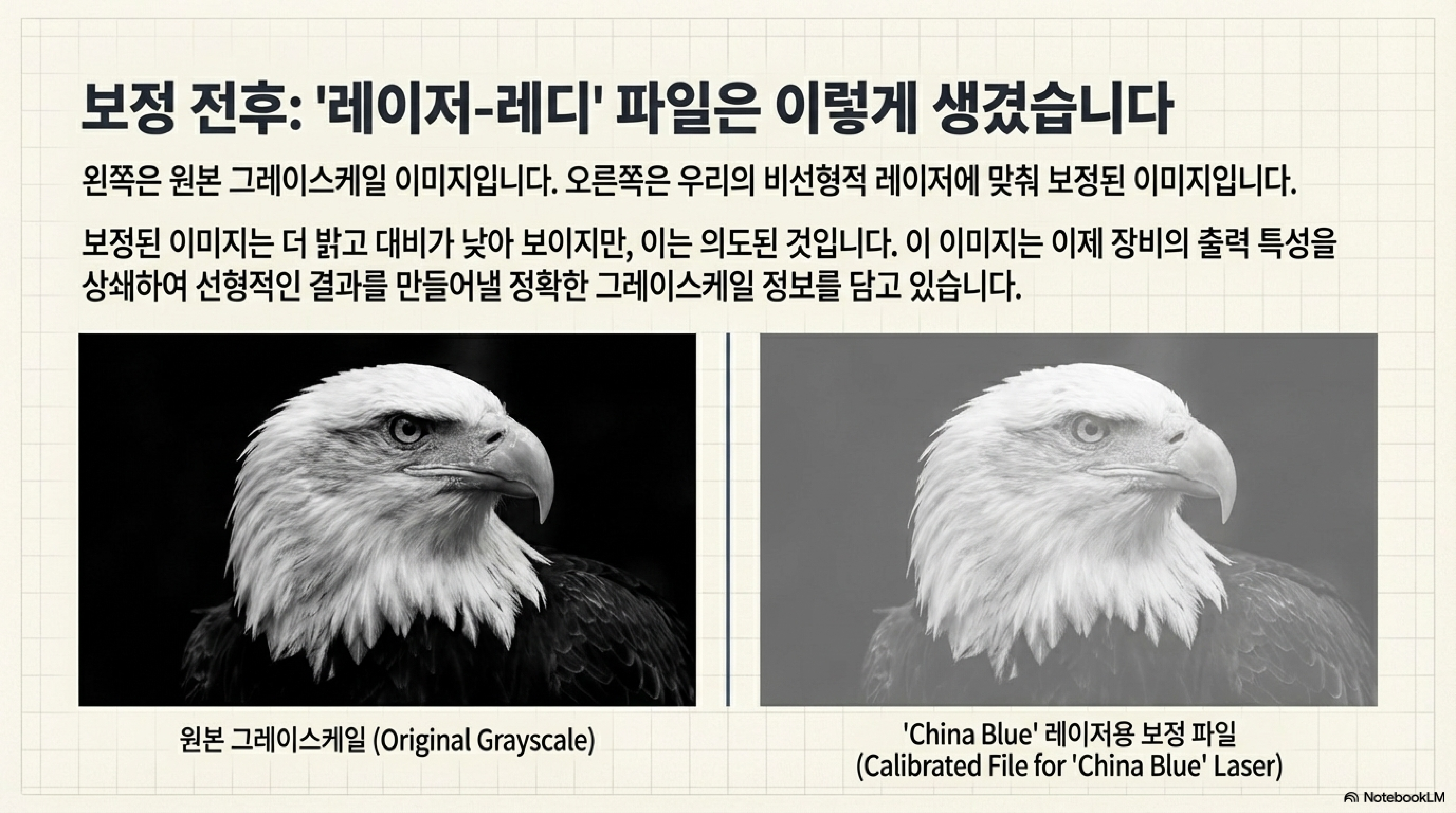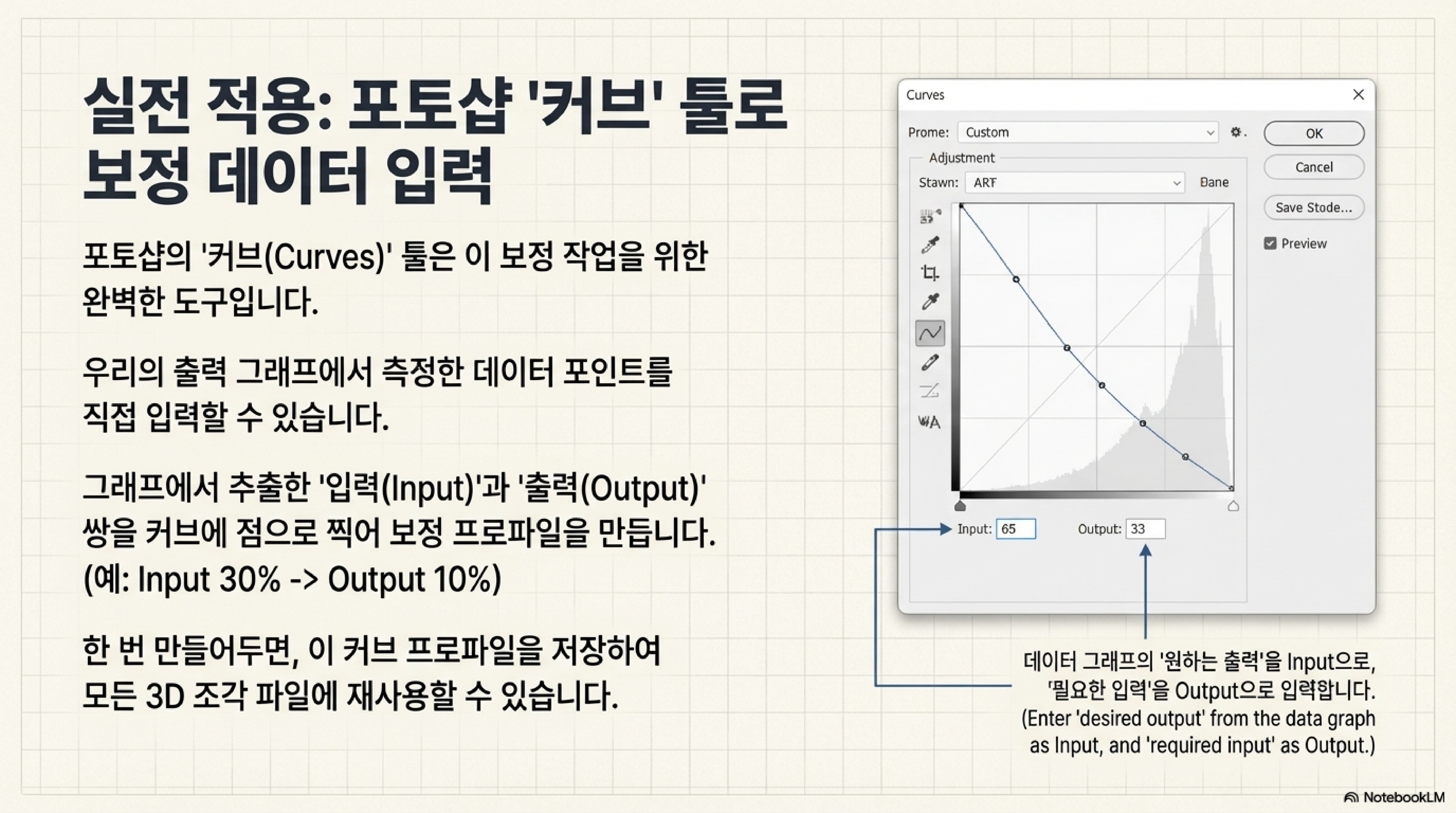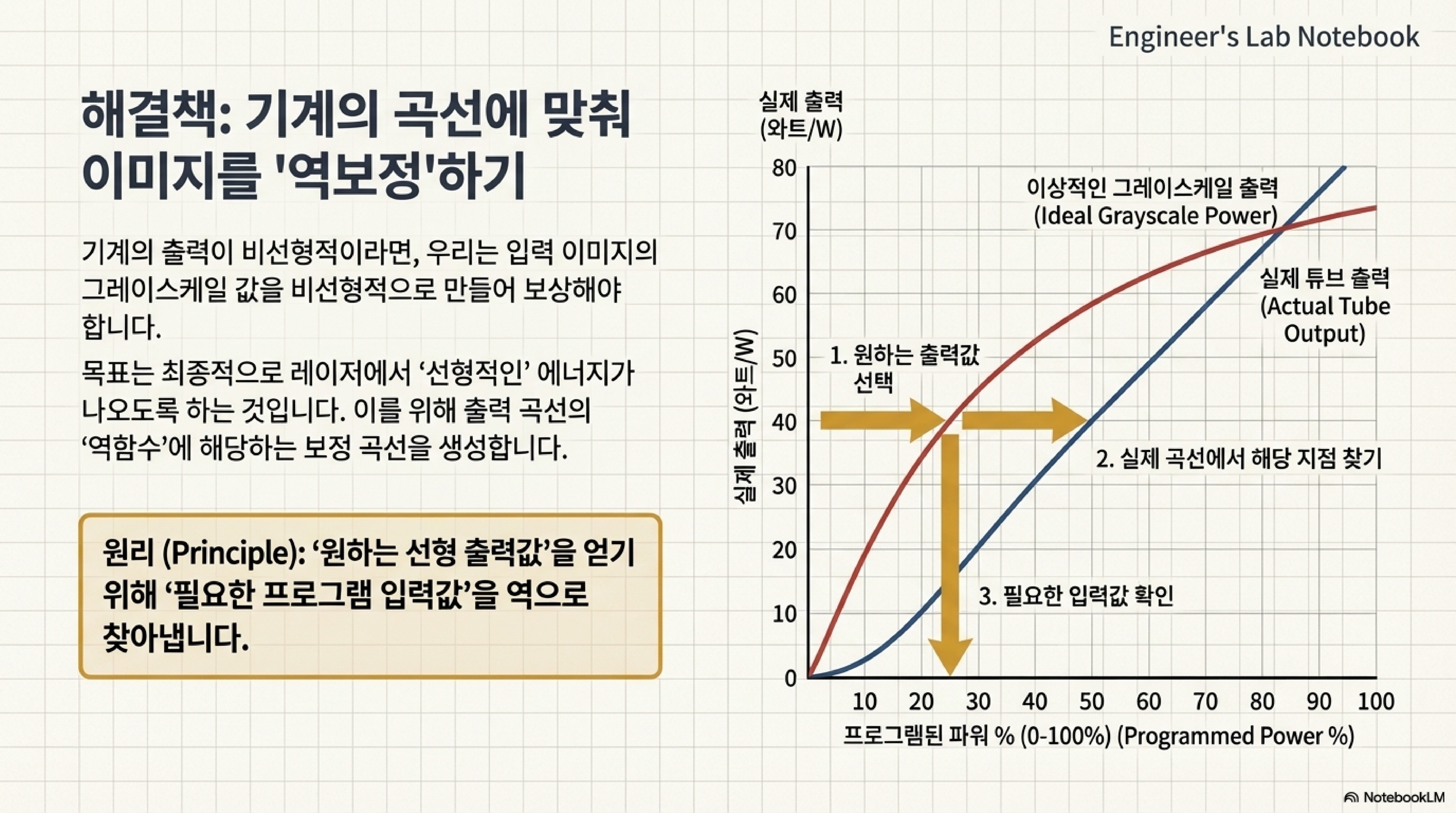 하드웨어의 물리적 한계인 '비선형성' 문제는 어떻게 해결할 수 있을까요? 해답은 놀랍게도 기계가 아닌 소프트웨어에 있었습니다. 기계의 실제 출력 곡선을 측정한 데이터를 바탕으로, 포토샵을 사용해 원본 이미지를 의도적으로 '왜곡'시켜 기계의 거짓말을 바로잡는 것입니다.