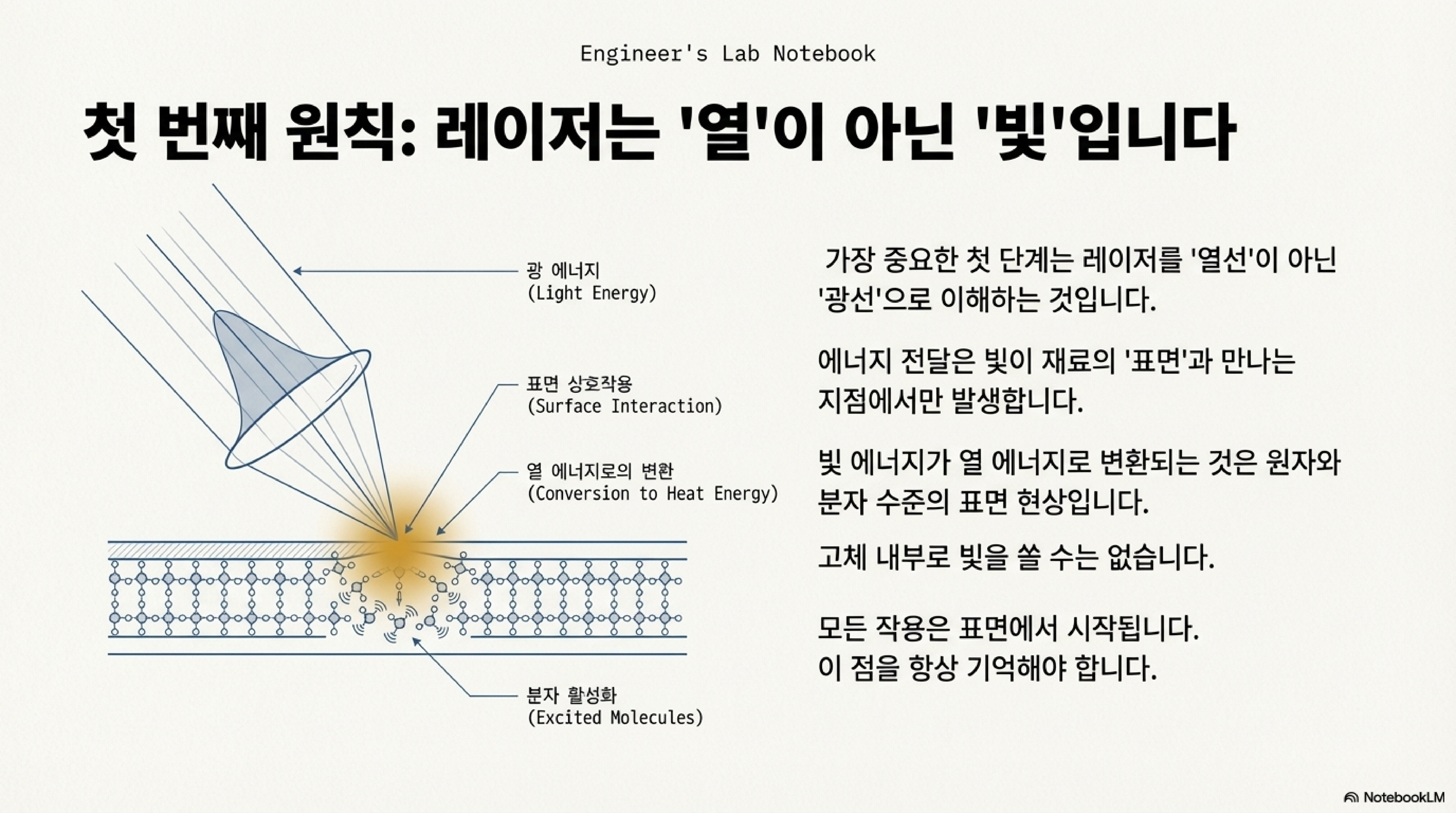 탐구의 시작은 가장 근본적인 오해를 바로잡는 것이었습니다. 우리는 흔히 레이저 빔을 '열의 흐름'으로 생각하지만, 사실 이것은 극도로 집중된 '빛에너지'의 한 형태입니다. 에너지가 빛에서 열로 바뀌는 극적인 변환은, 레이저 빔이 재료의 아주 얇은 '표면'에 닿는 바로 그 찰나의 순간에만 일어납니다.