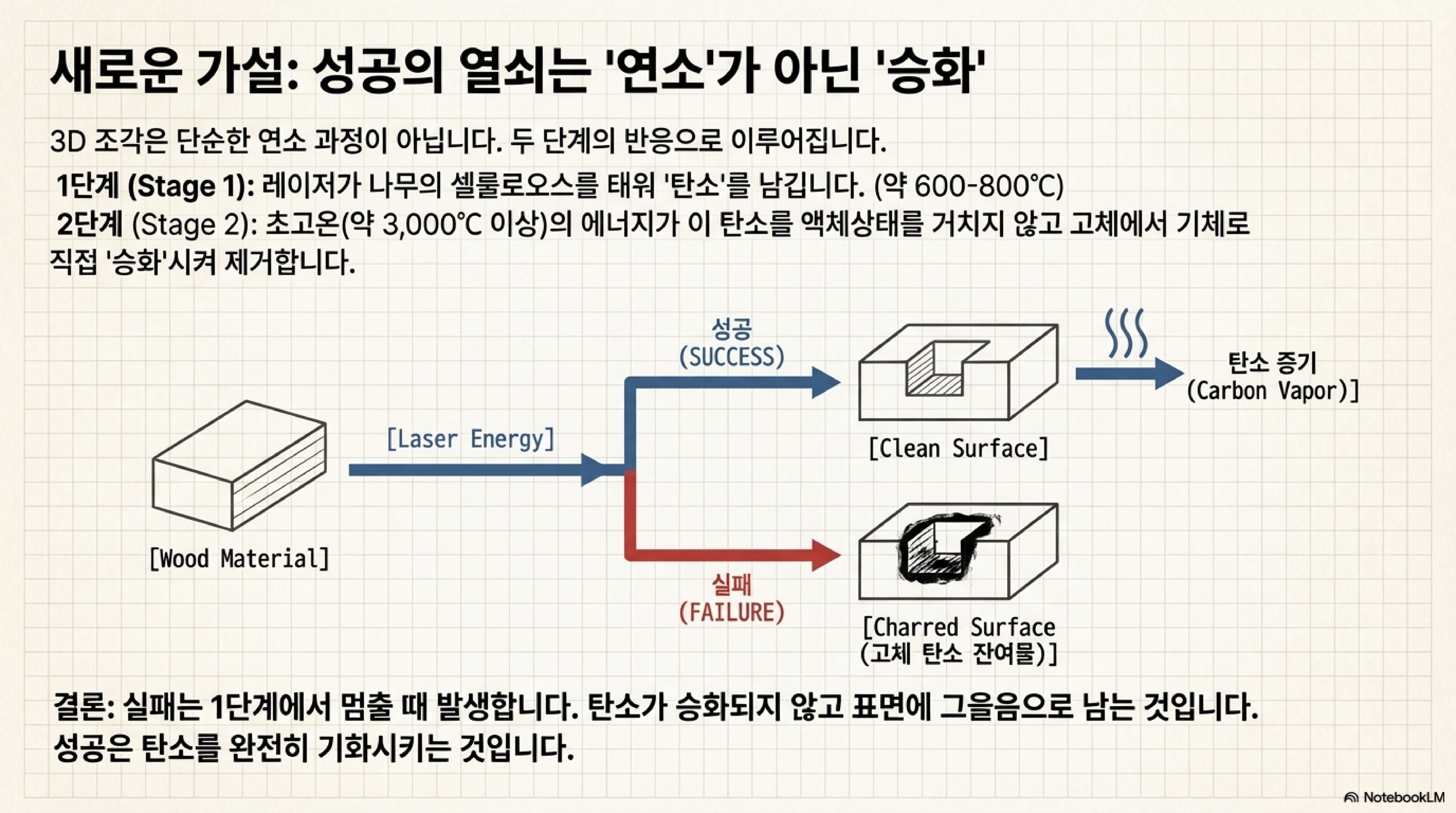 레이저가 나무를 '태운다'고 생각하기 쉽지만, 6,000°C라는 온도는 단순한 연소(burning) 이상의 현상을 암시합니다. 실제 과정은 훨씬 더 역동적인 두 단계로 이루어집니다.