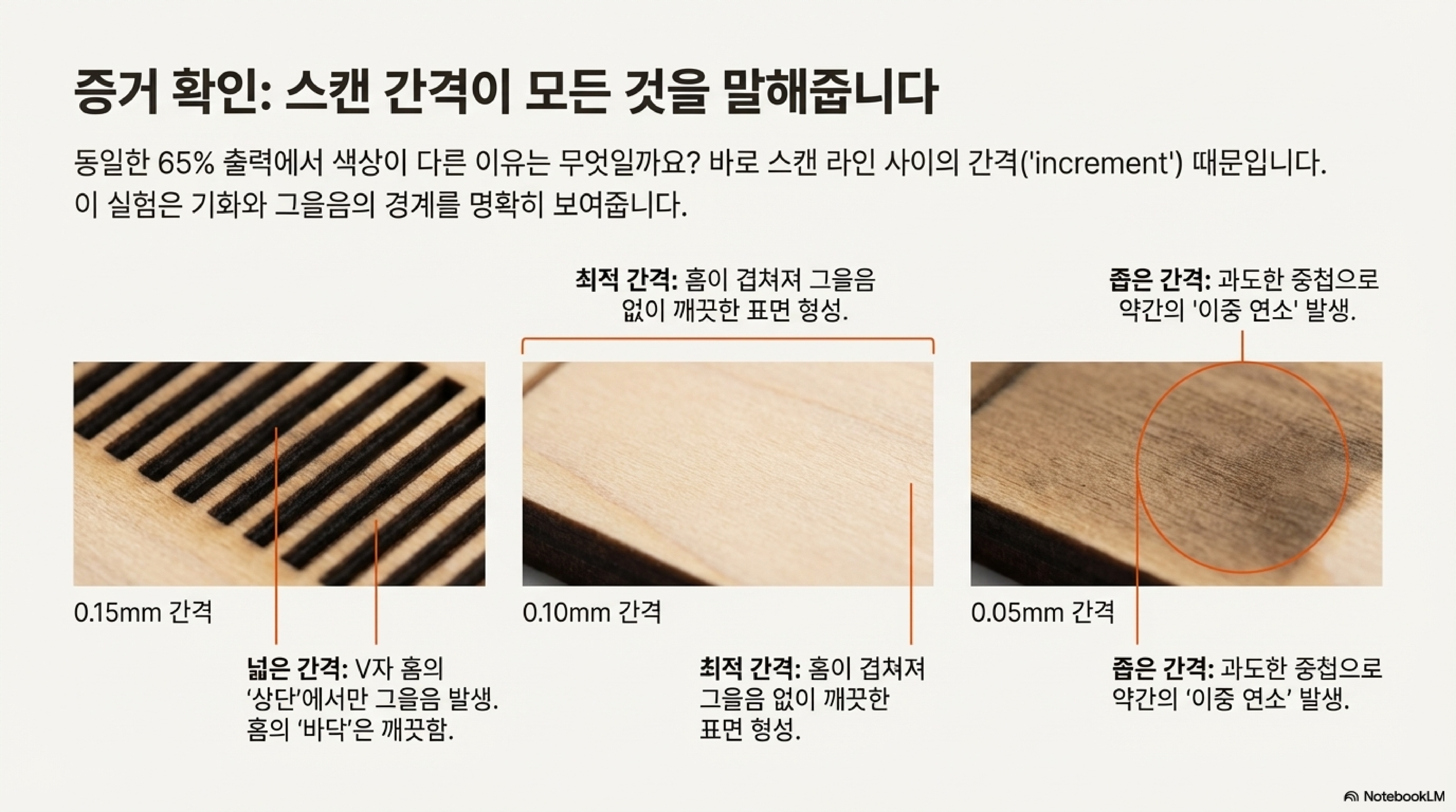 따라서 증분 값을 줄여 레이저 경로를 더 촘촘하게 만들면, 다음 경로의 레이저가 이전 경로에서 생성된 그을린 윗부분을 효과적으로 깎아냅니다. 그 결과 훨씬 더 깨끗하고 밝은 색상의 표면이 드러나며, 이는 그을음 아래의 재료가 실제로는 타지 않았다는 증거가 됩니다.